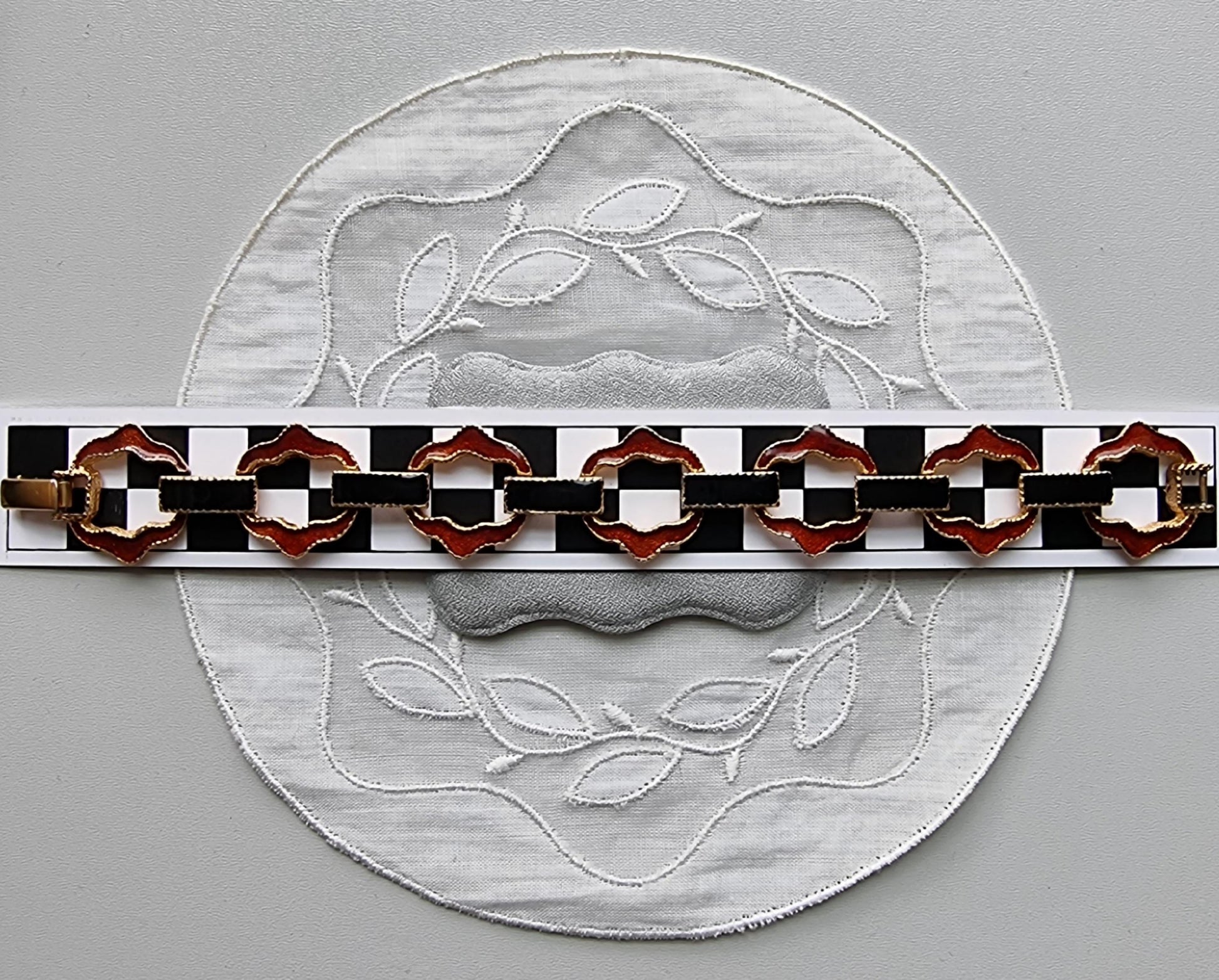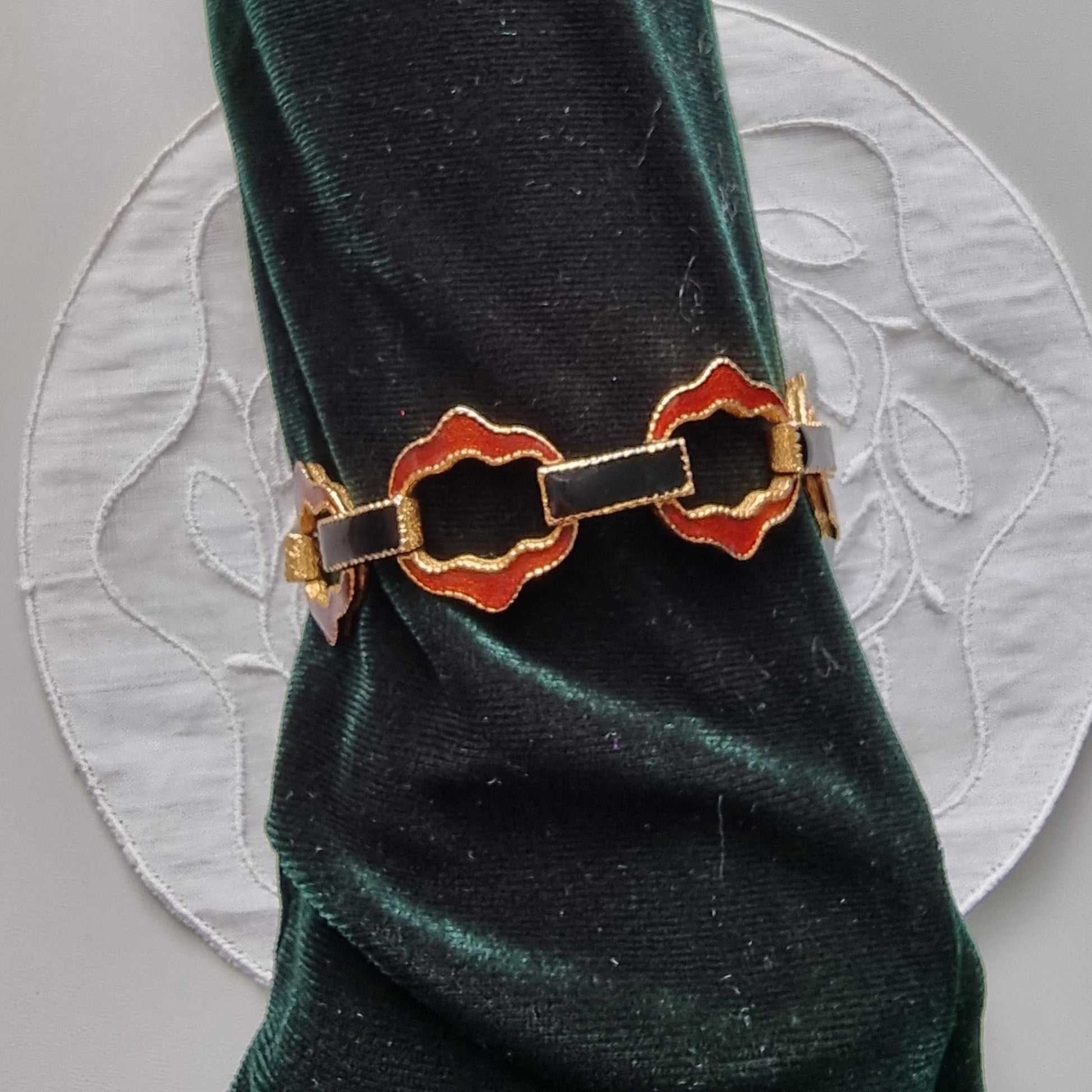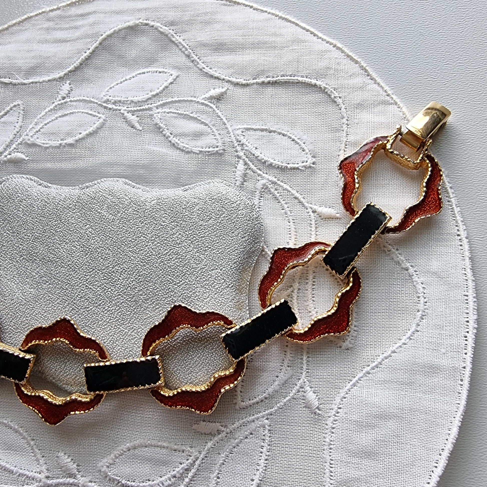 A gorgeous enamel chain link bracelet by Avon with red and black enamel on gold plated metal