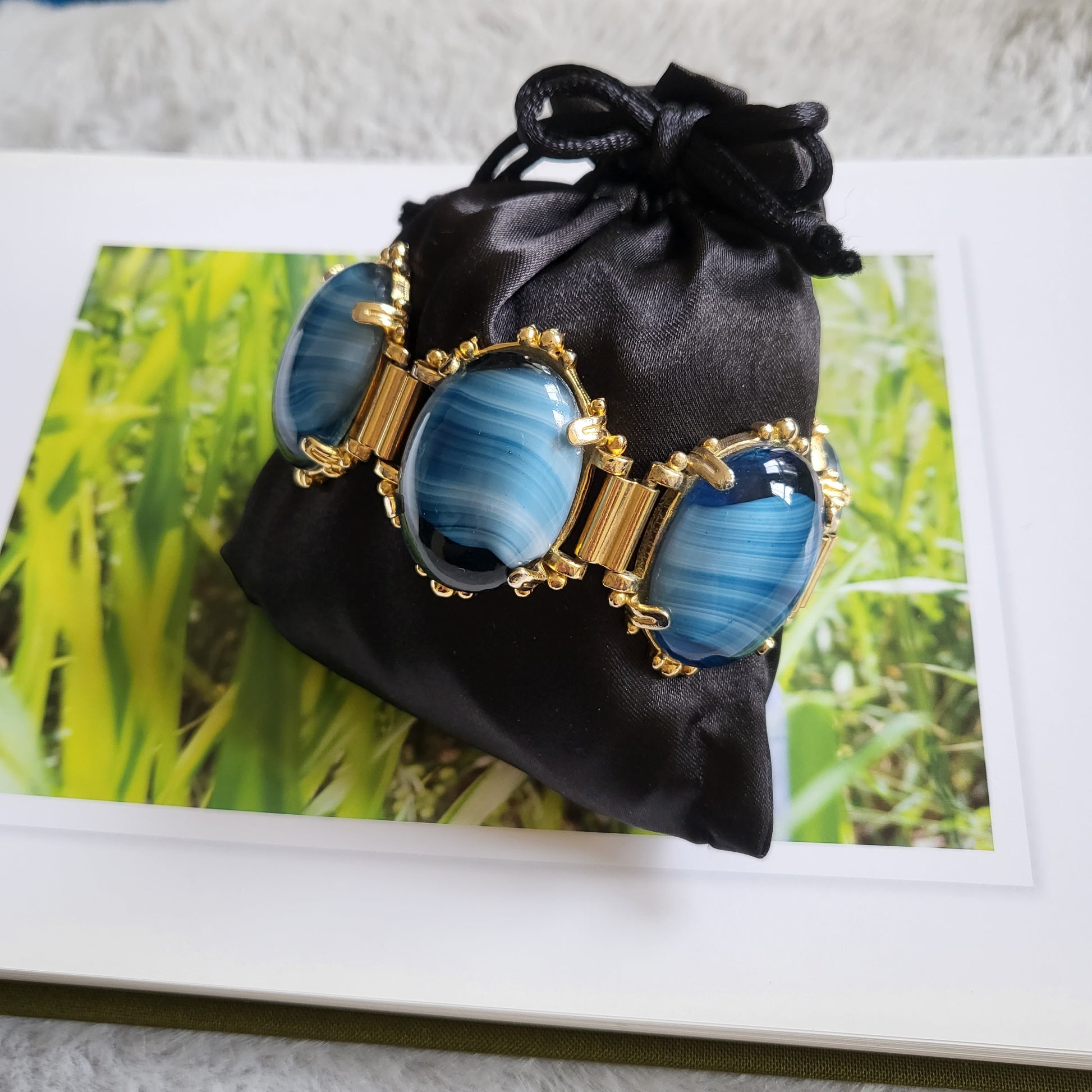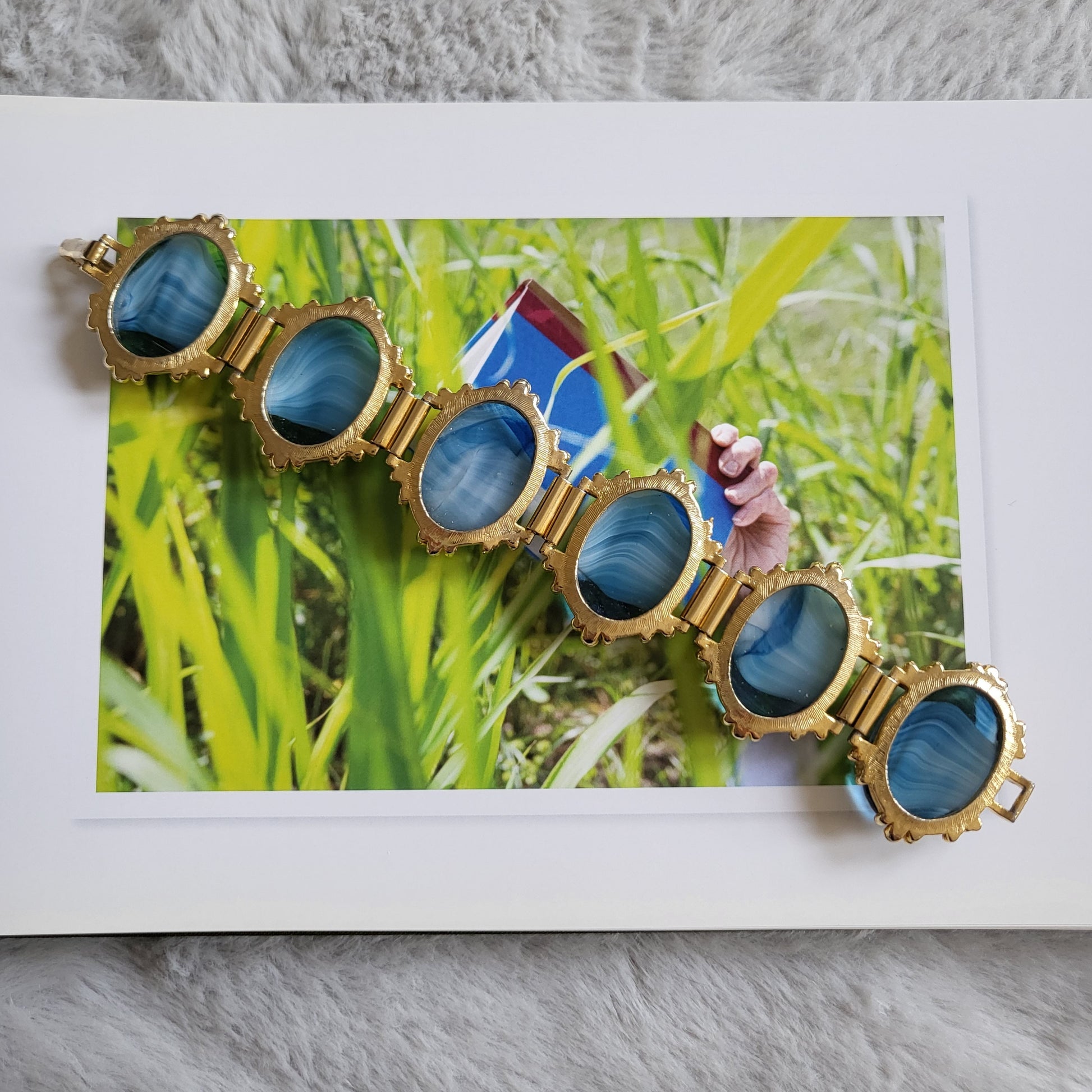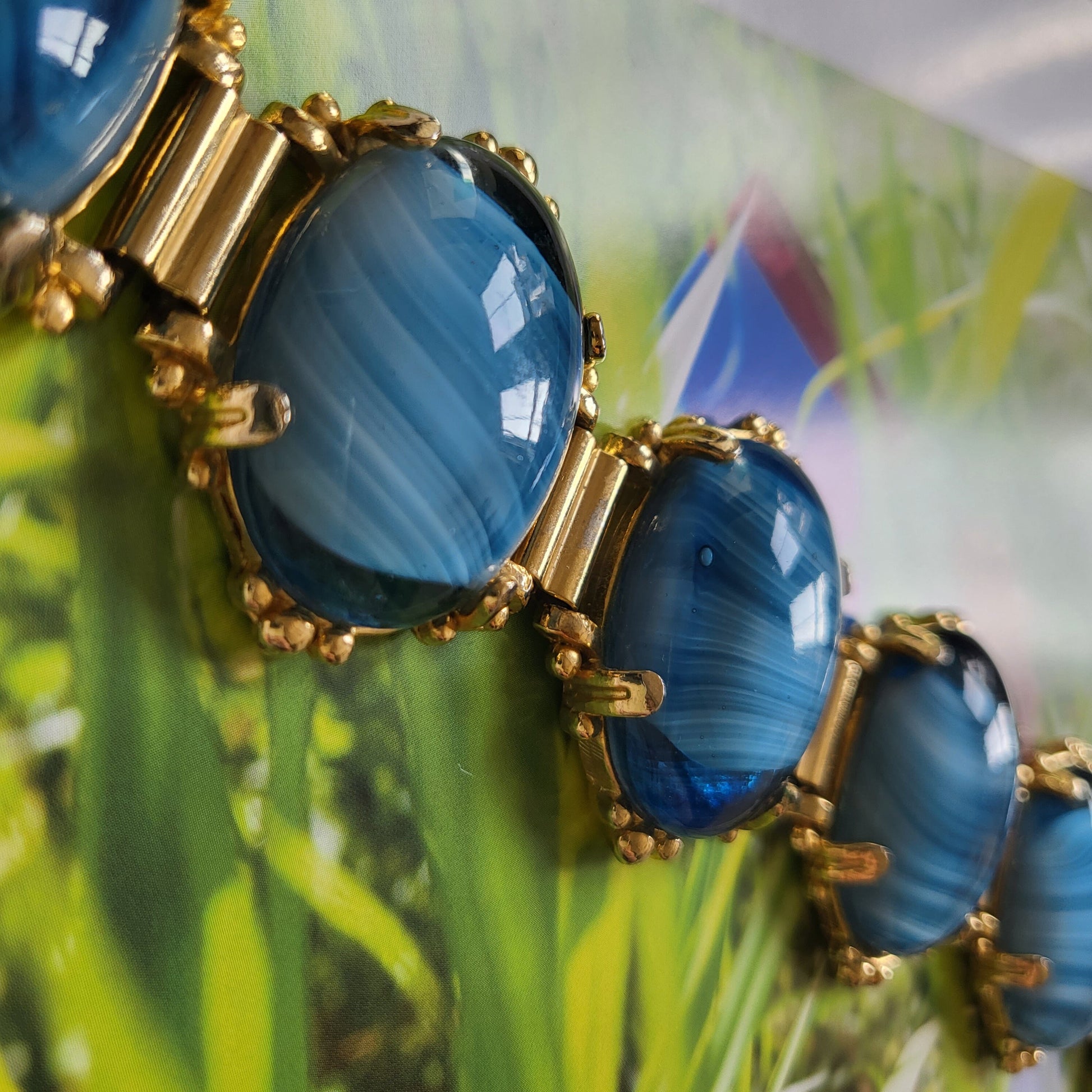 Beautiful vintage blue stripe glass cabochons set on beaded gold plated metal