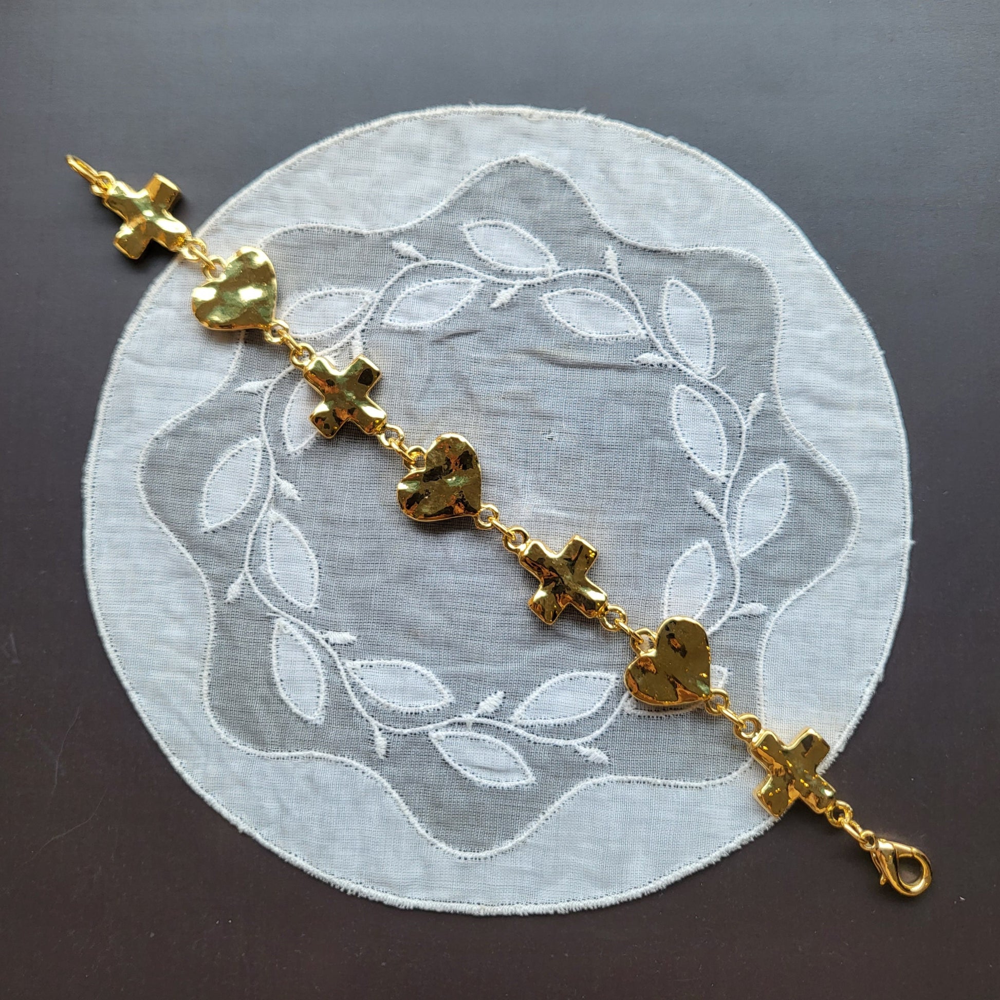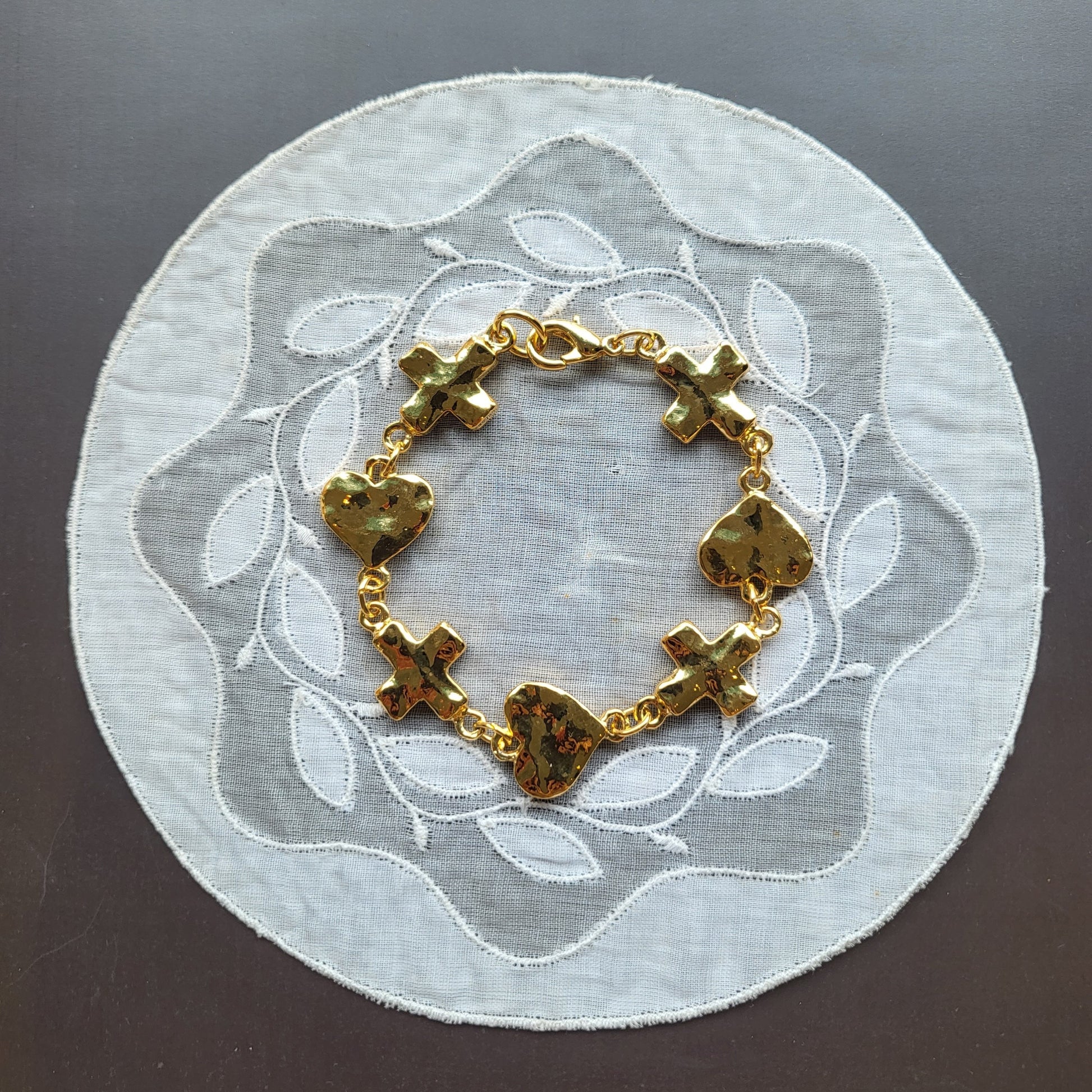 Vintage hammered textured hearts and crosses LaCroix style link bracelet in gold plated base metal