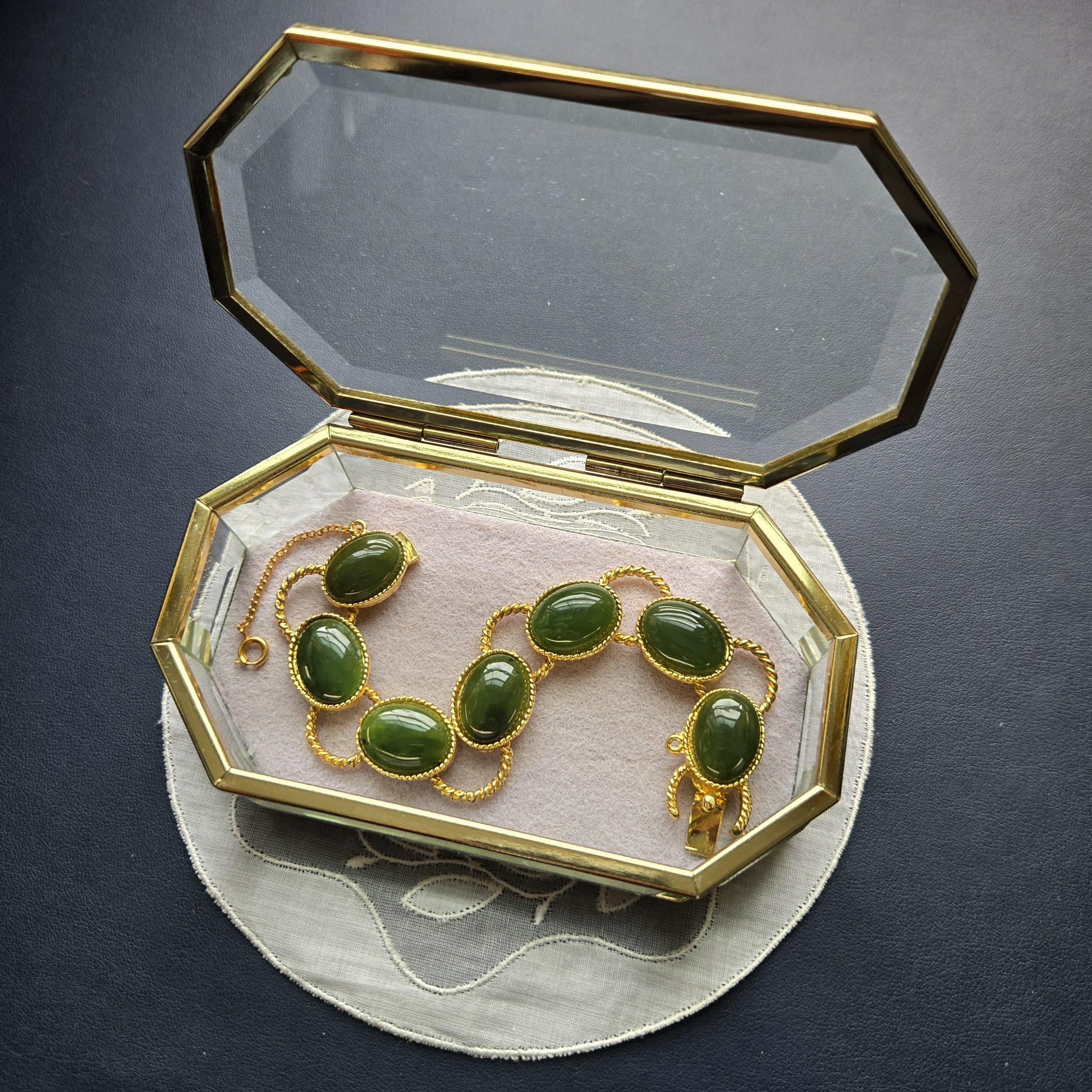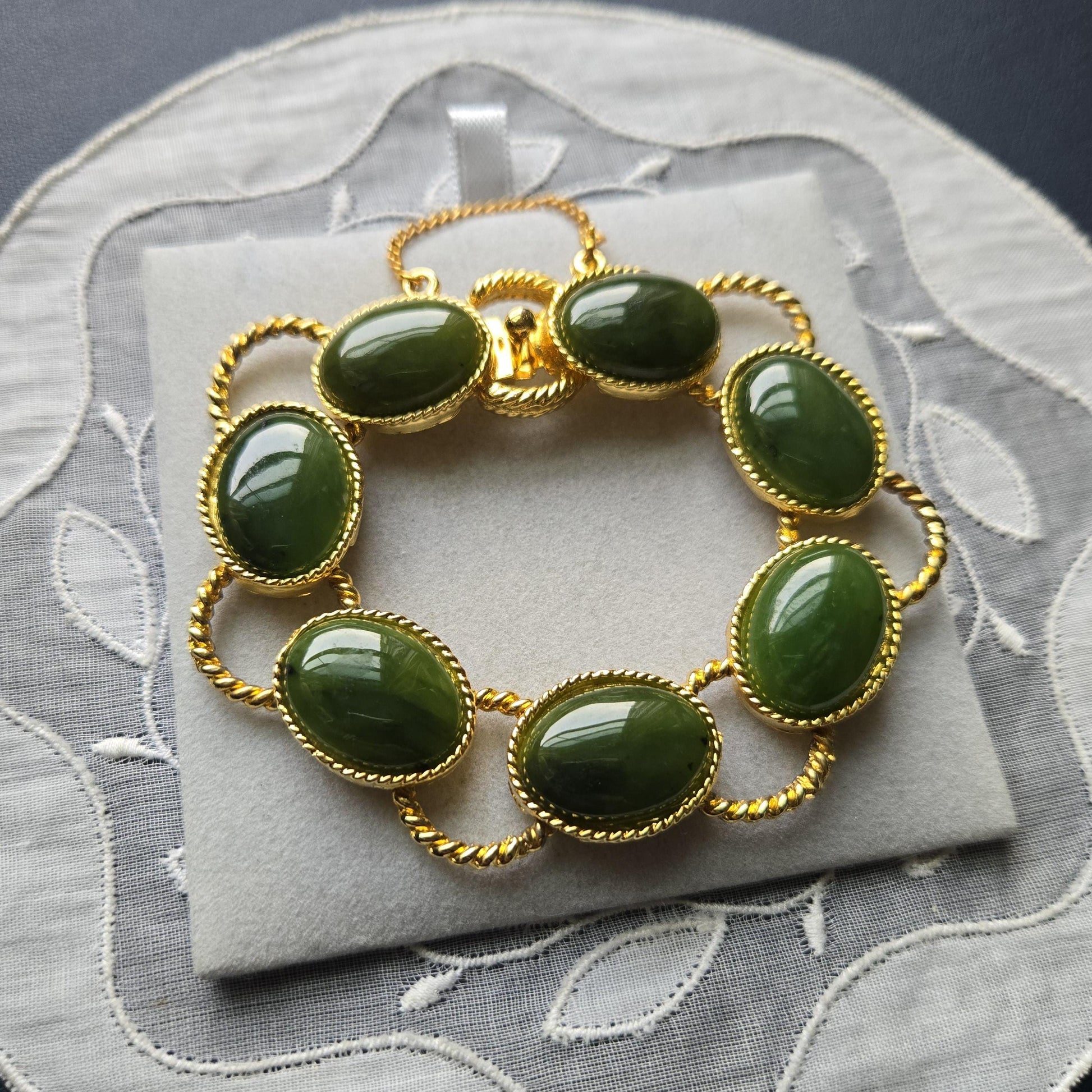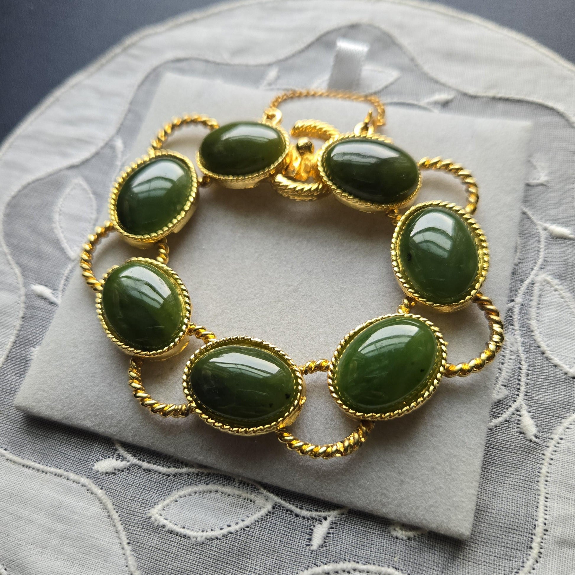 A gorgeous deep green bracelet with nephrite jade oval cabochons (possibly serpentine) on gold plated metal