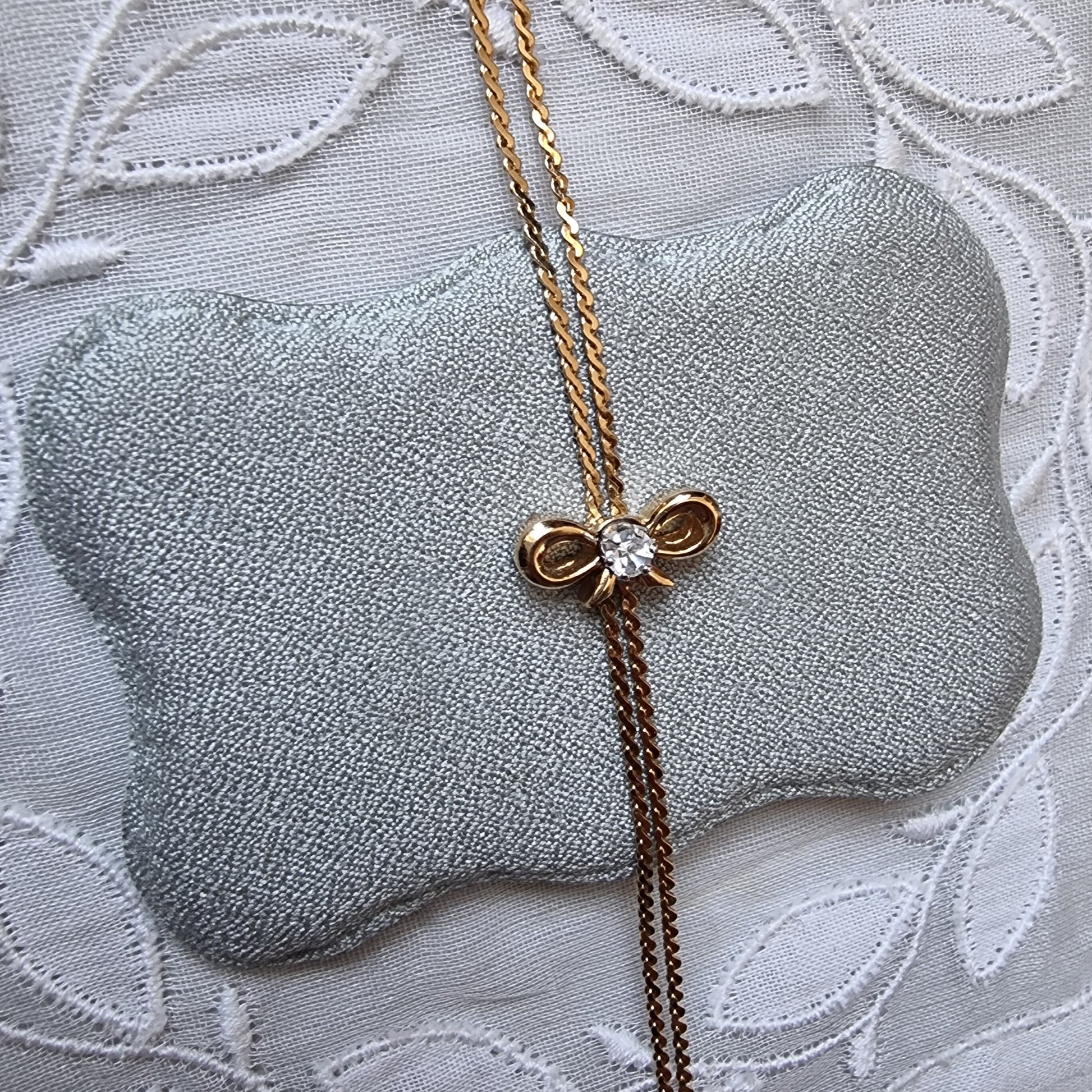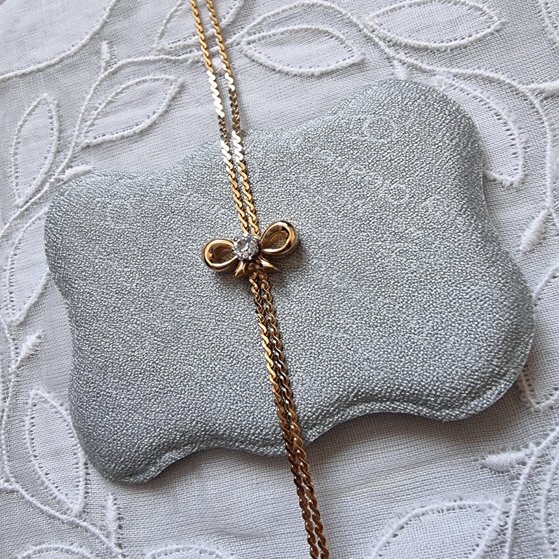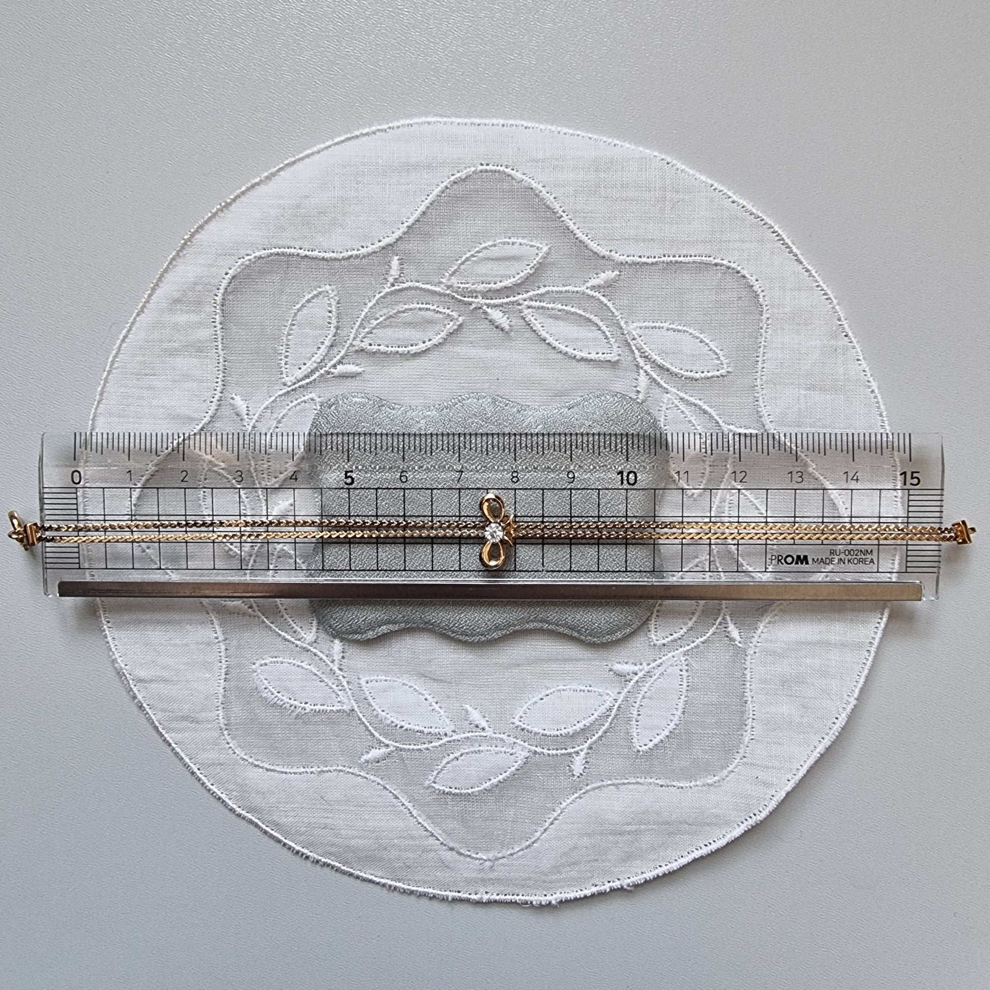 A sweet bow double strand chain bracelet with a clear crystal on gold plated metal