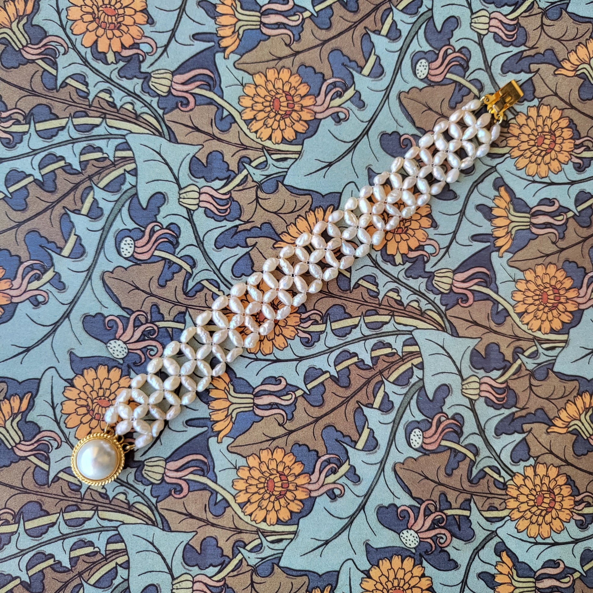 A woven freshwater pearl bracelet with a faux pearl clasp set in gold plated metal