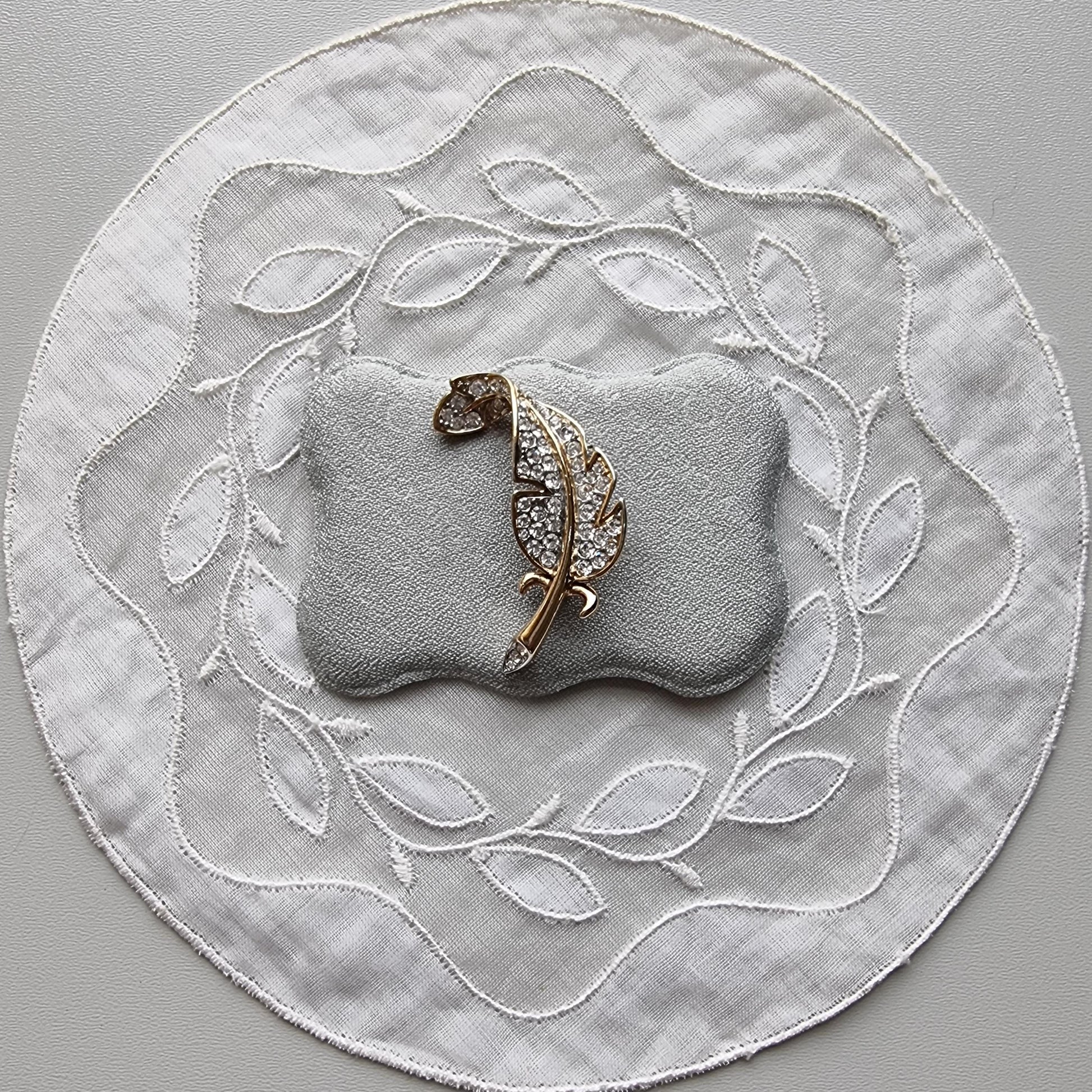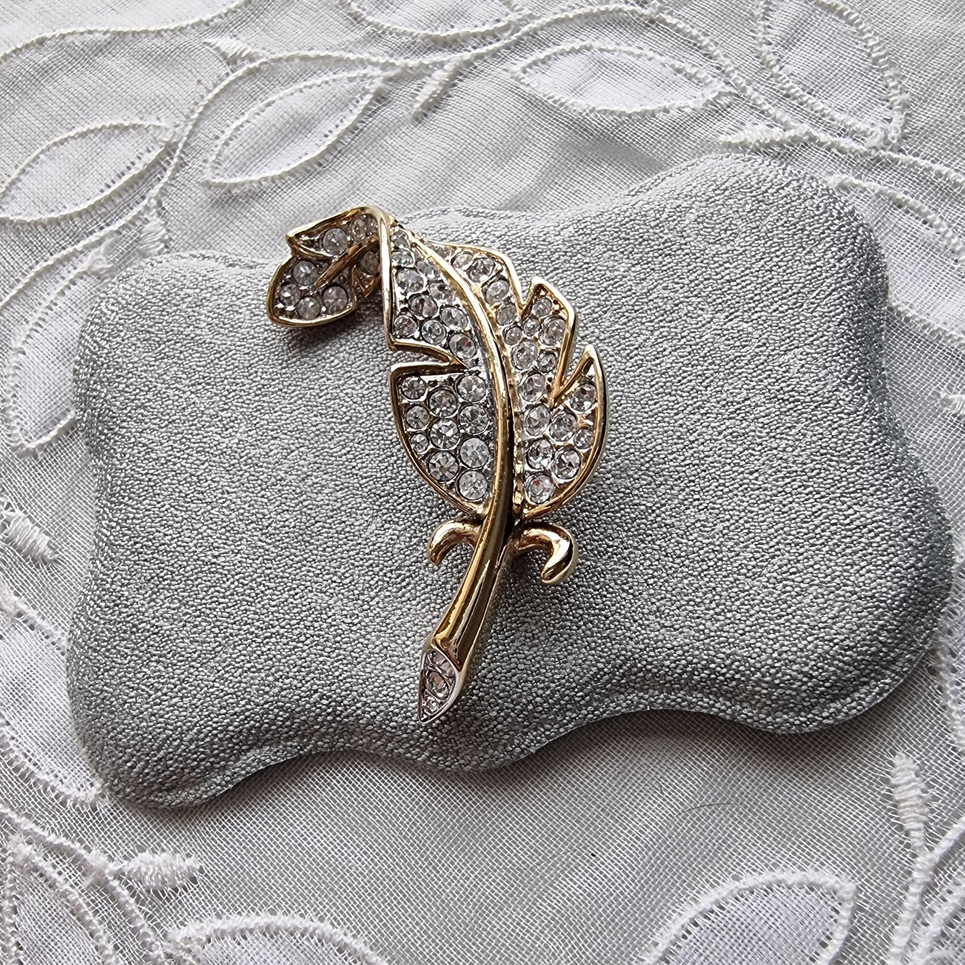 A beautiful small feather brooch by Attwood and Sawyer with clear crystals in 22ct gold plated metal