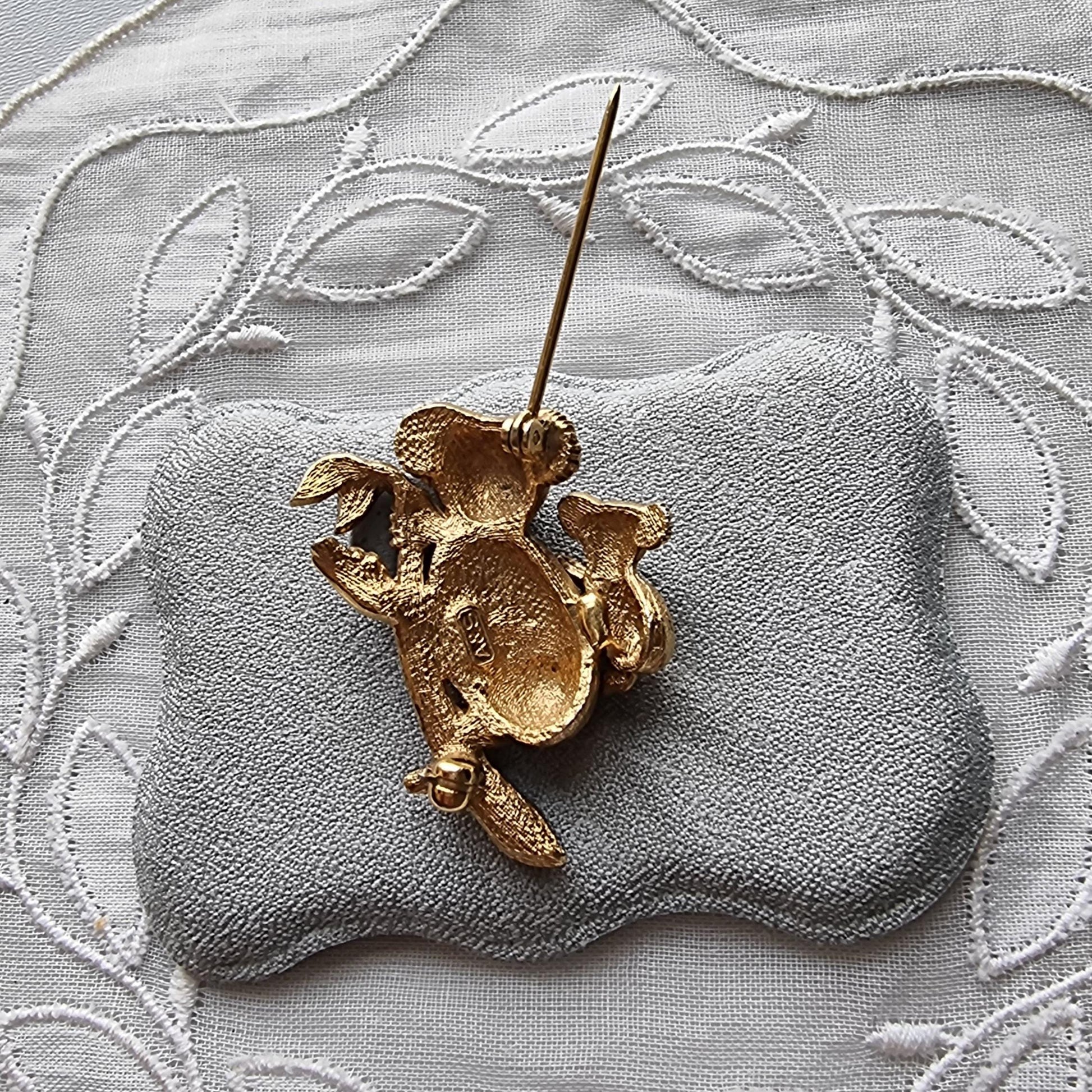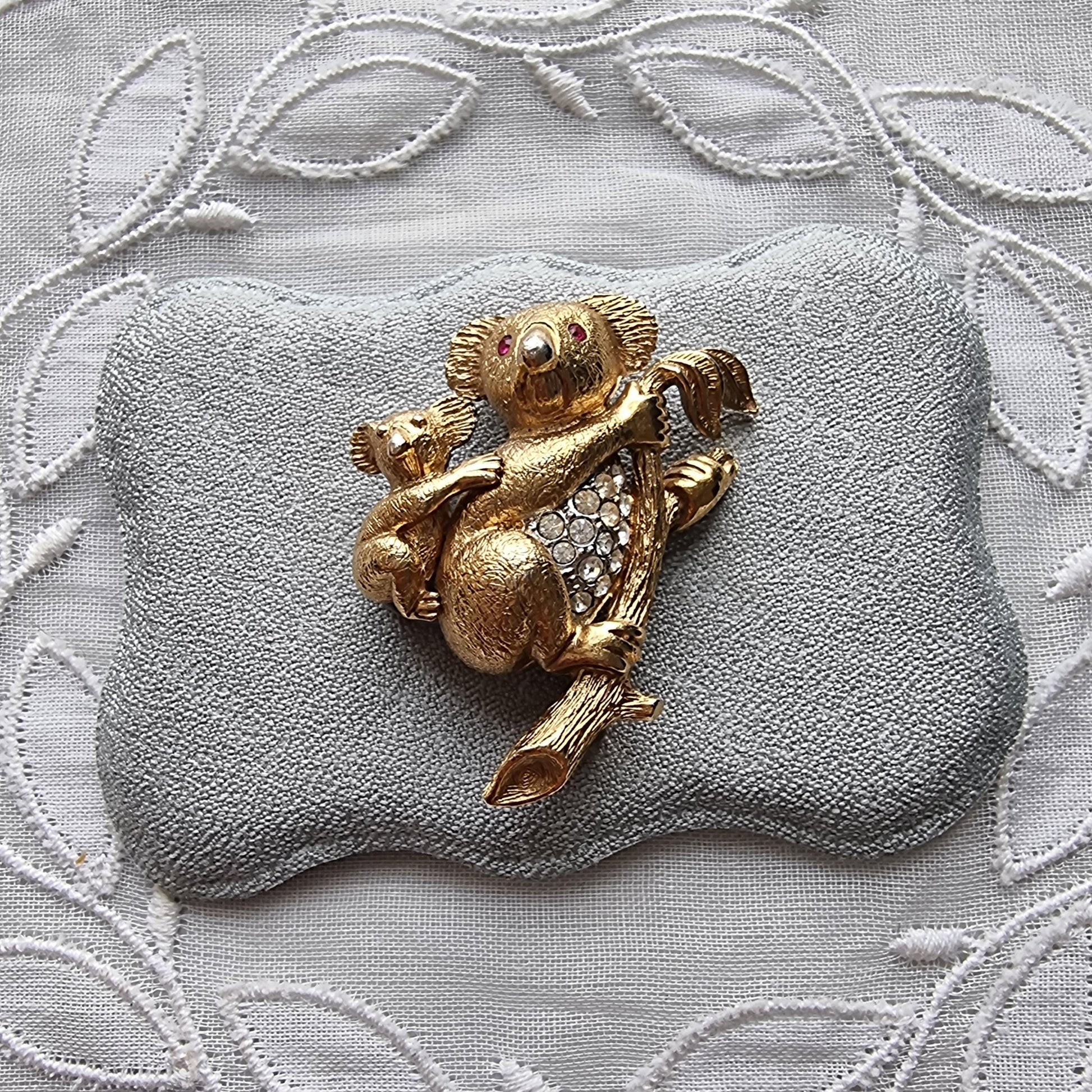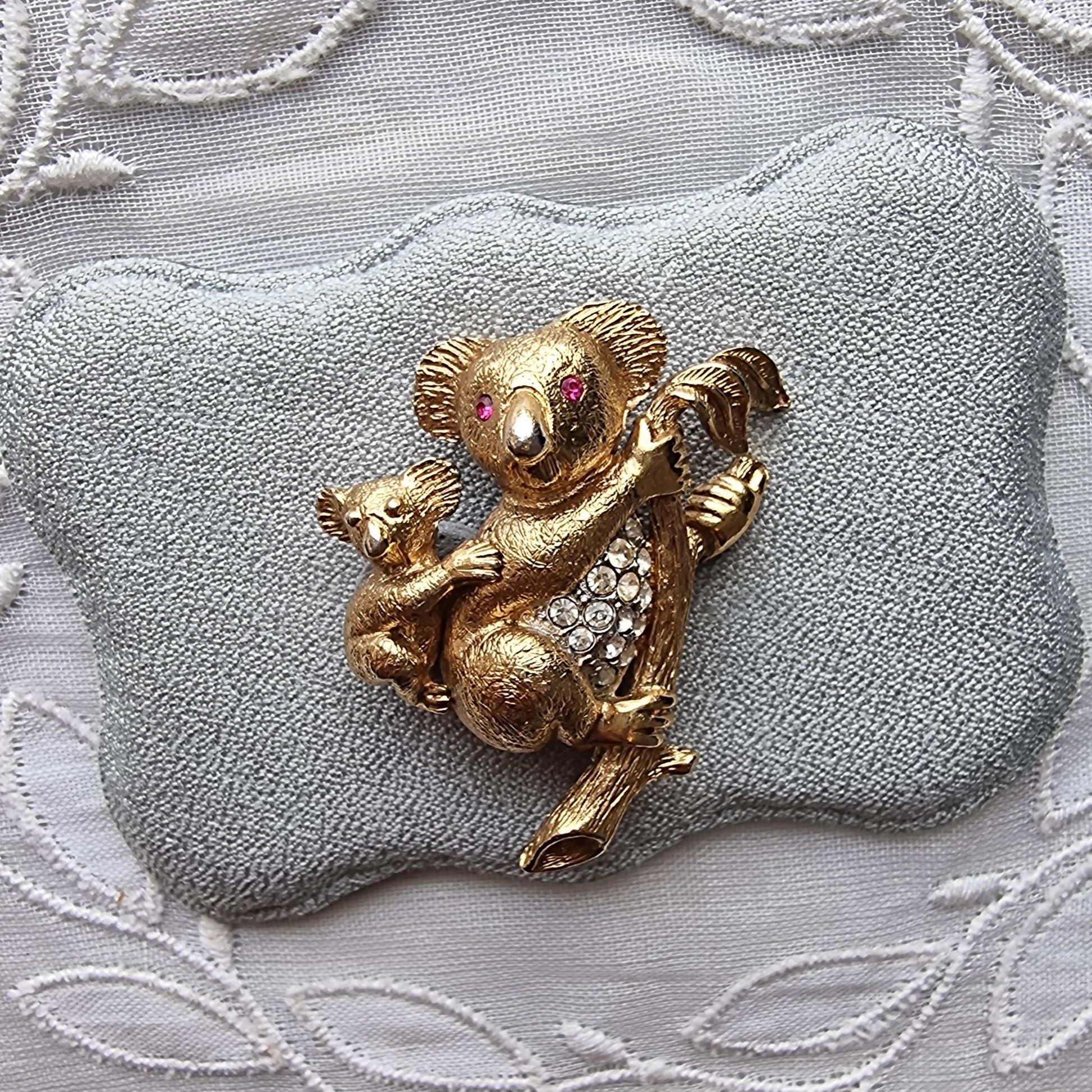 A sweet mother and baby koala brooch by Attwood and Sawyer with pink and clear crystals on 22ct gold plated metal