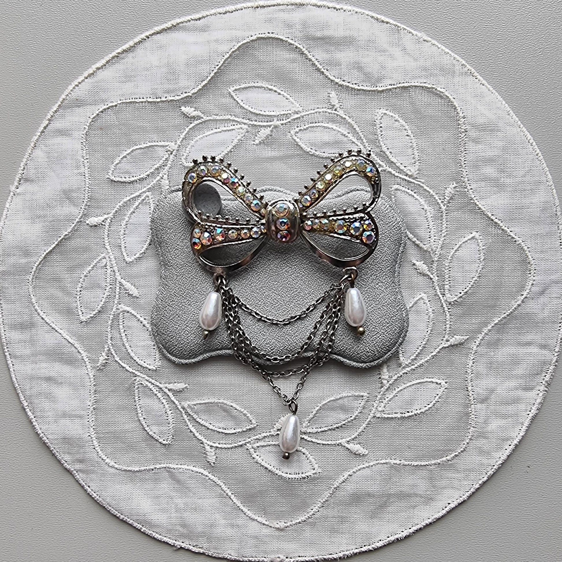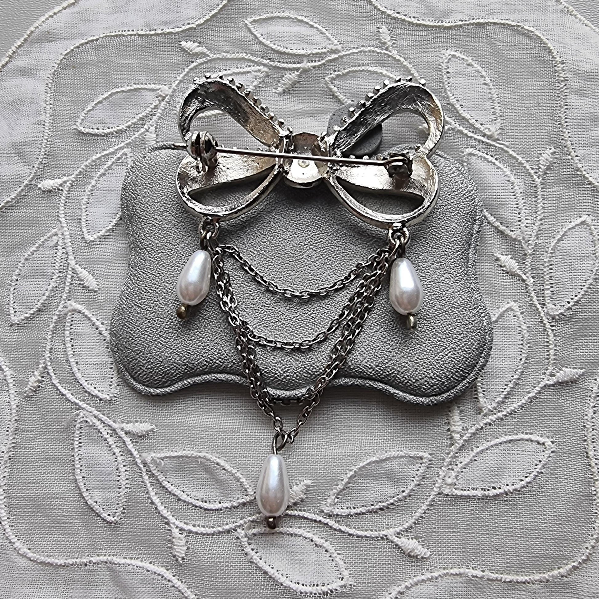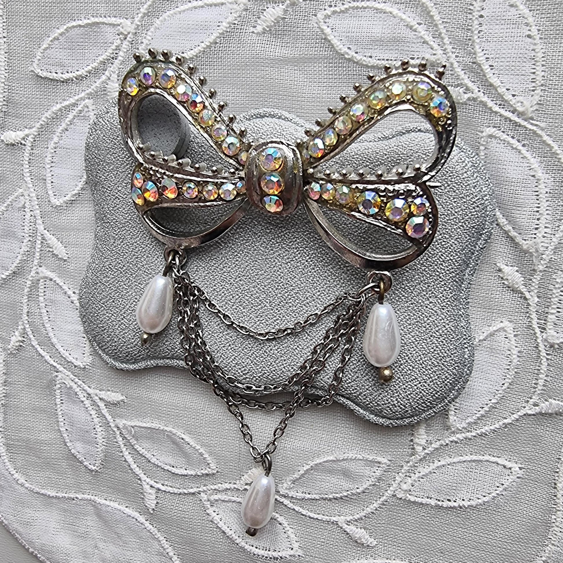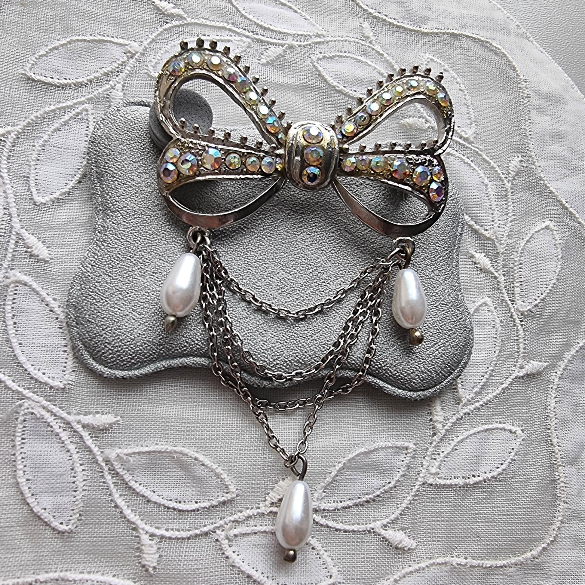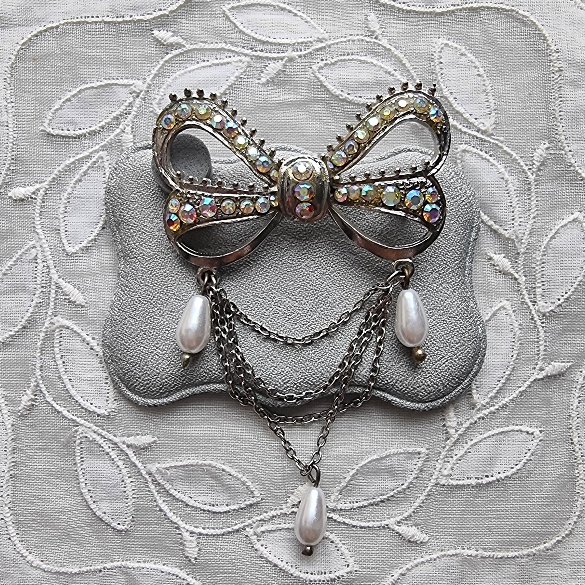 A beautiful bow brooch set with aurora borealis crystals and faux pearl drops on rhodium plated metal
