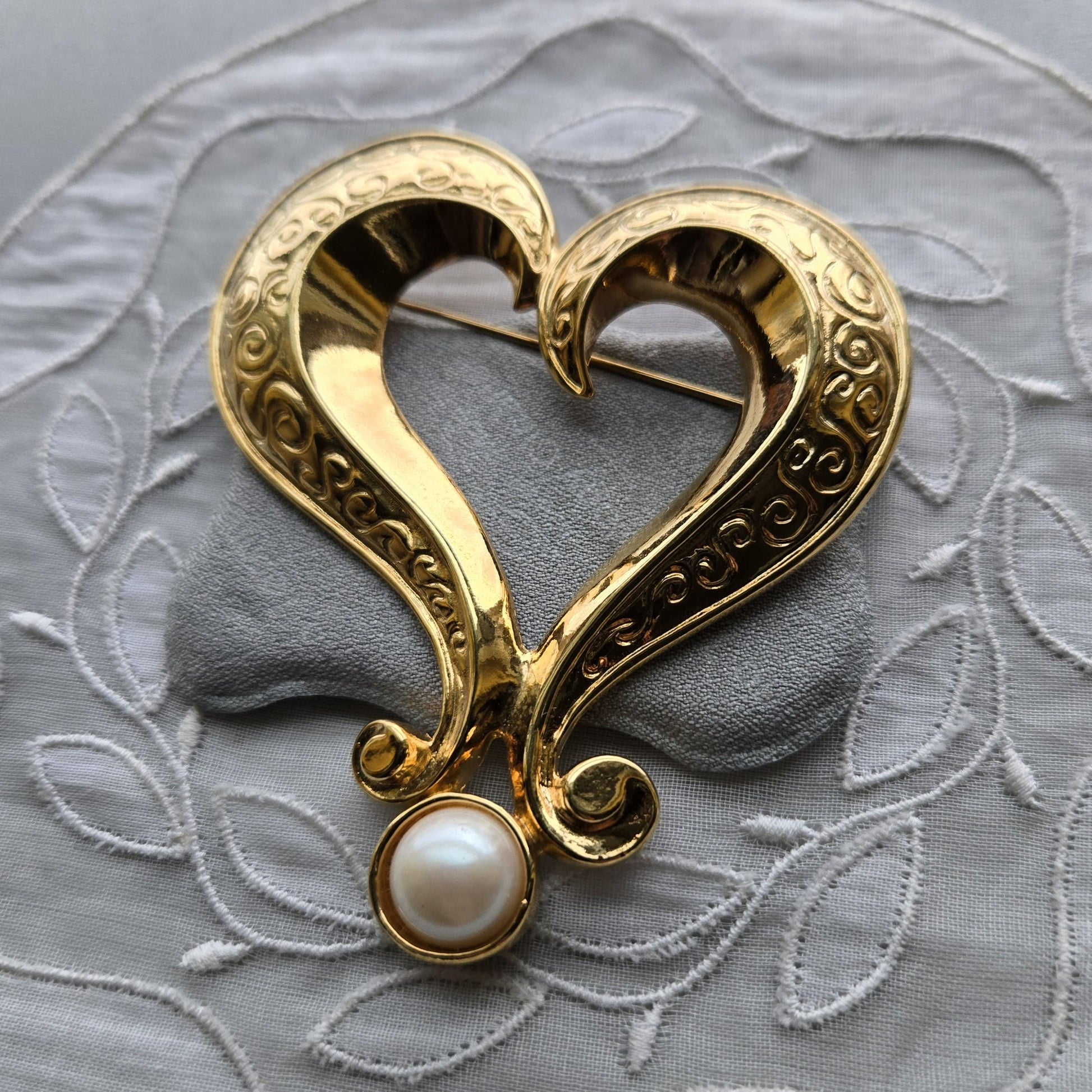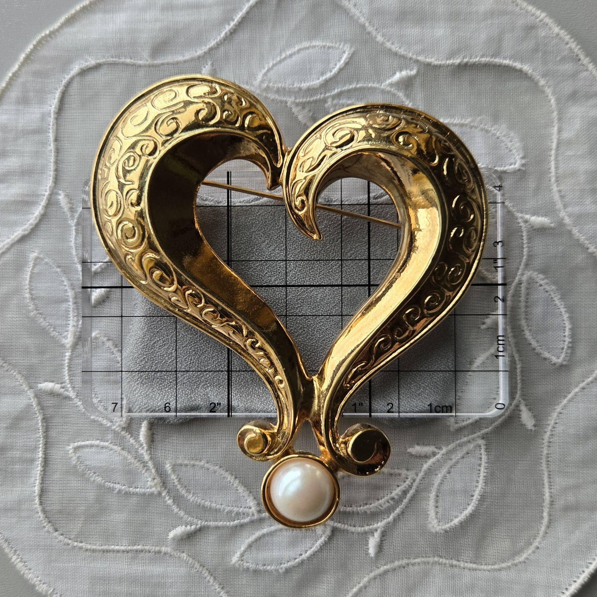 A lovely statement heart brooch by Avon with a faux pearl cabochon on gold plated metal