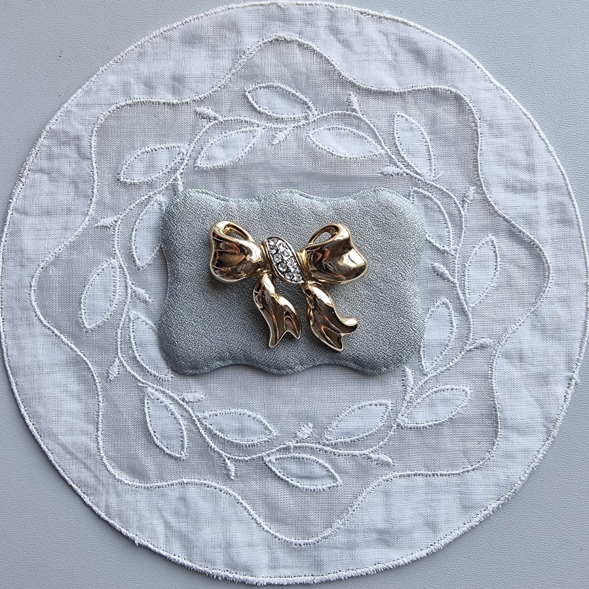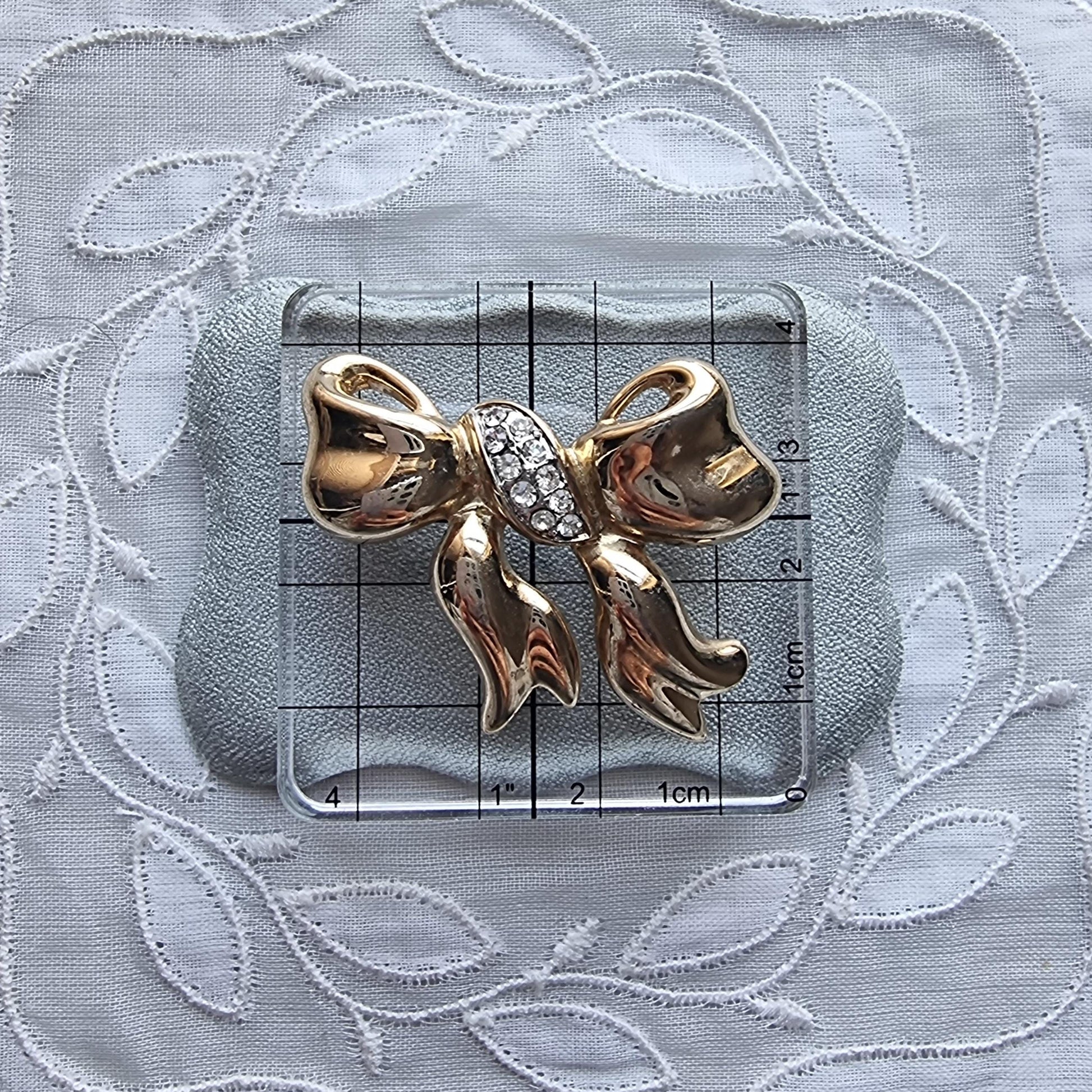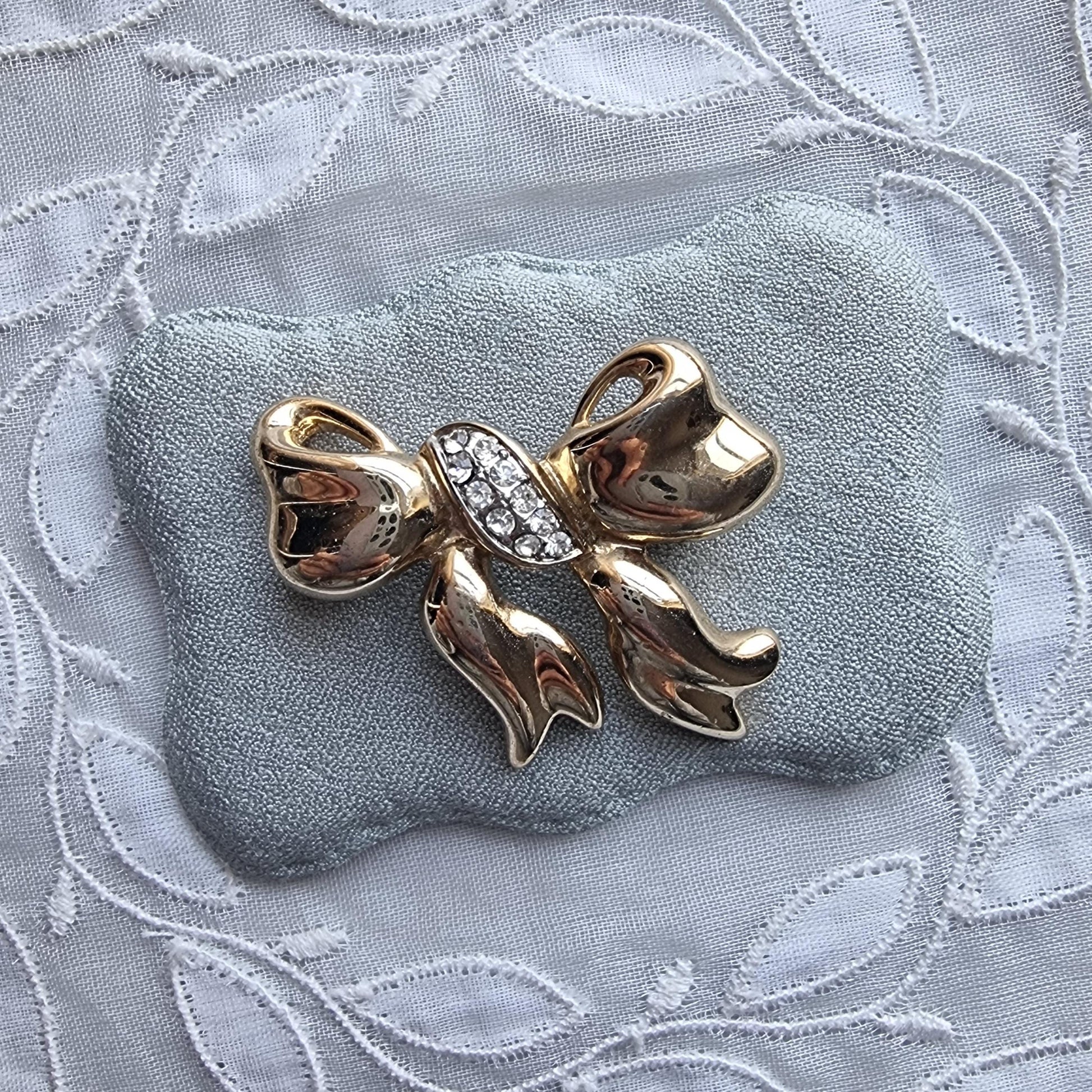 A sweet bow brooch by Beatrix Jewellery with clear crystals on gold plated metal