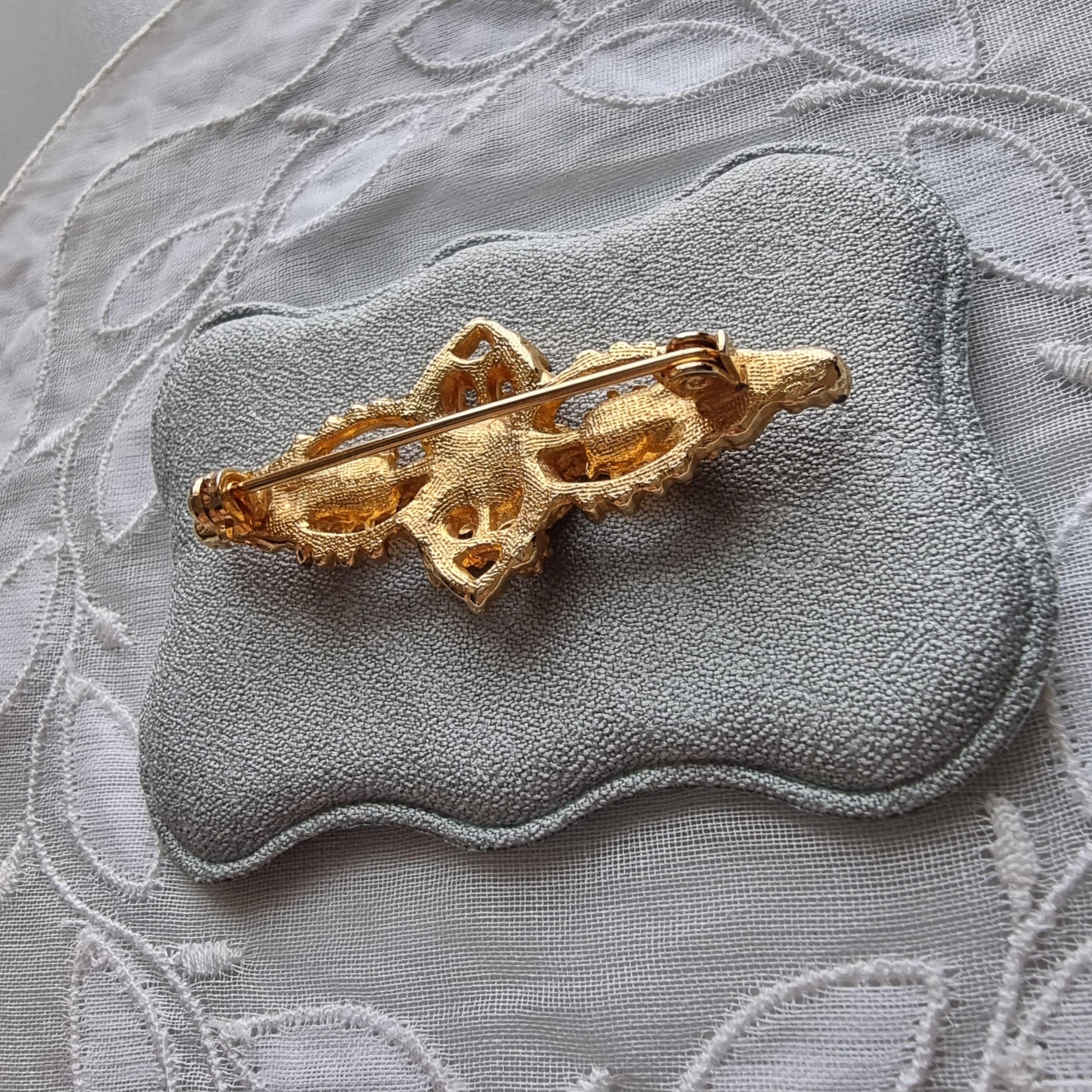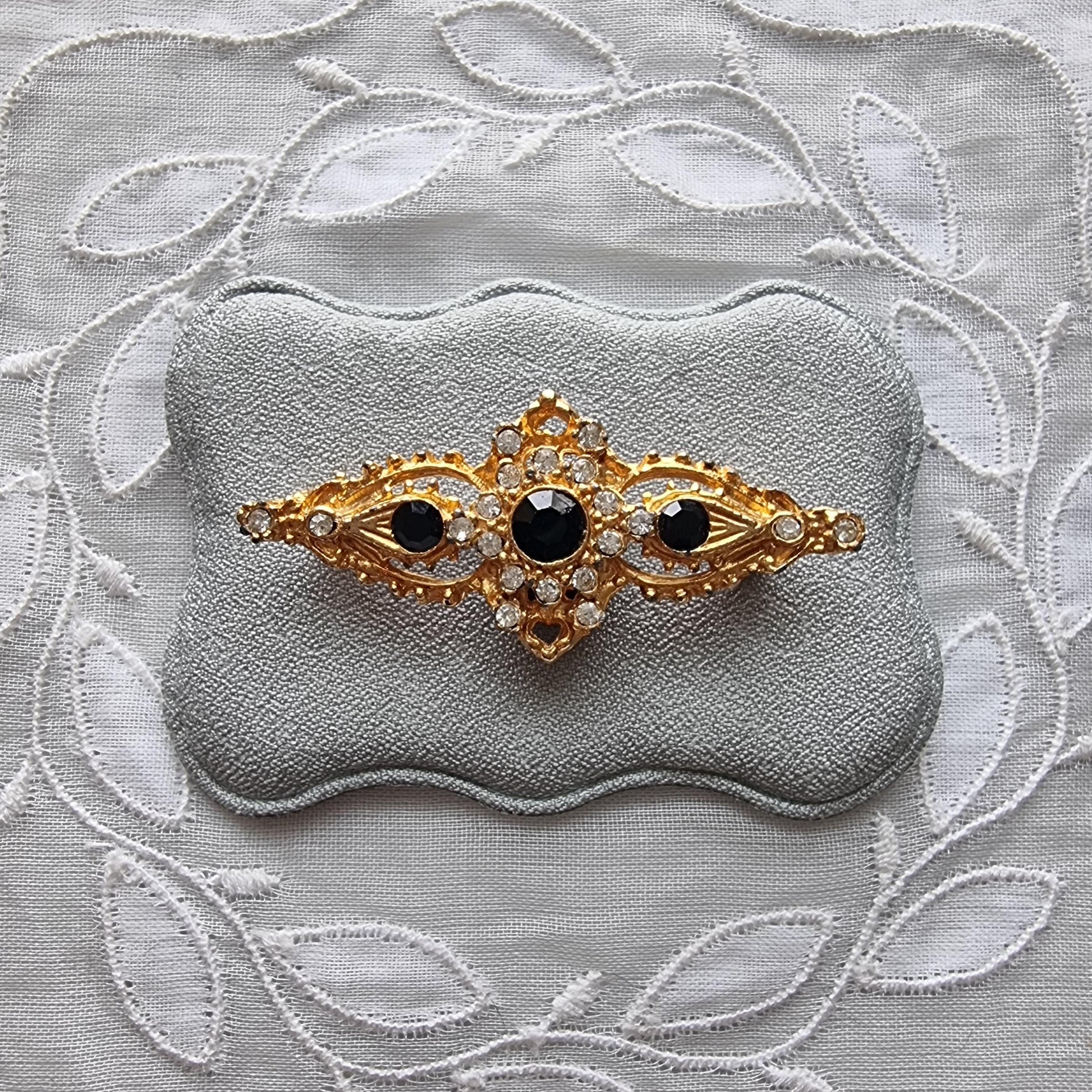 A beautiful bar brooch with black and clear crystals and faux seed pearls on gold plated metal