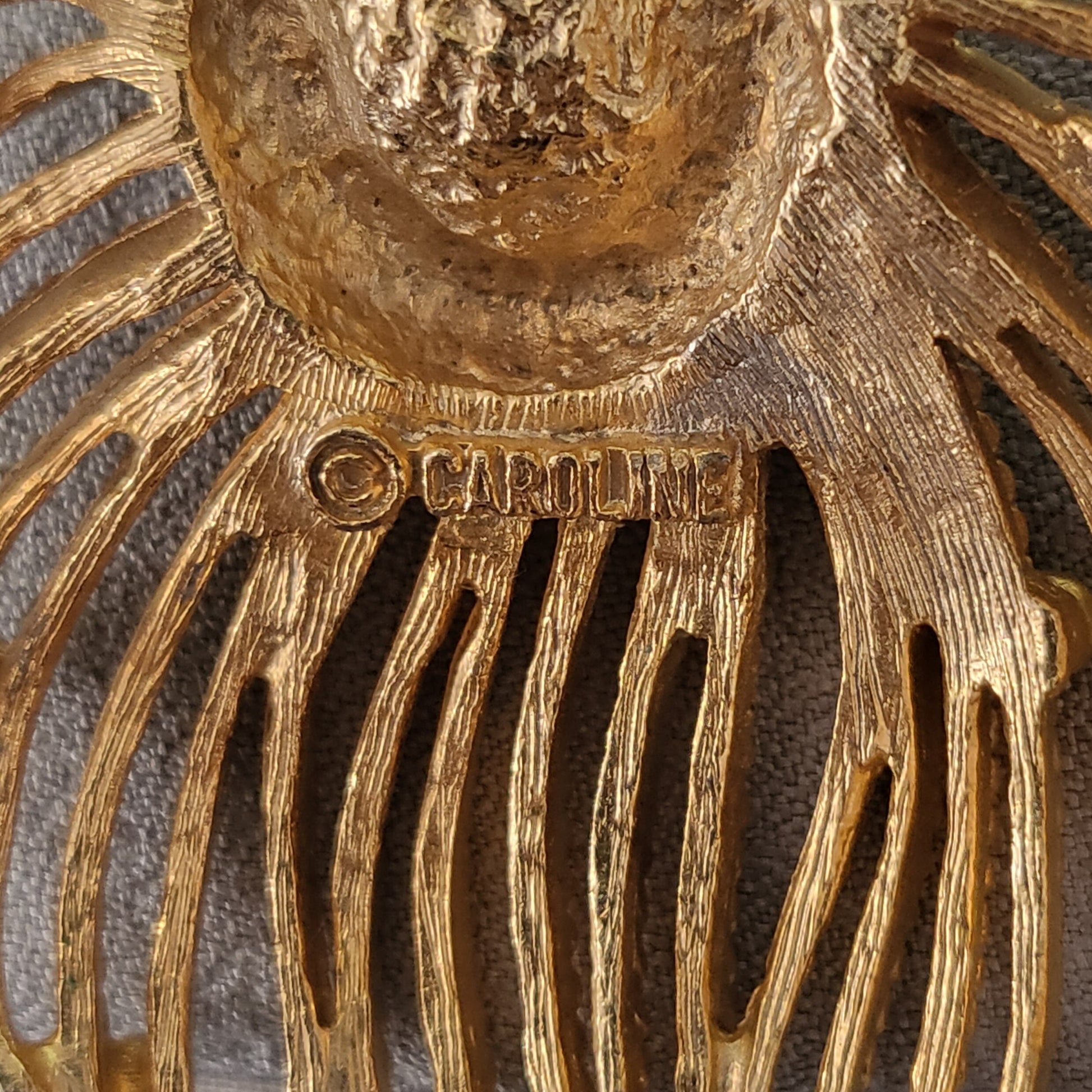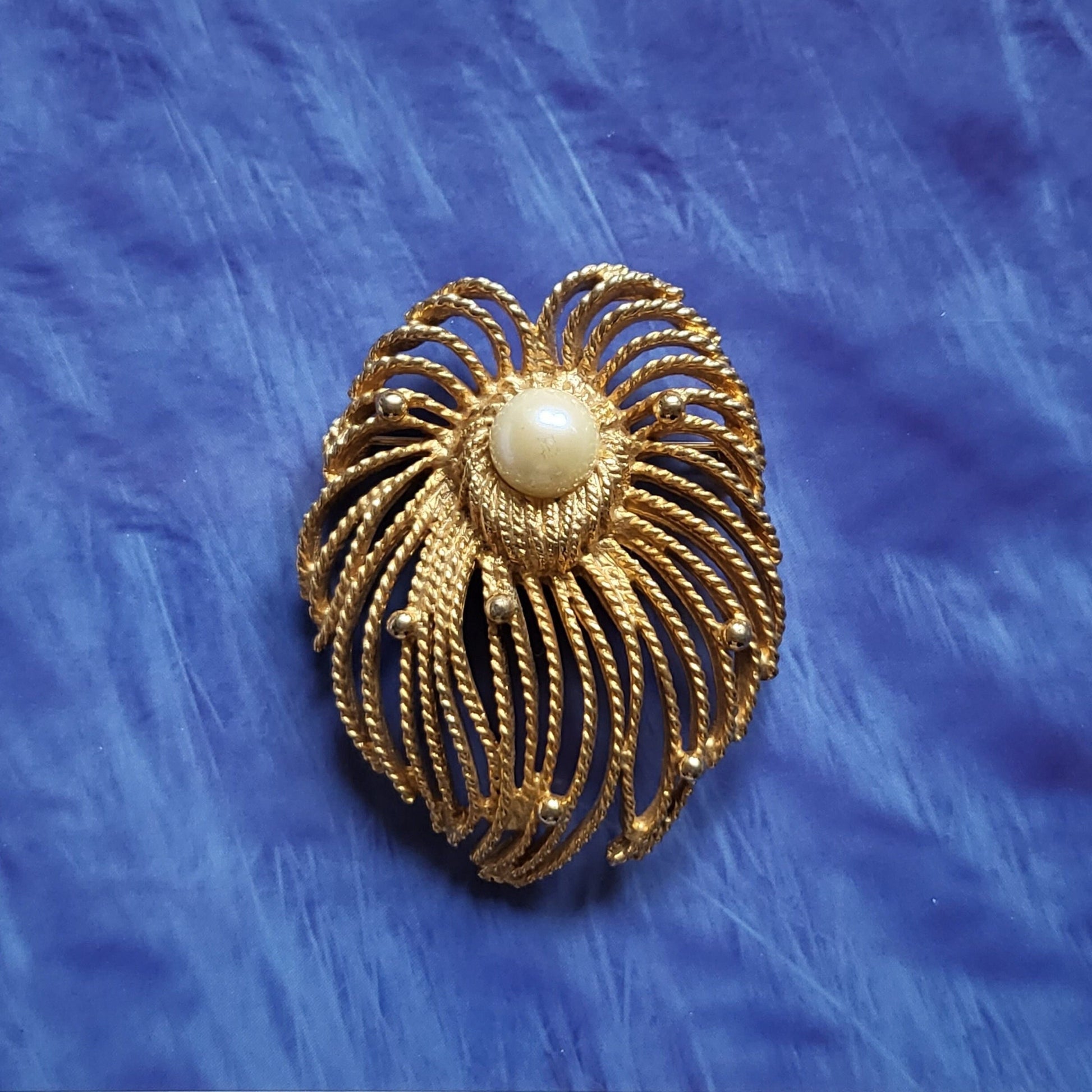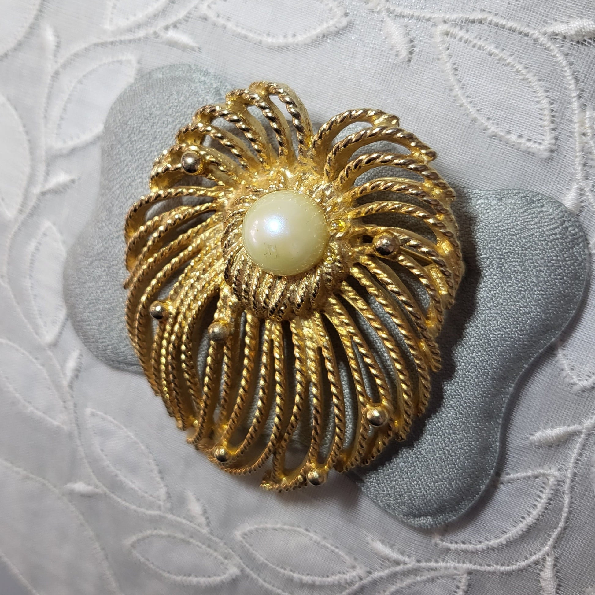 A gorgeous statement brooch by Caroline with a round faux pearl on gold plated metal