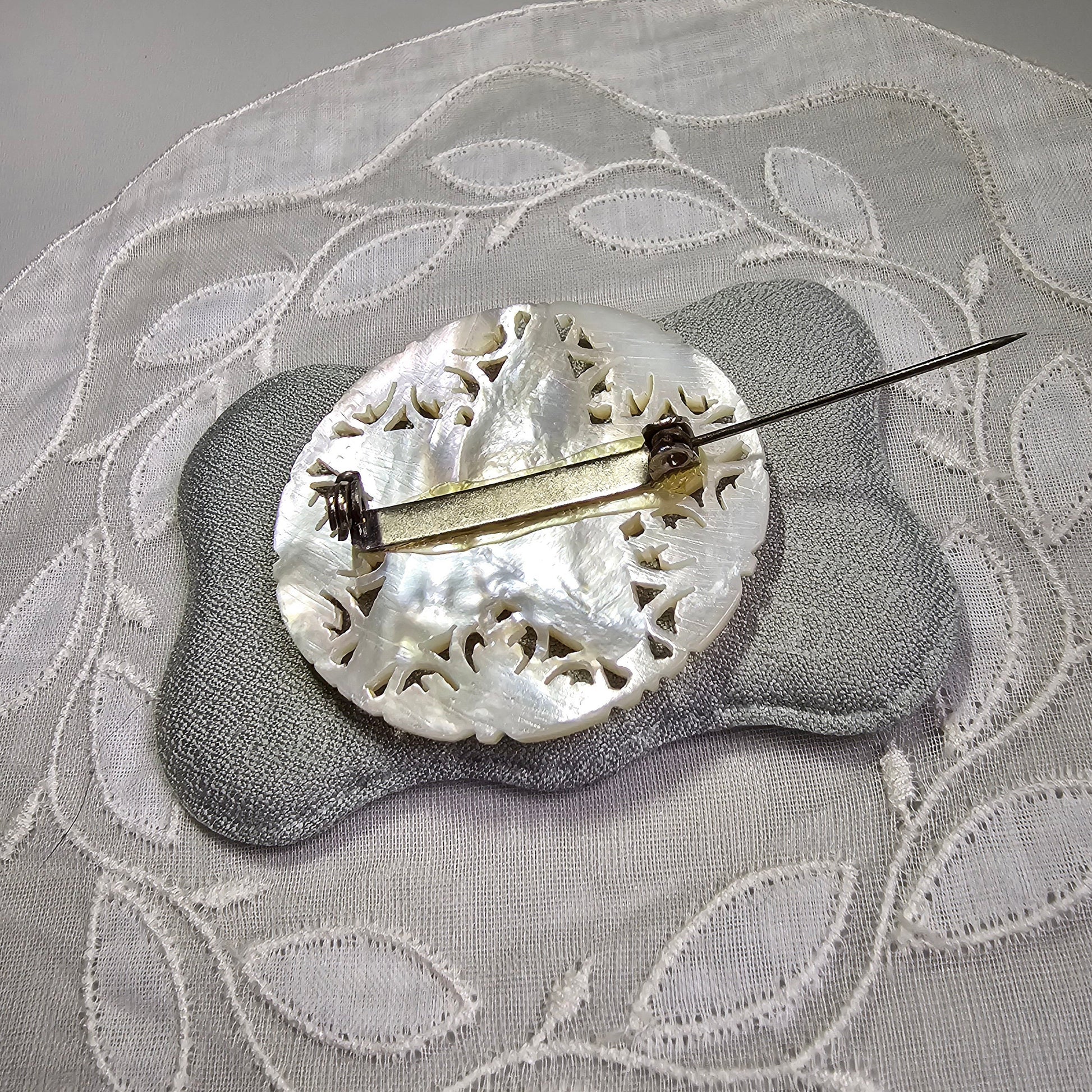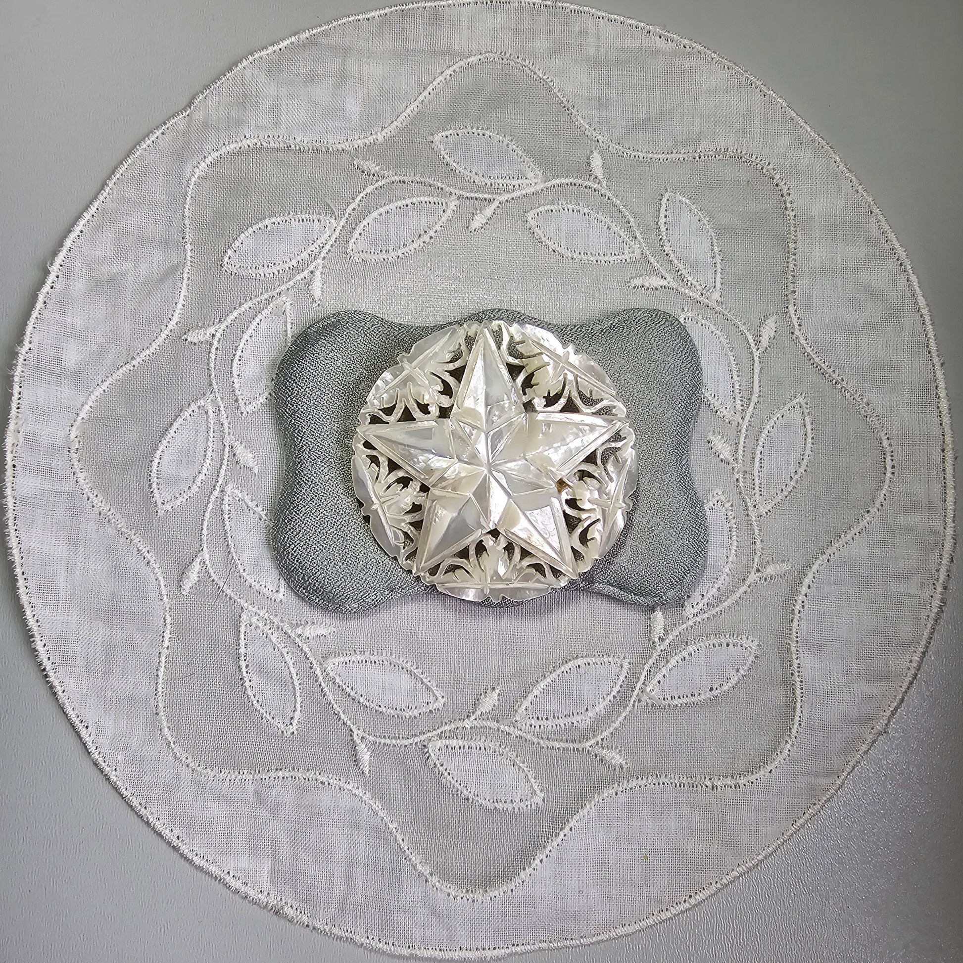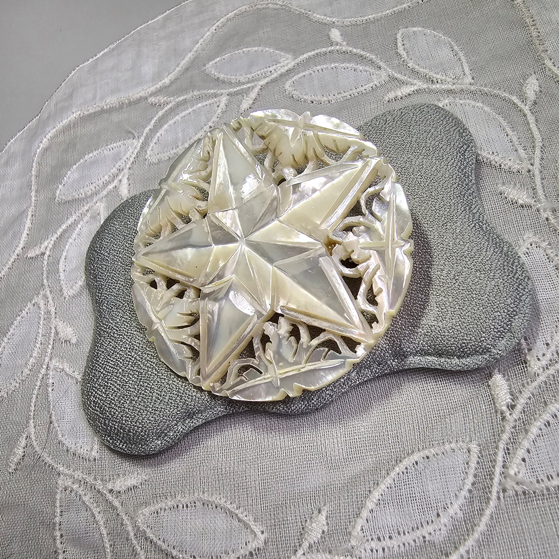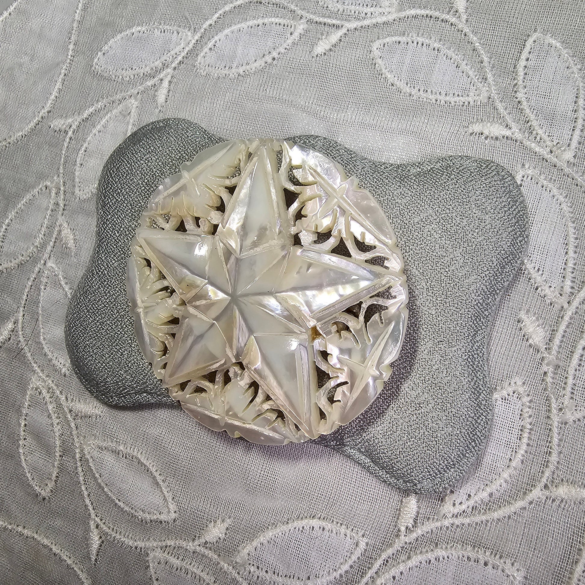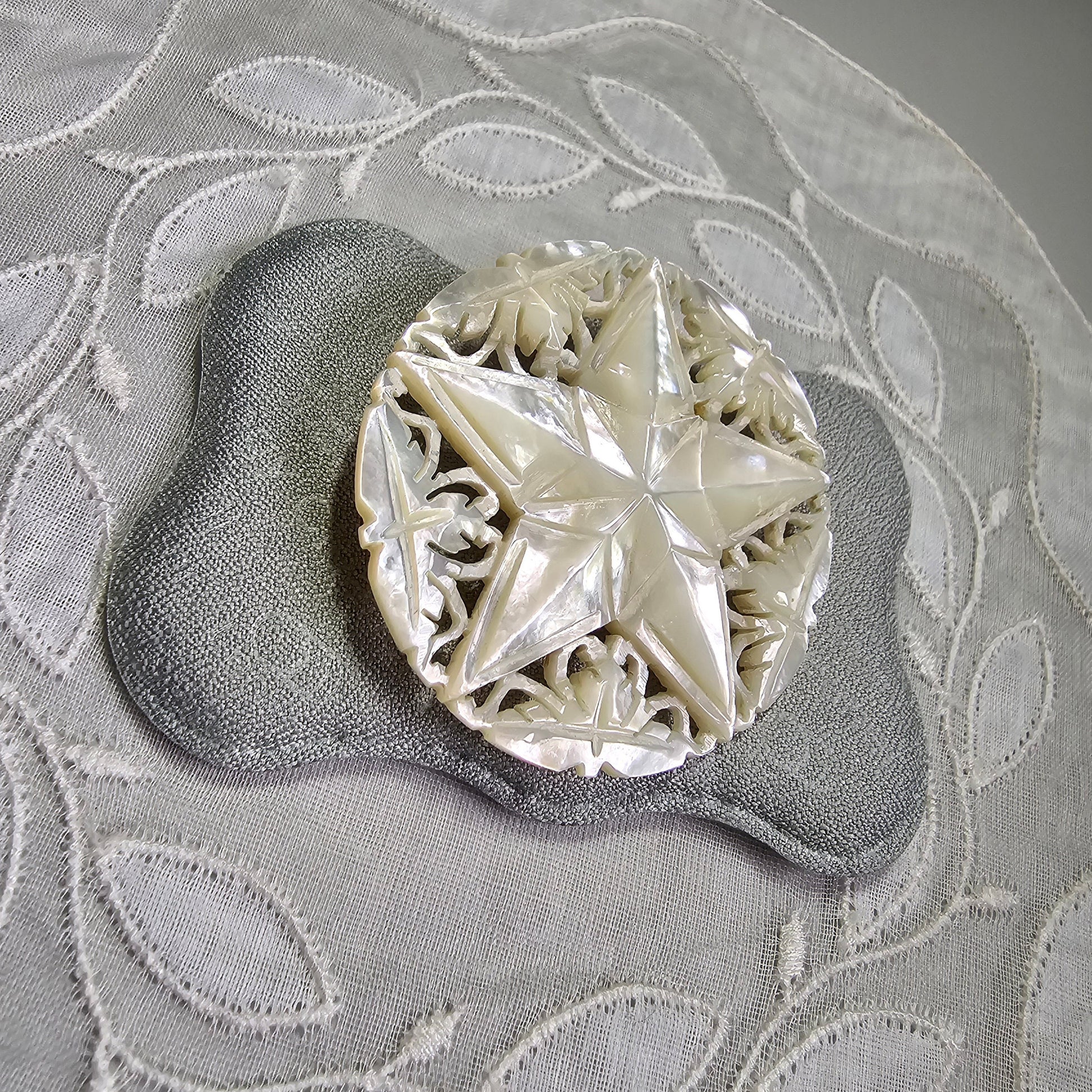 A beautiful intricately carved mother of pearl brooch in the shape of a star