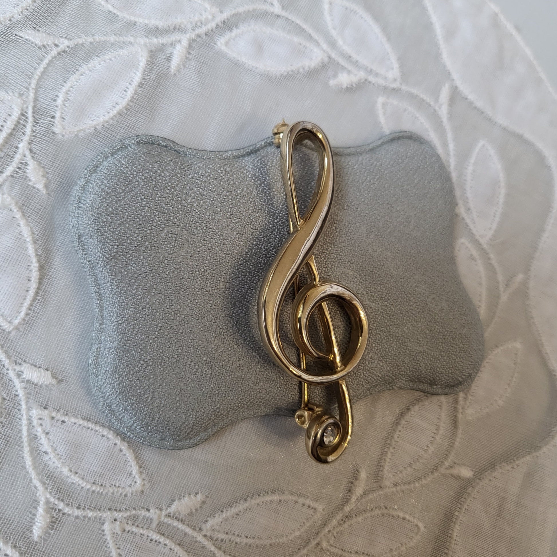 A simple treble clef motive brooch with a round crystal on gold plated metal