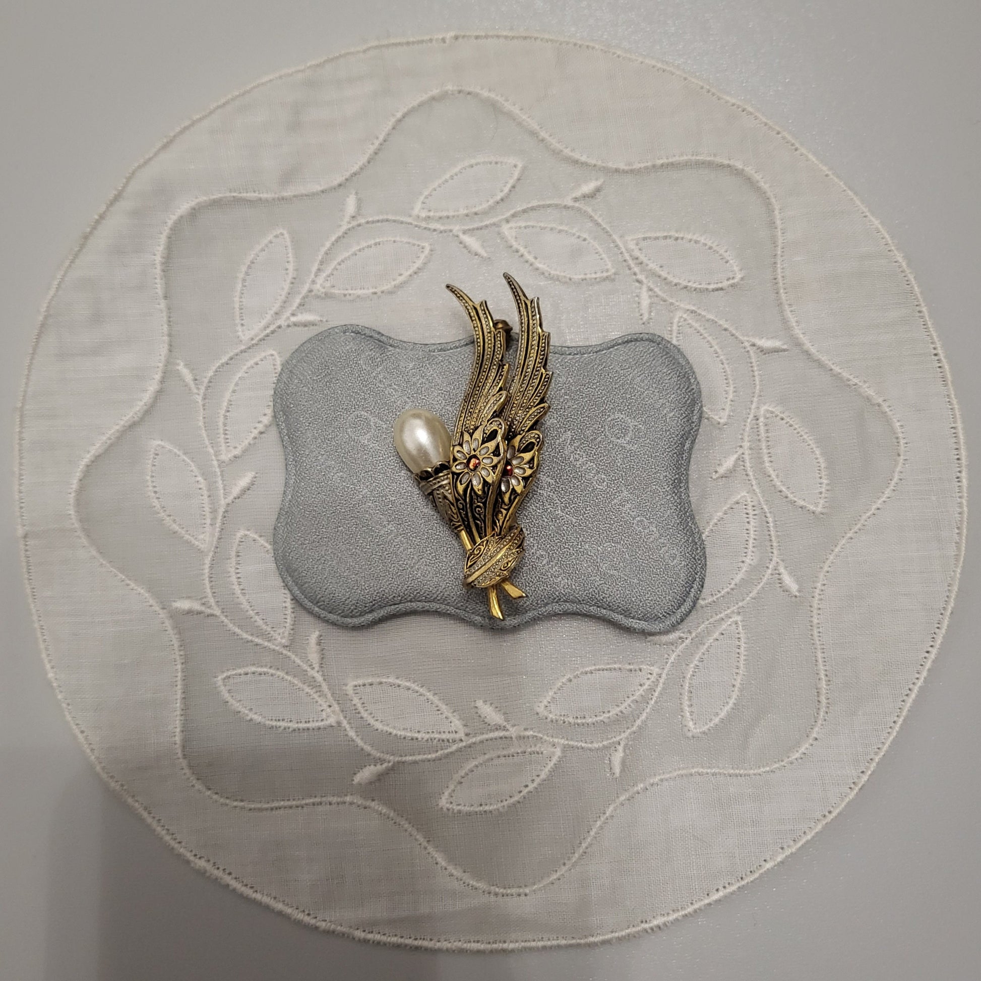 Brooch - Damascene Faux Pearl Feathers Brooch