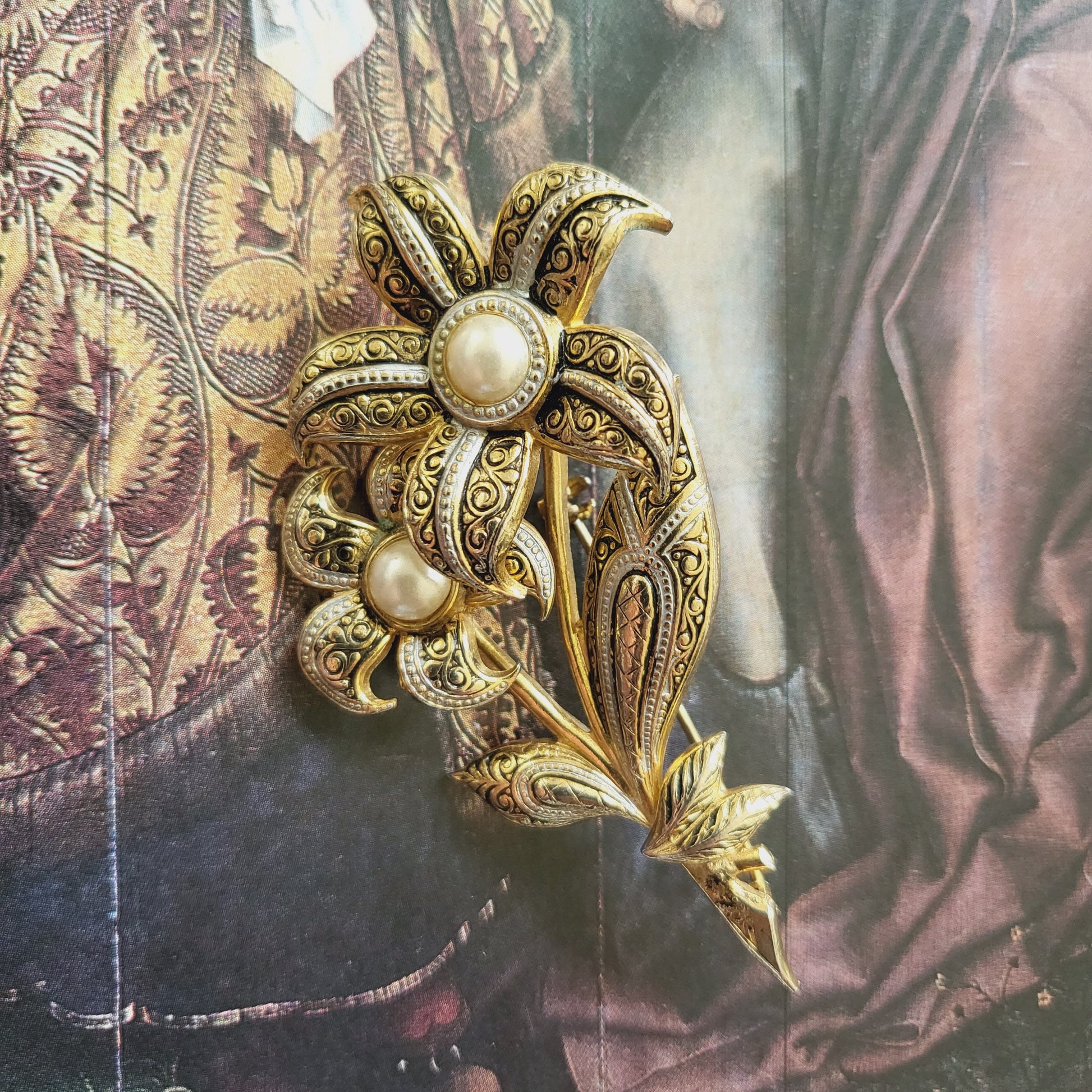 Brooch - Damascene Faux Pearl Flowers Brooch