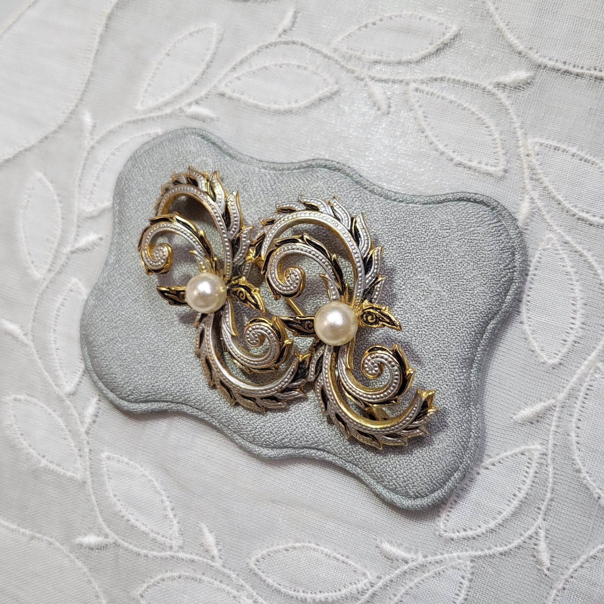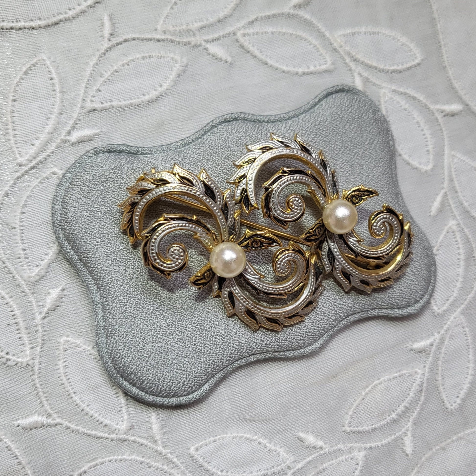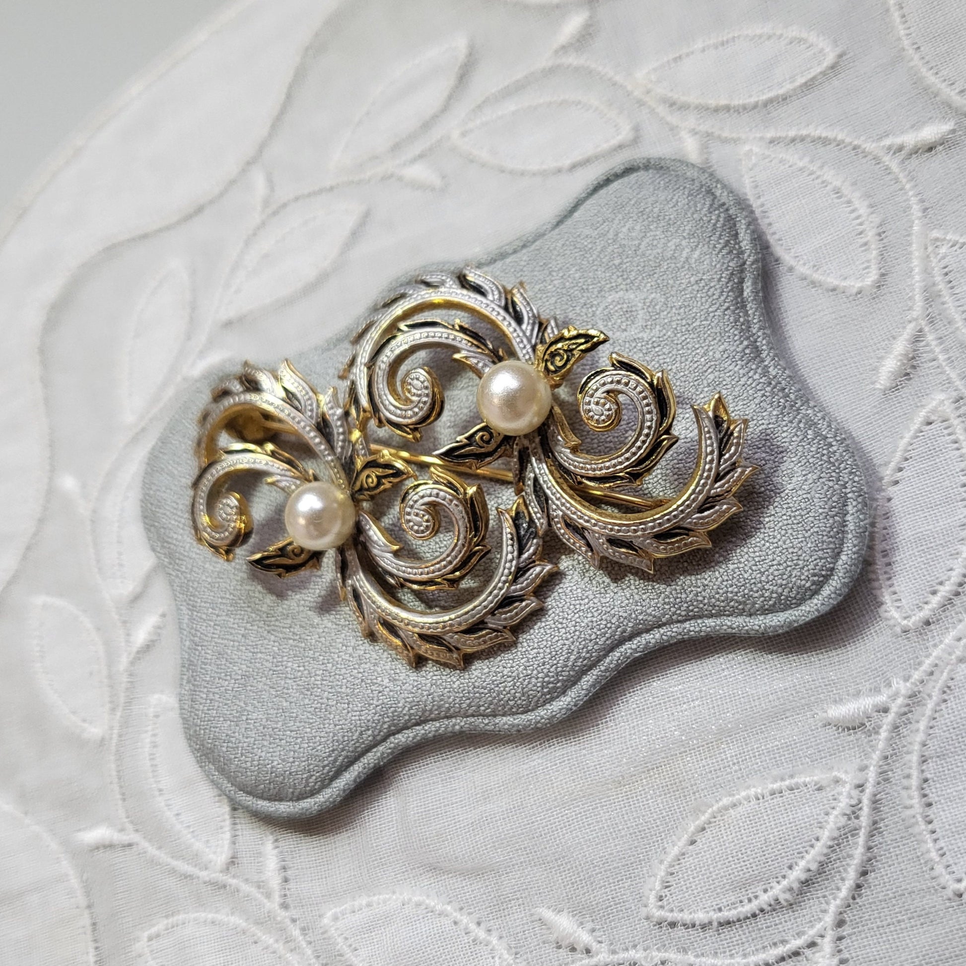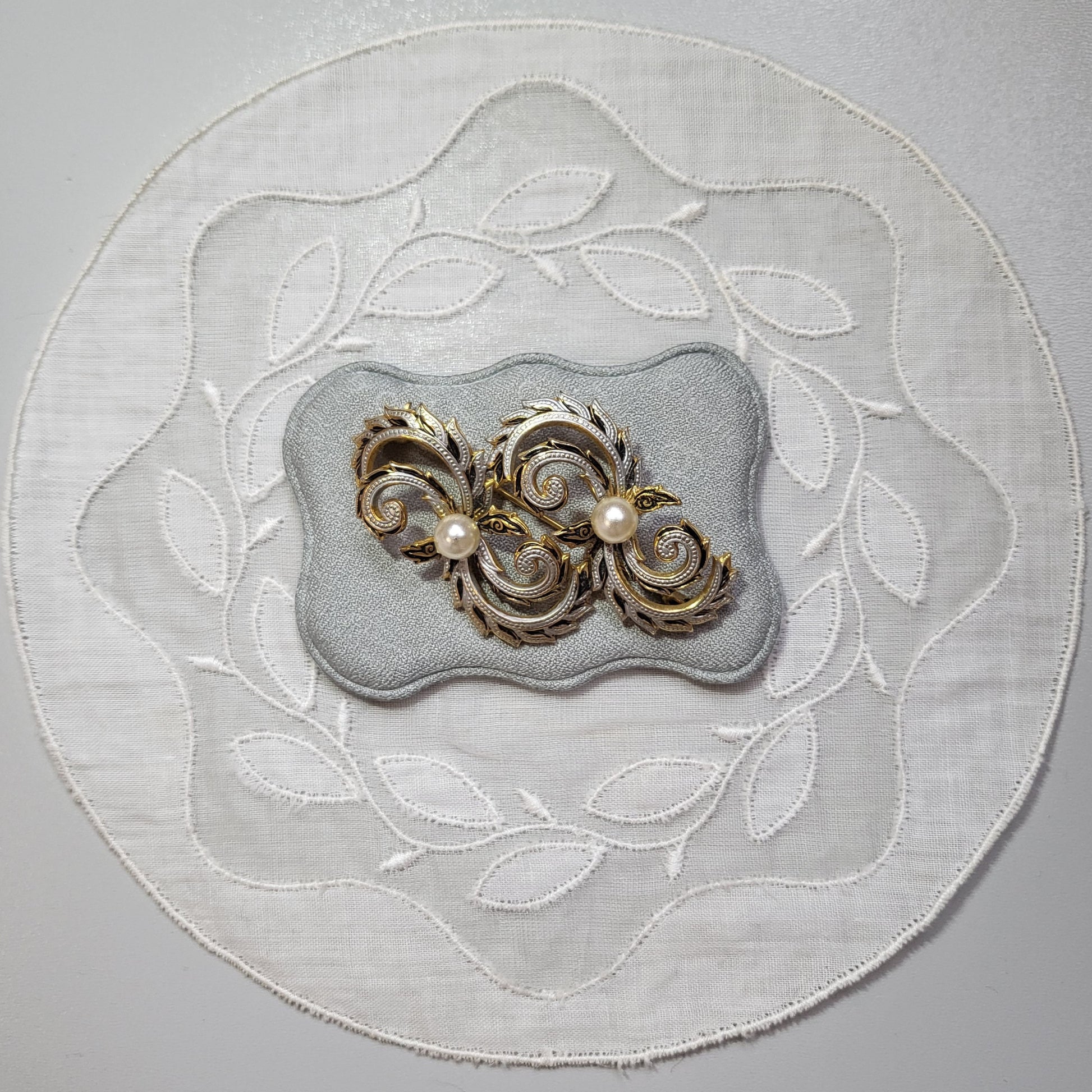 Brooch - Damascene Faux Pearl Swirly Brooch