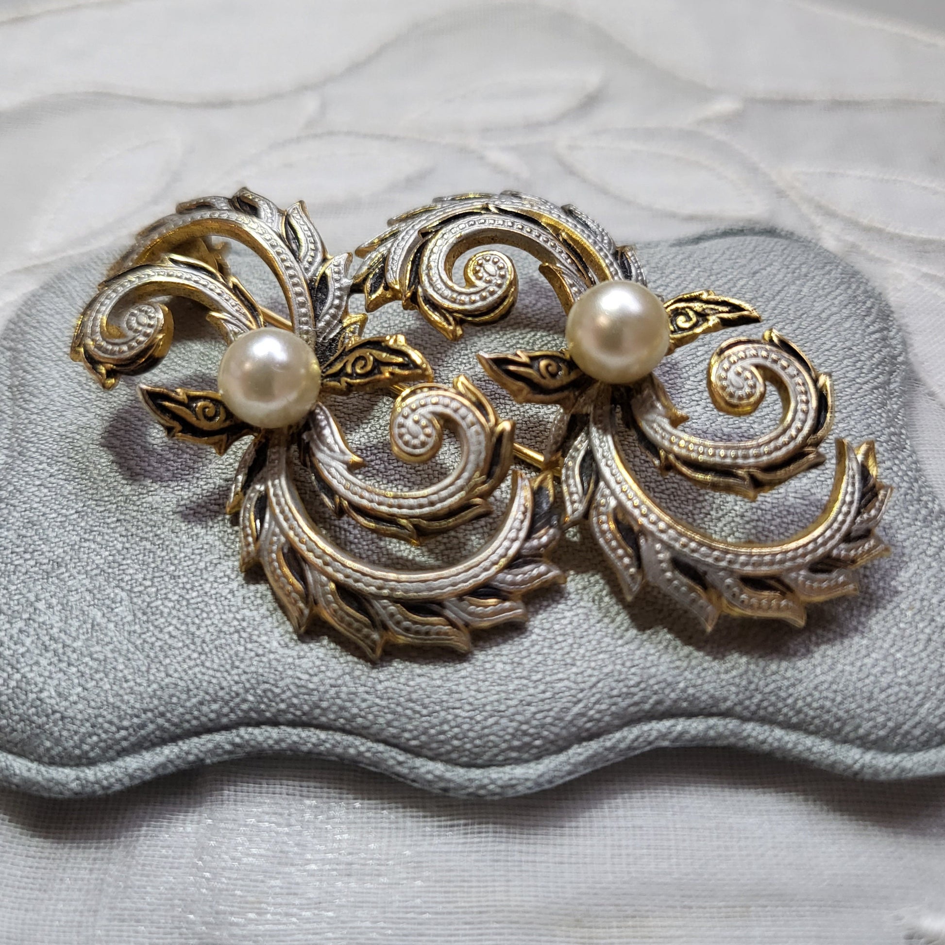 A very unusual damascene twin swirls brooch with faux pearls and enamel on gold plated metal