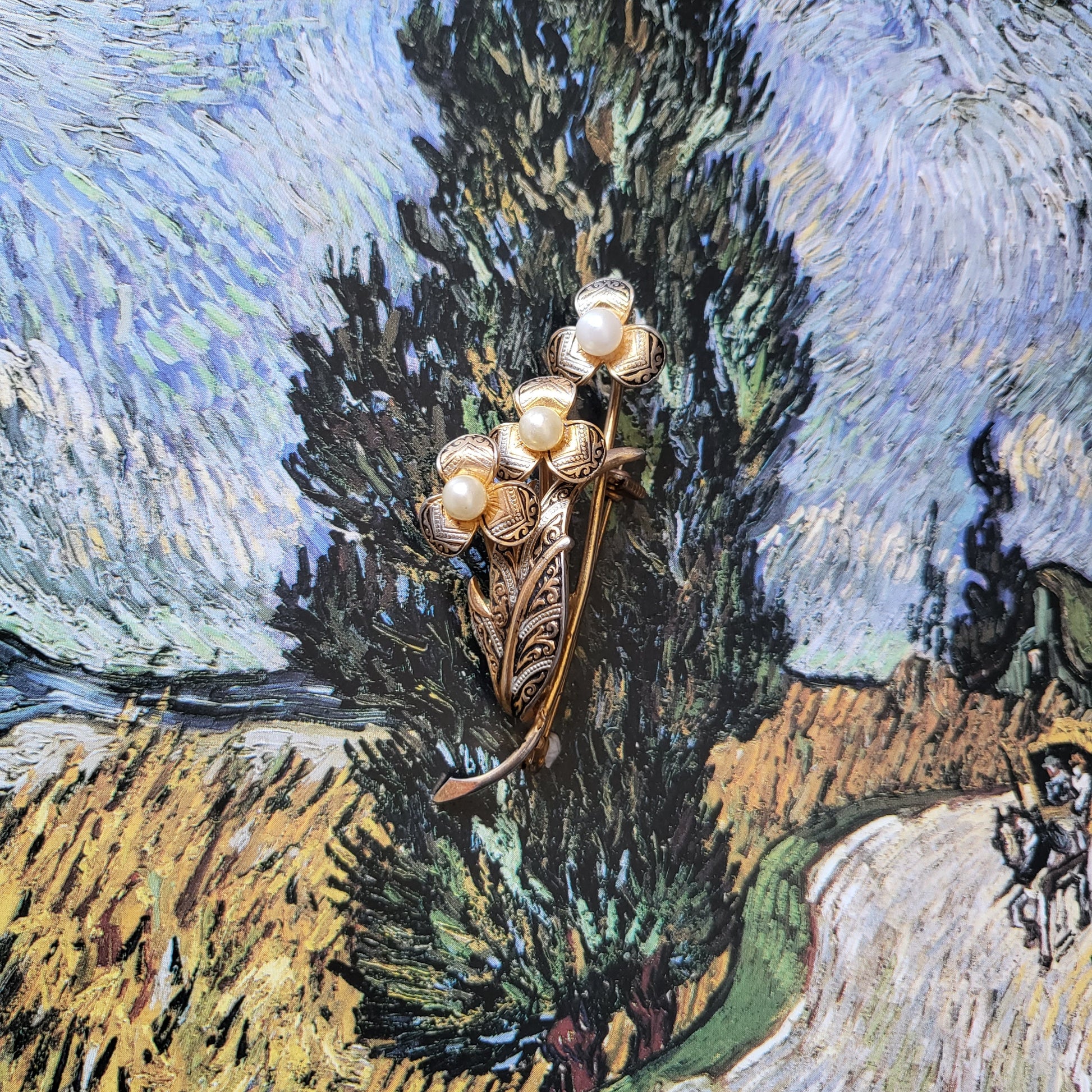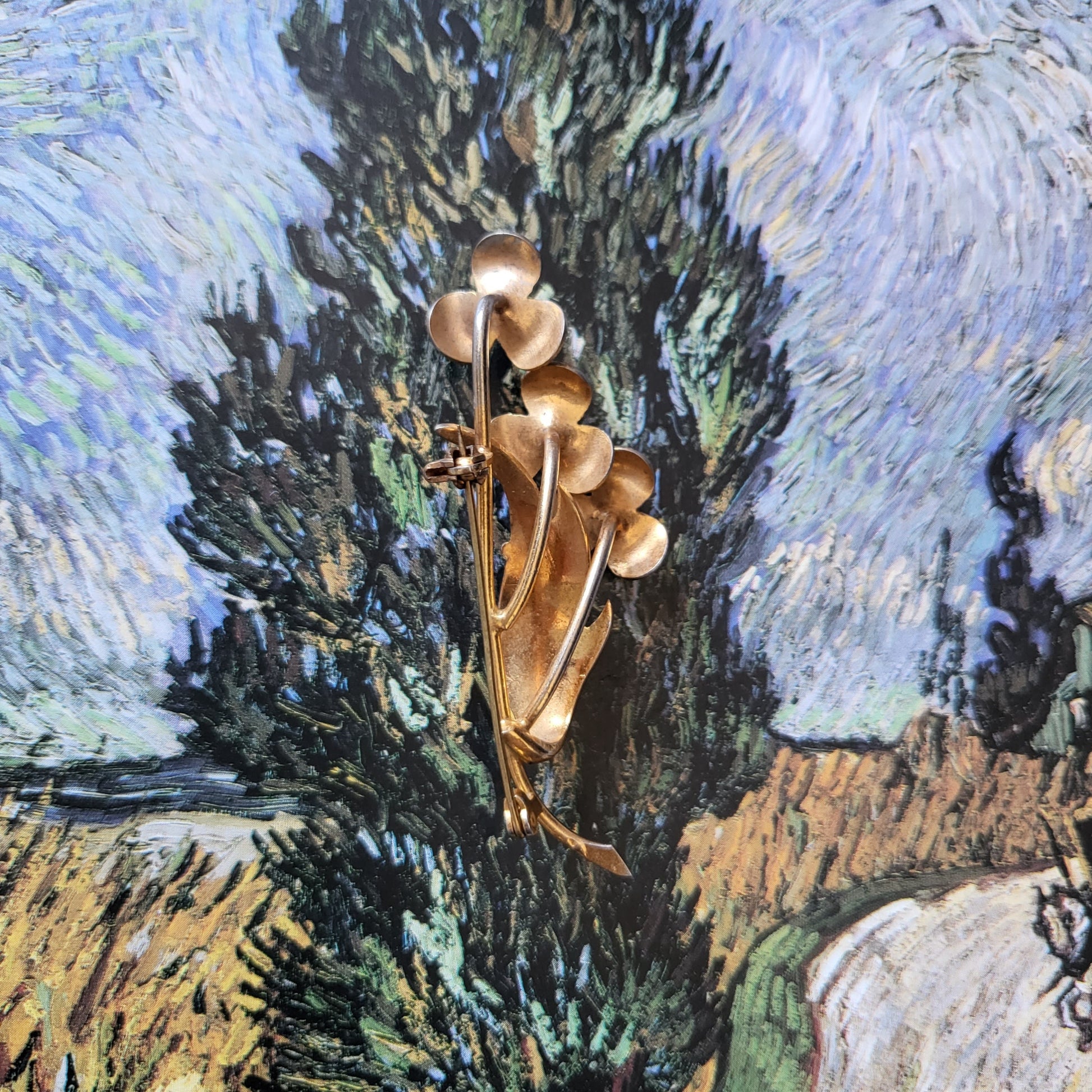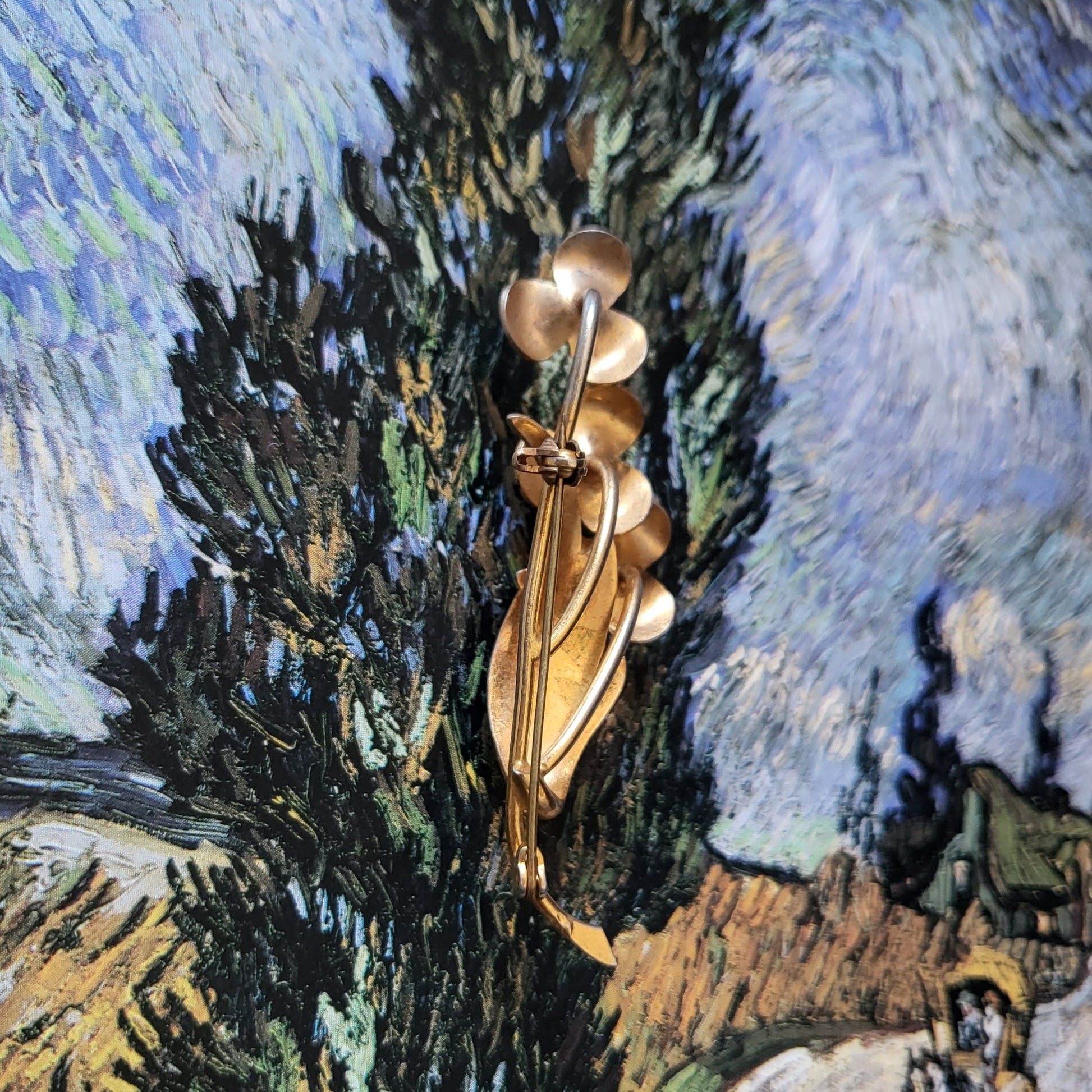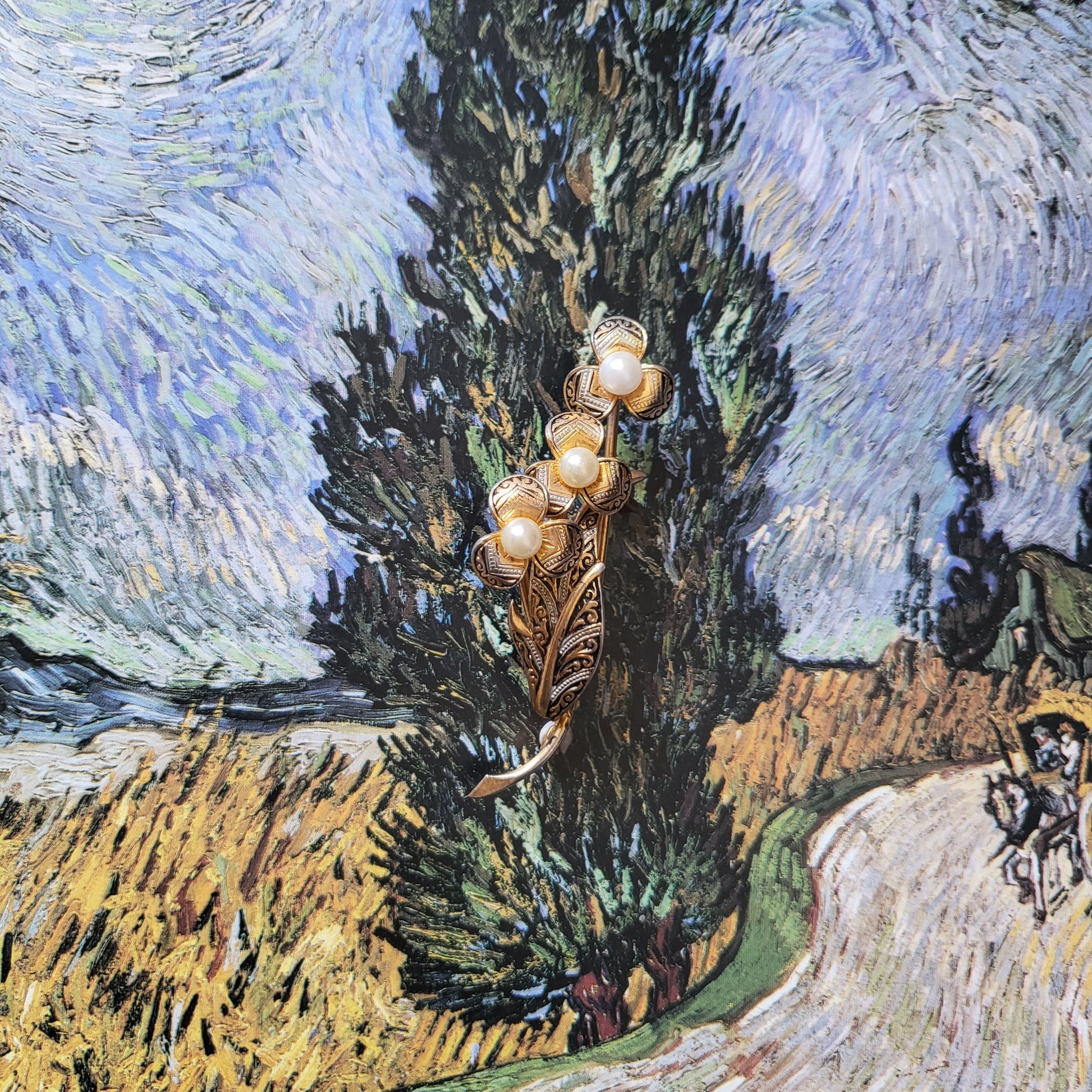 A sweet Spanish Toledo Damascene flowers brooch with faux pearls in gold plated metal