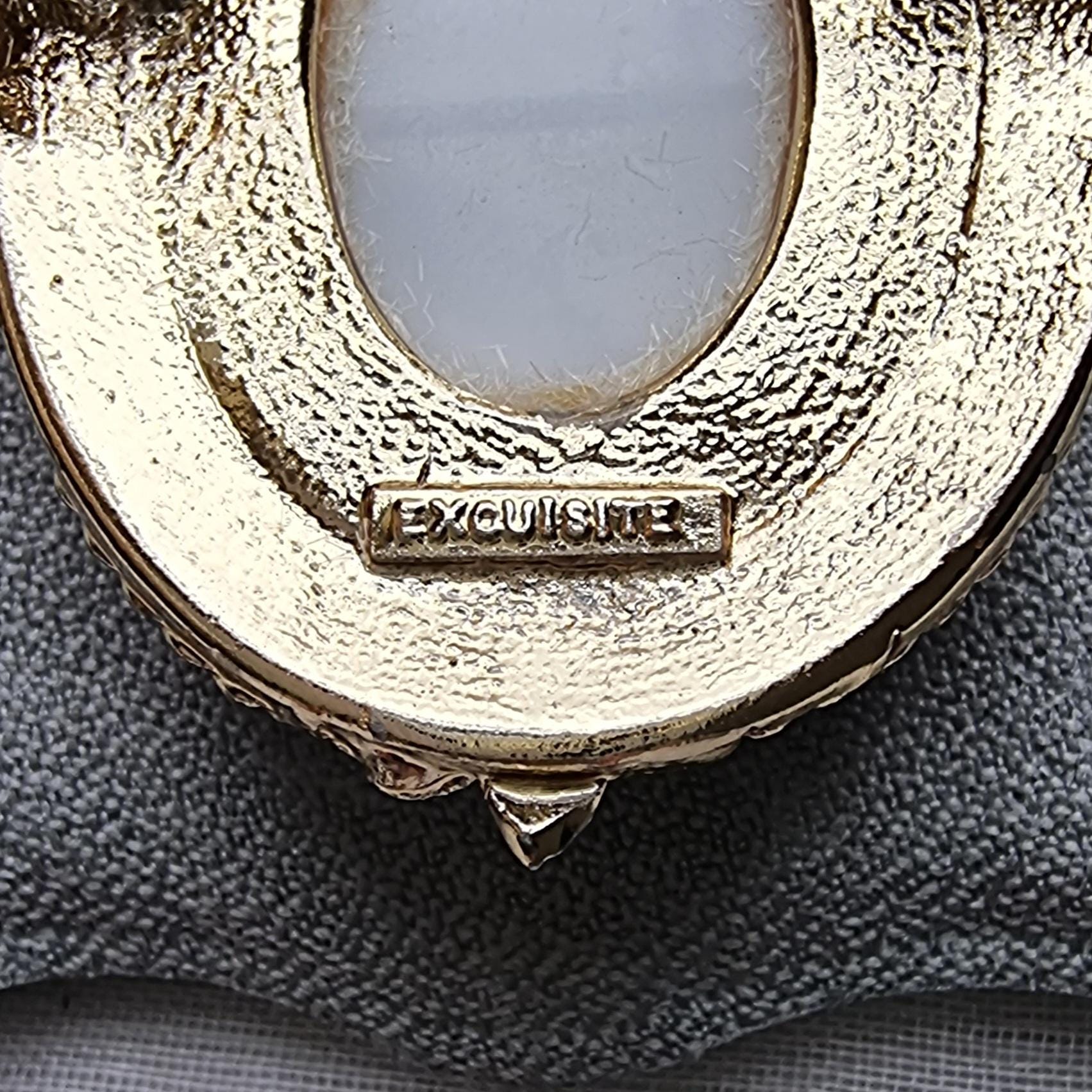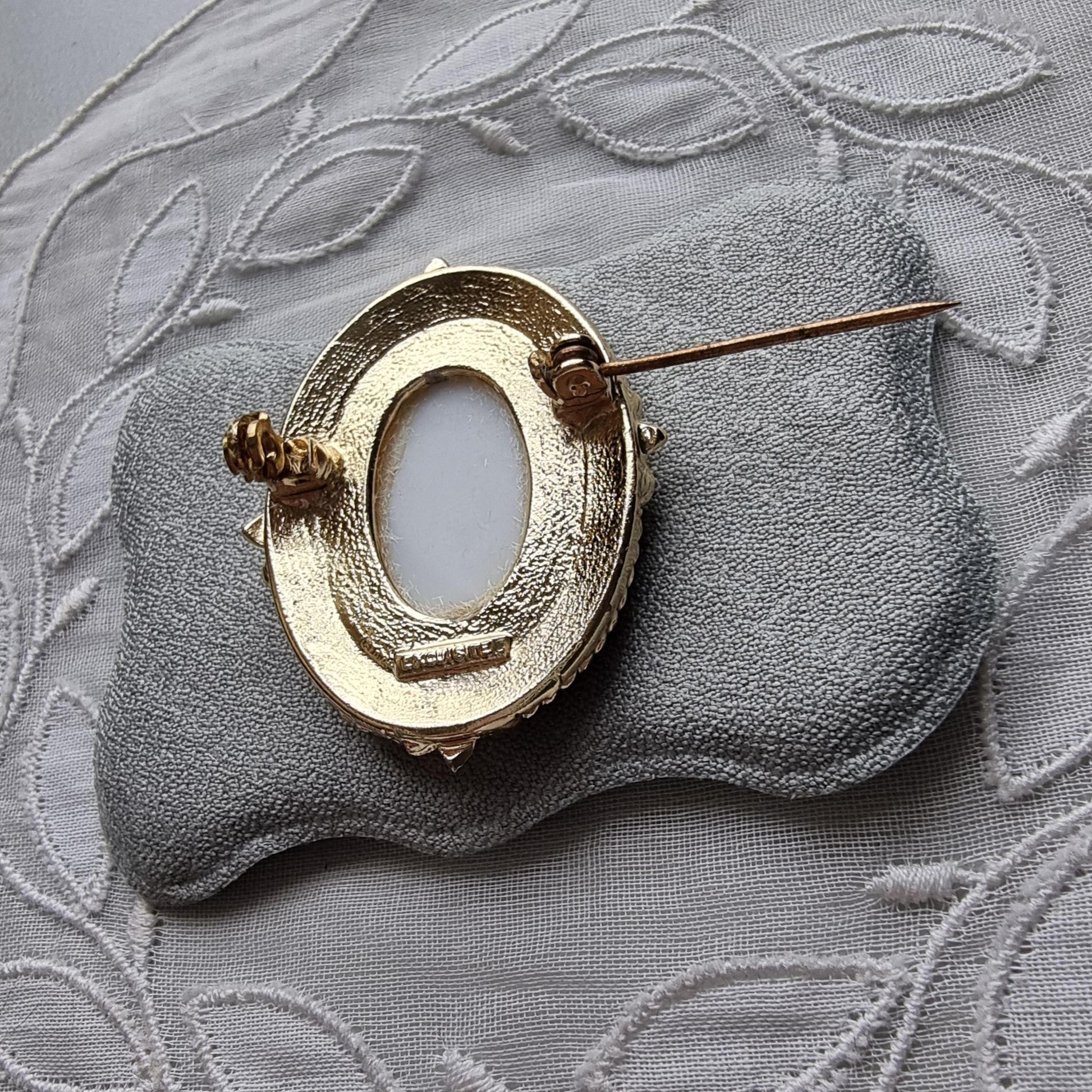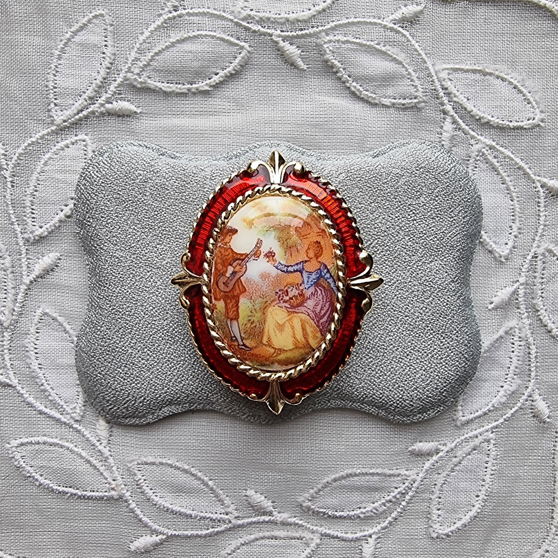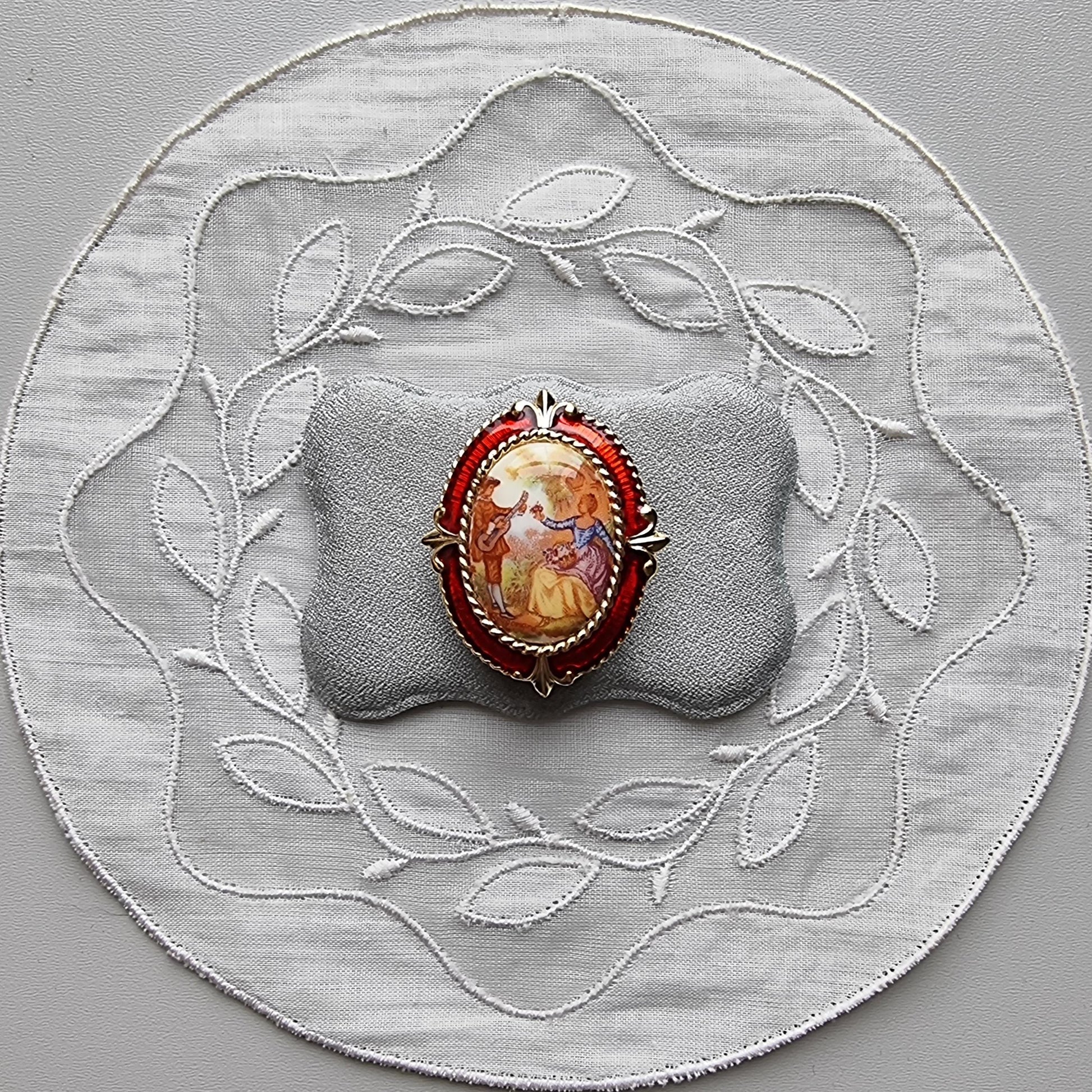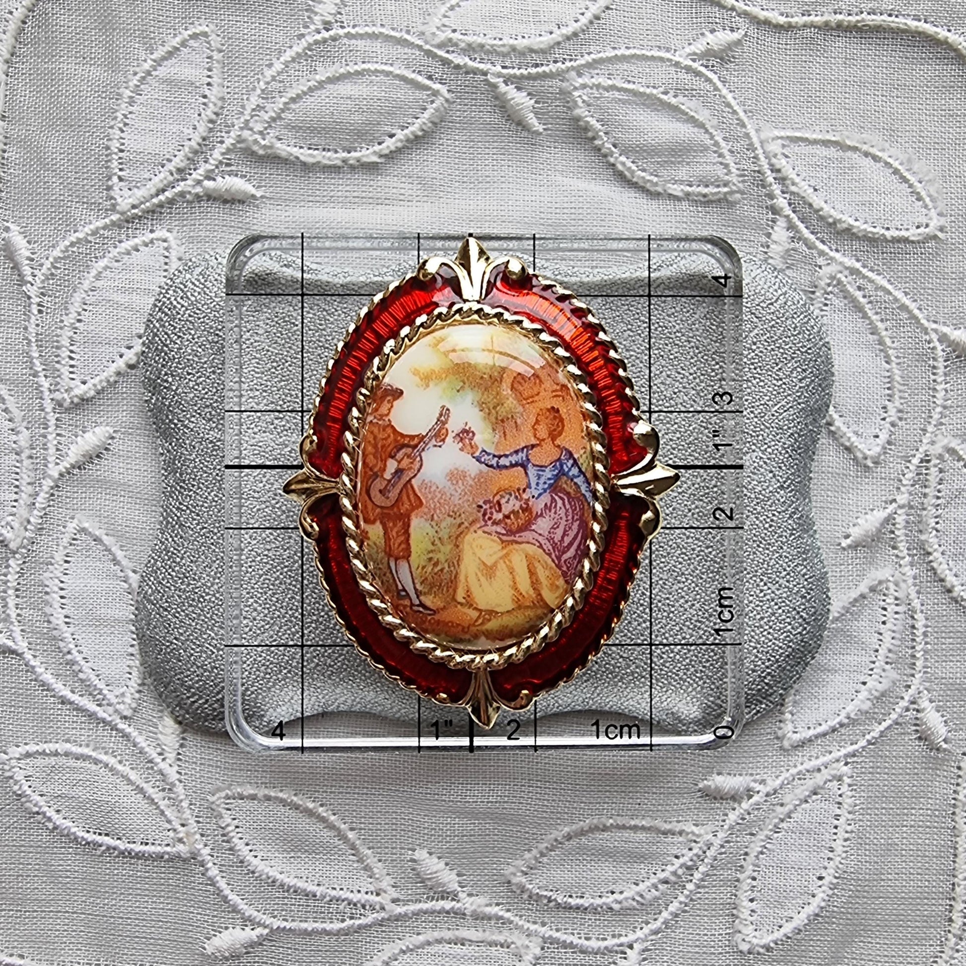 A beautiful painting brooch by Exquisite with a printed plaque accented by red enamel on gold plated metal