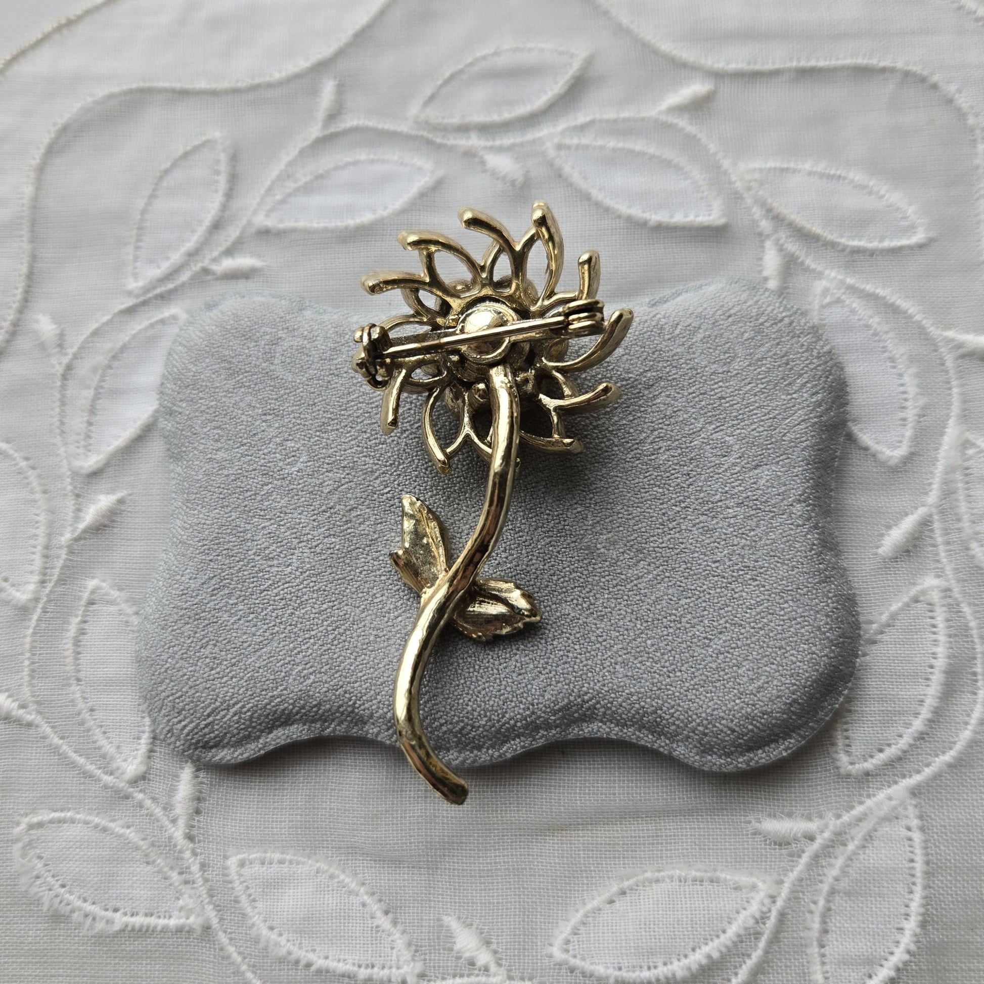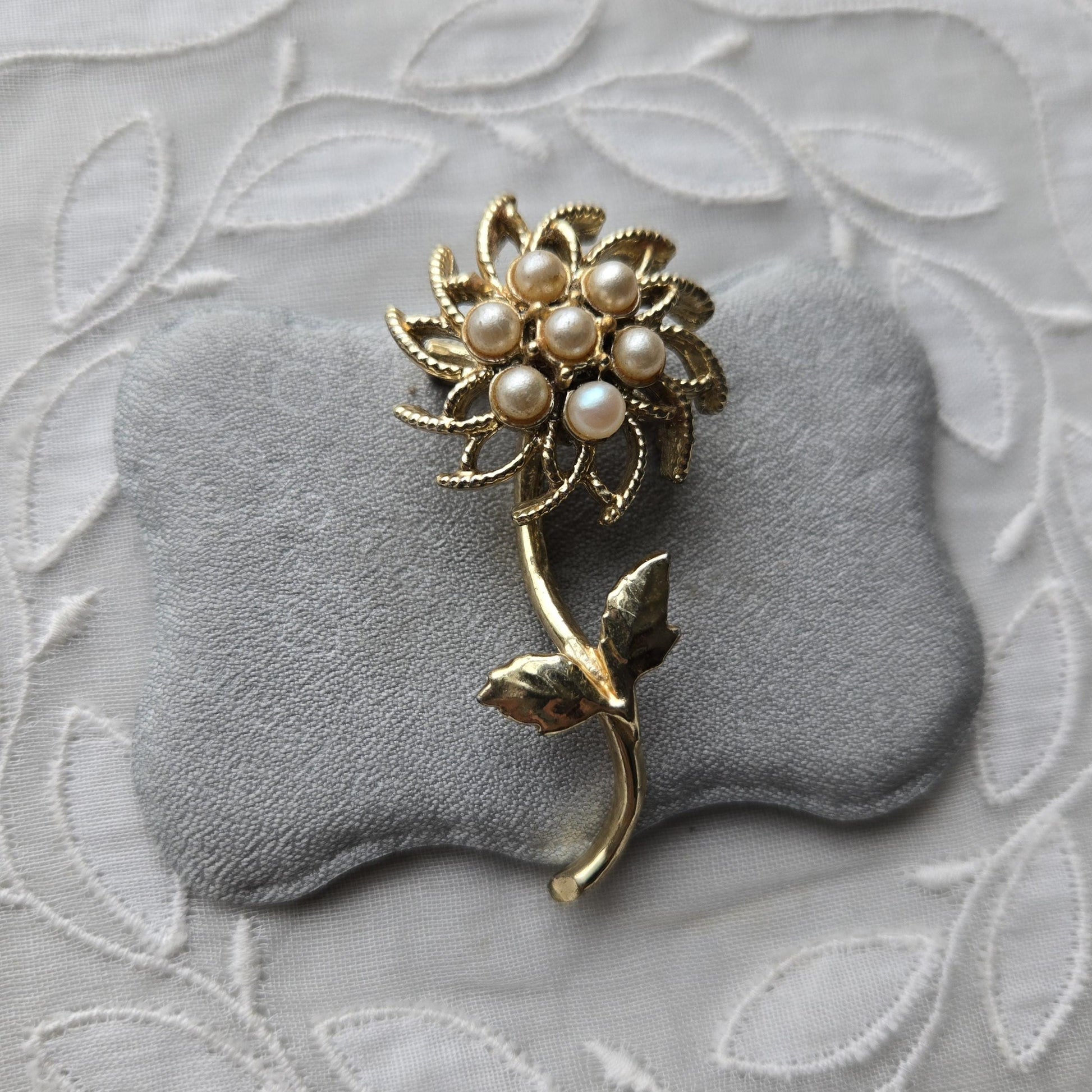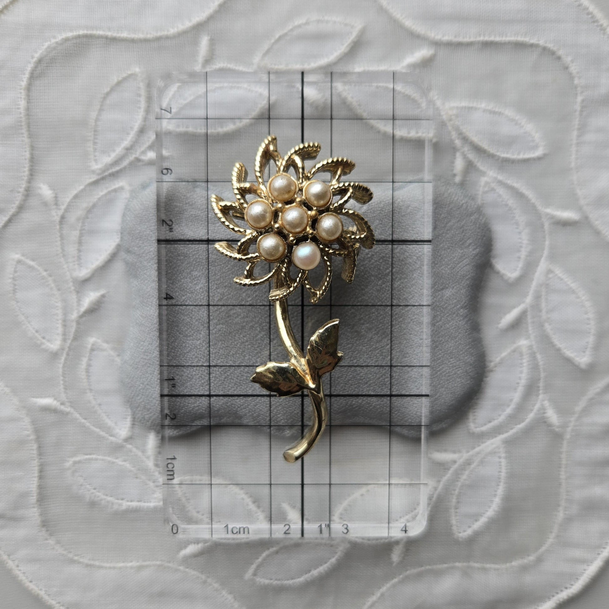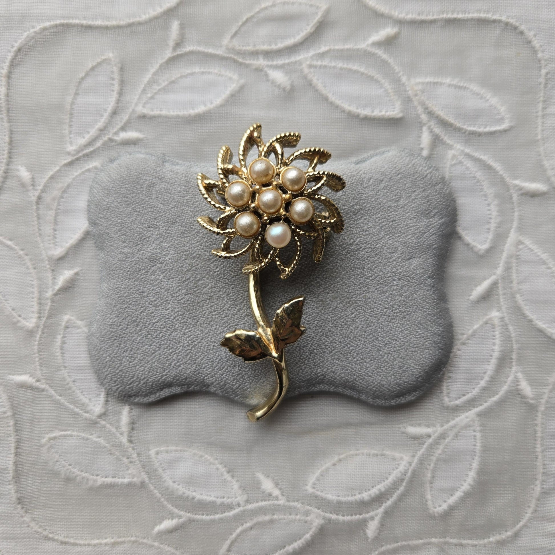 A sweet flower stem brooch with faux pearls on gold plated metal