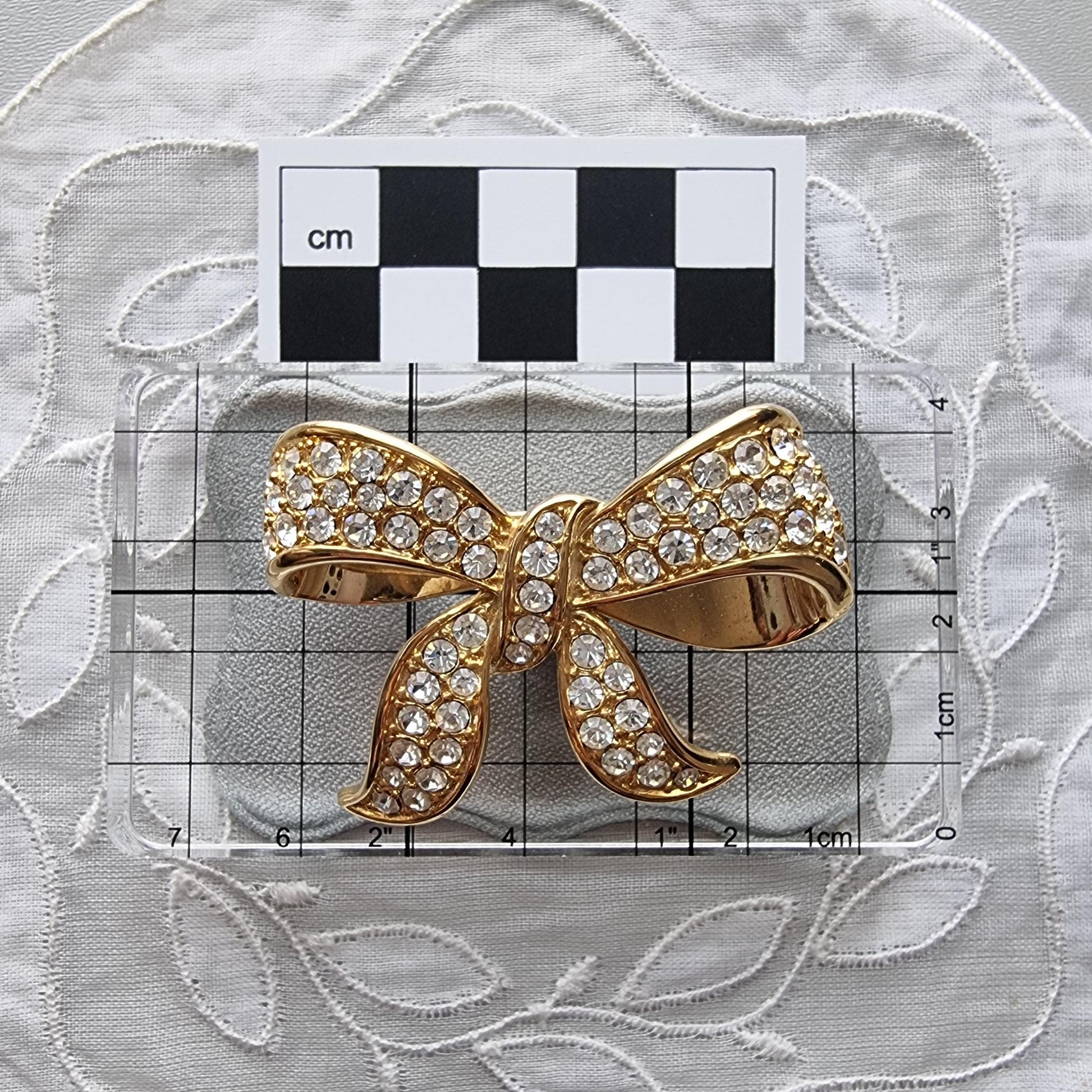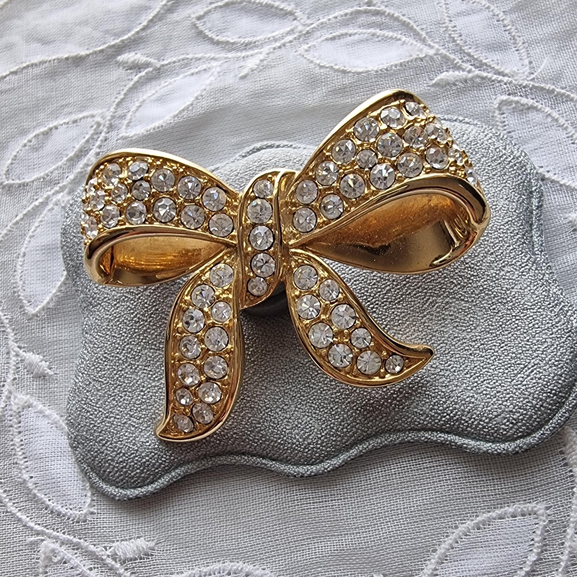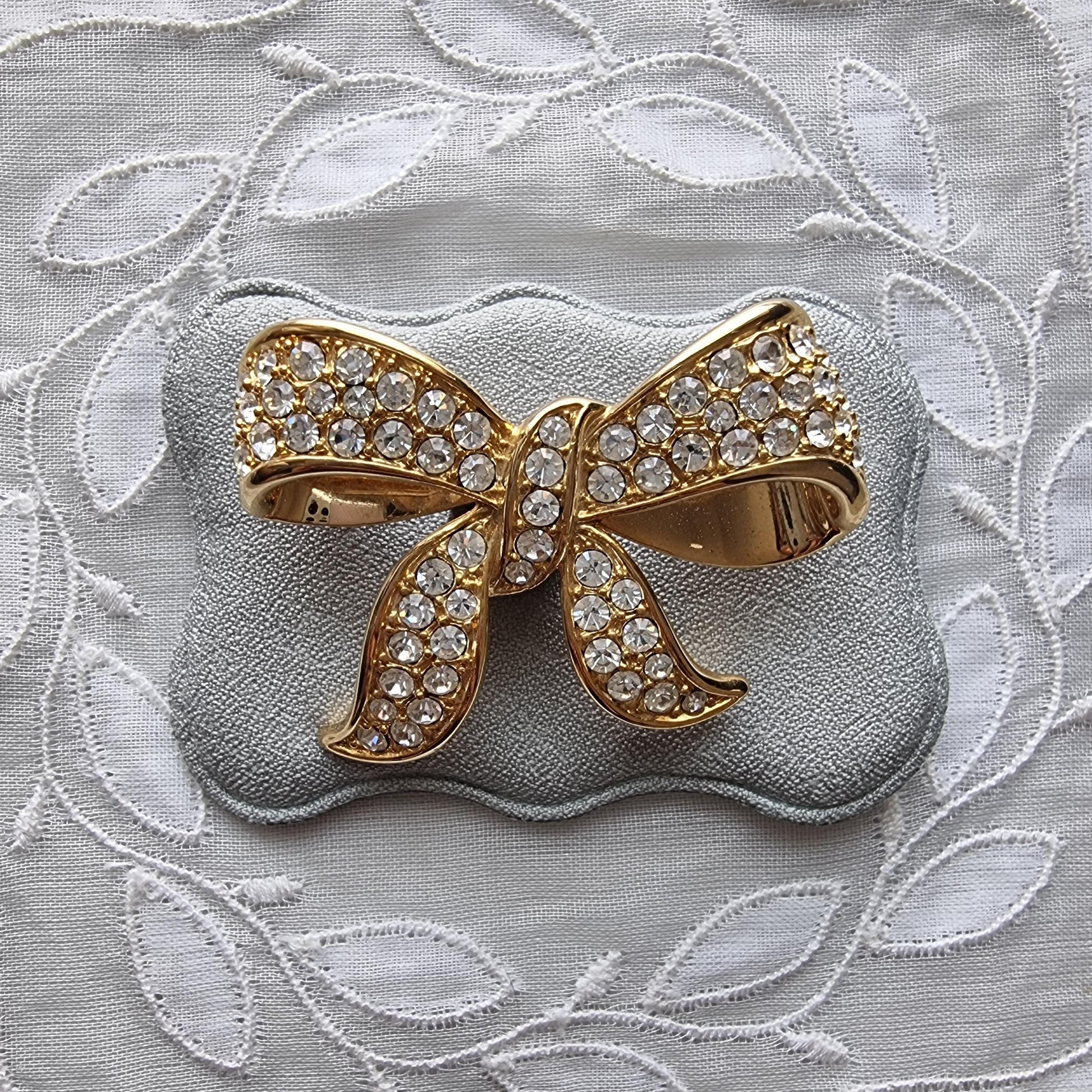 A sweet bow brooch encrusted with clear crystals on gold plated metal