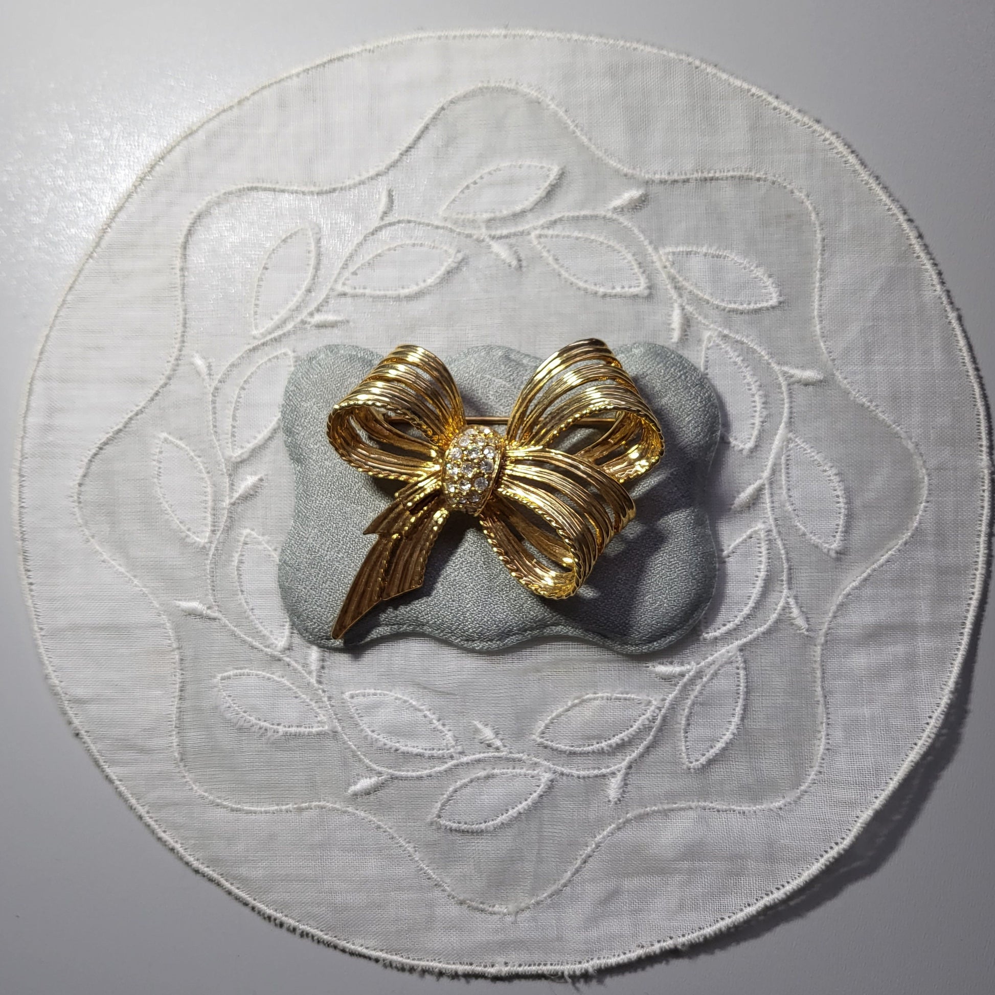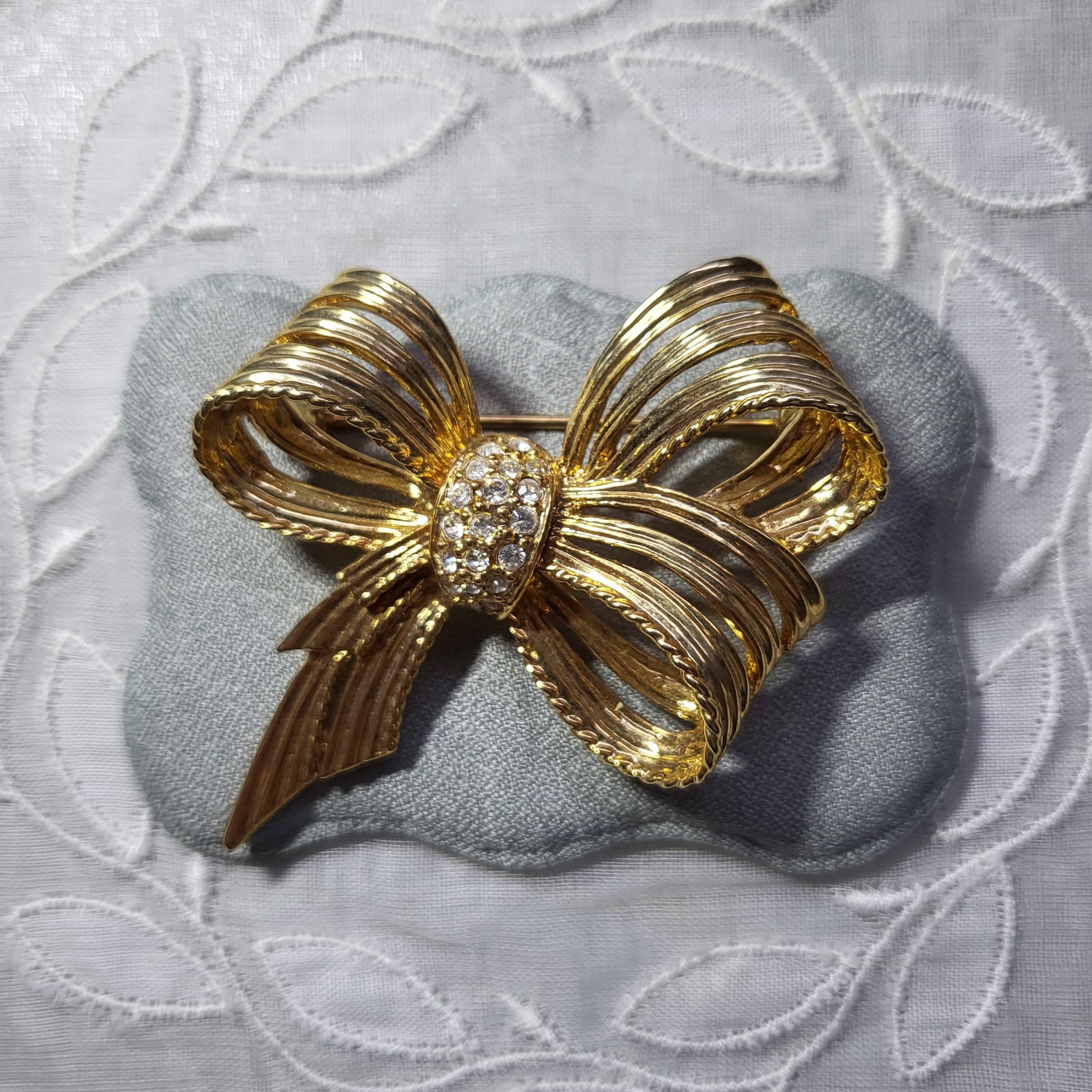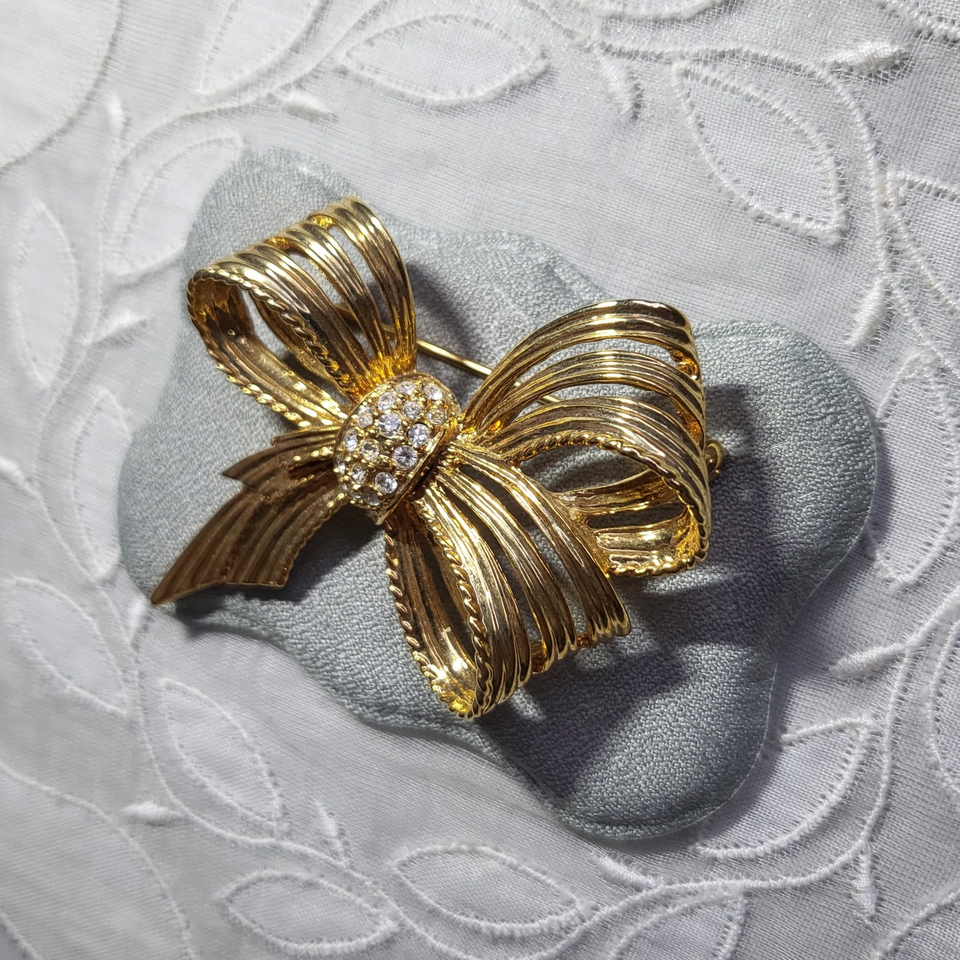 A beautiful bow brooch accented with crystal centre in gold plated metal