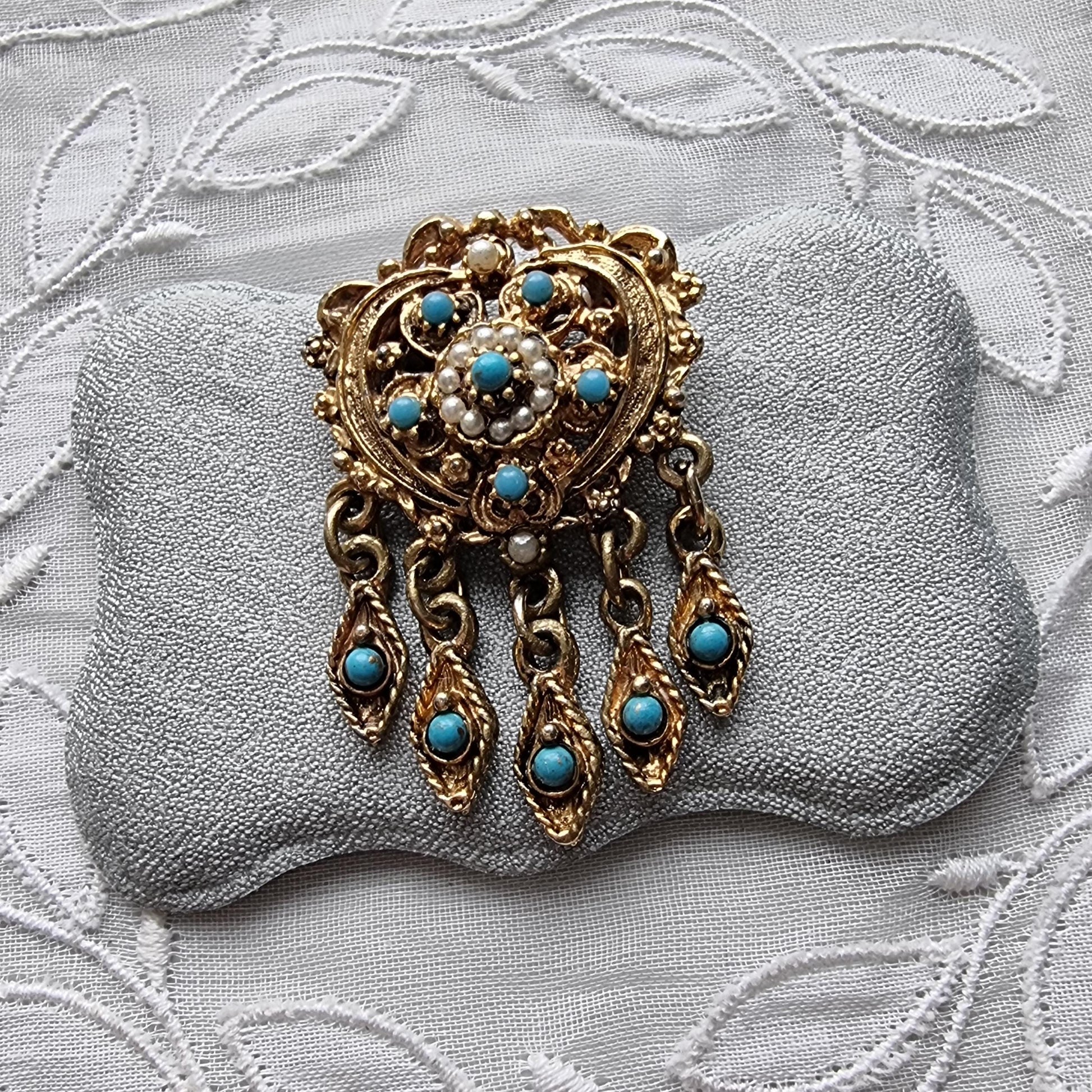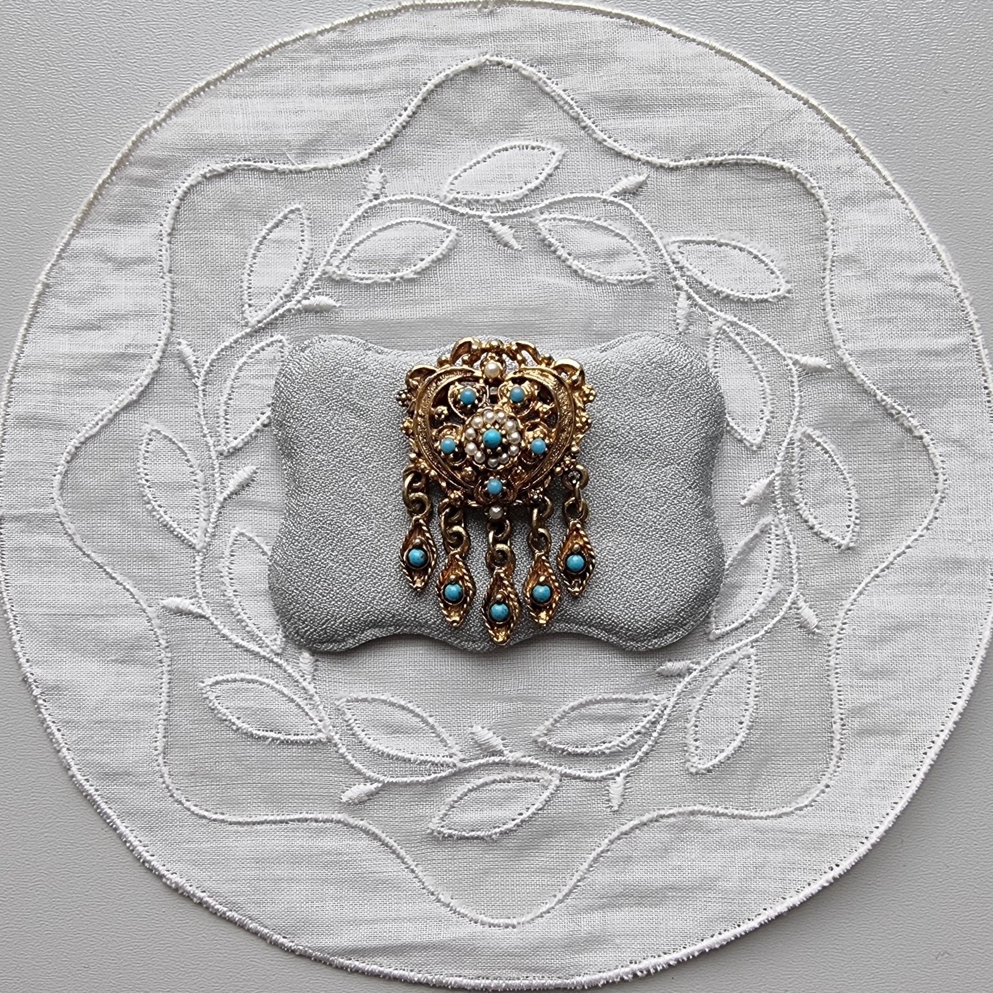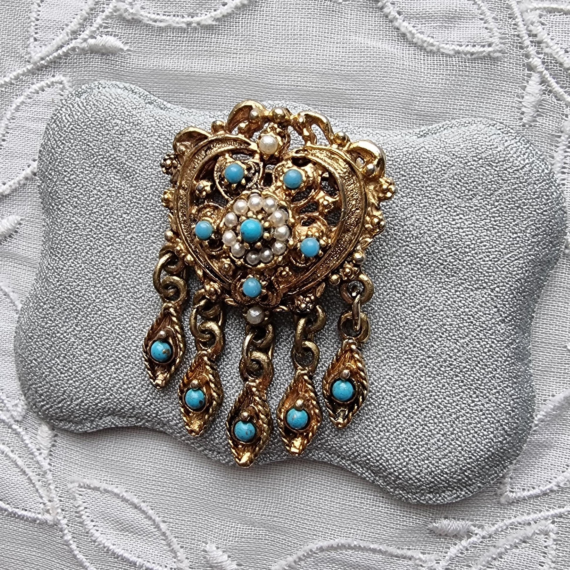 Brooch - Gold Heart Seed Pearl and Turquoise Drops Pendant Brooch
