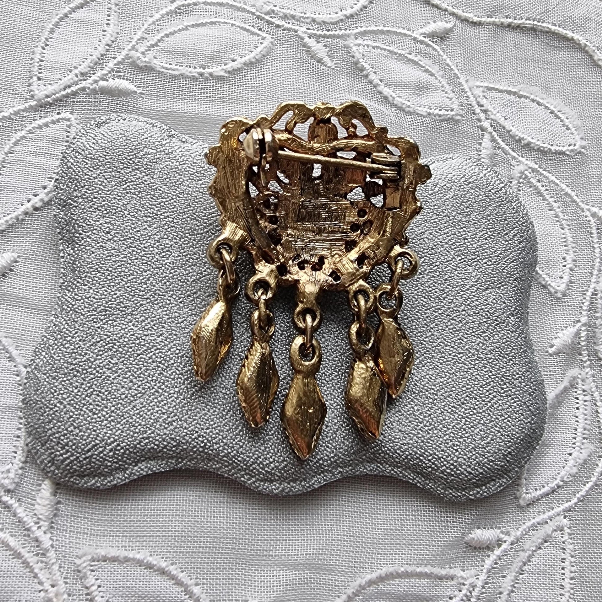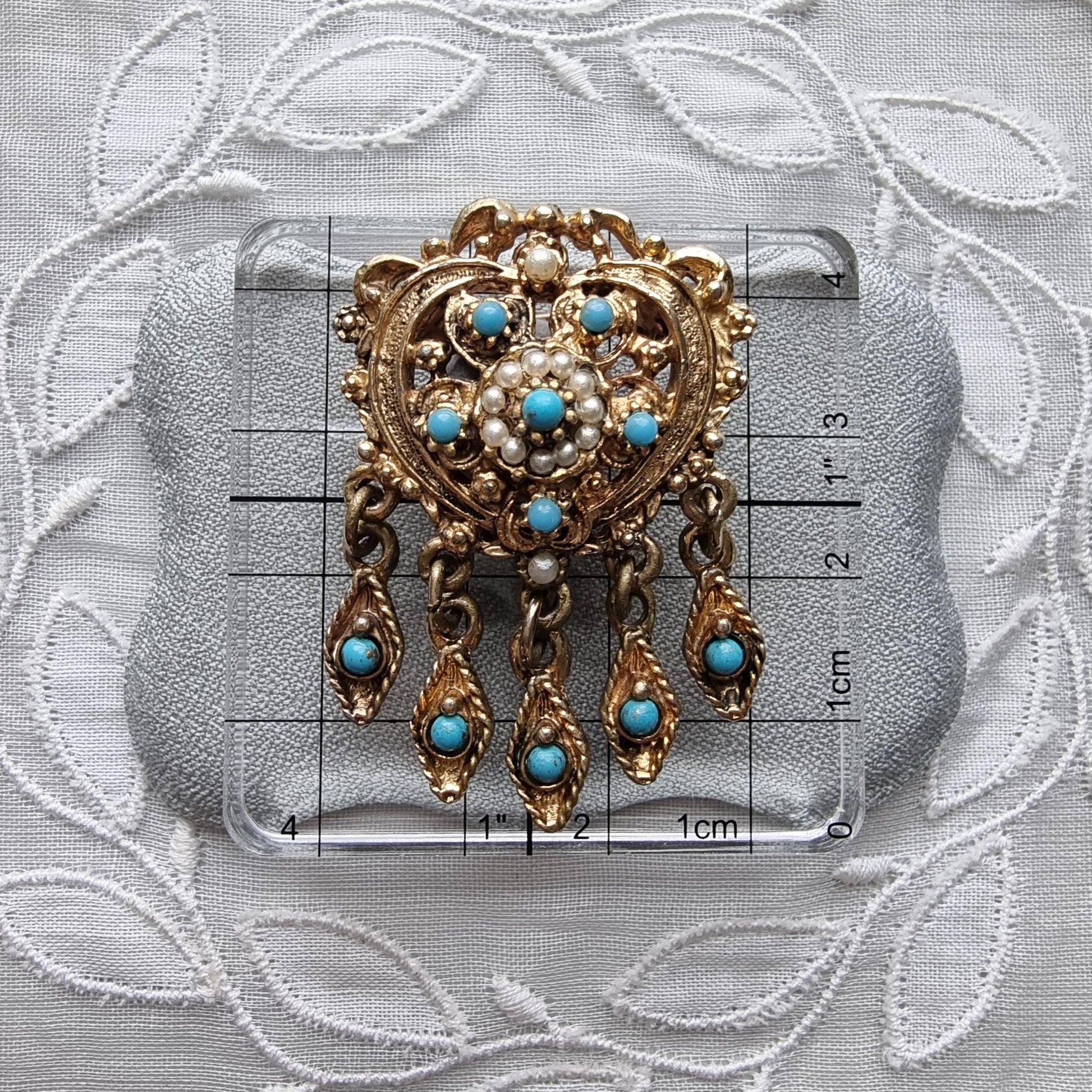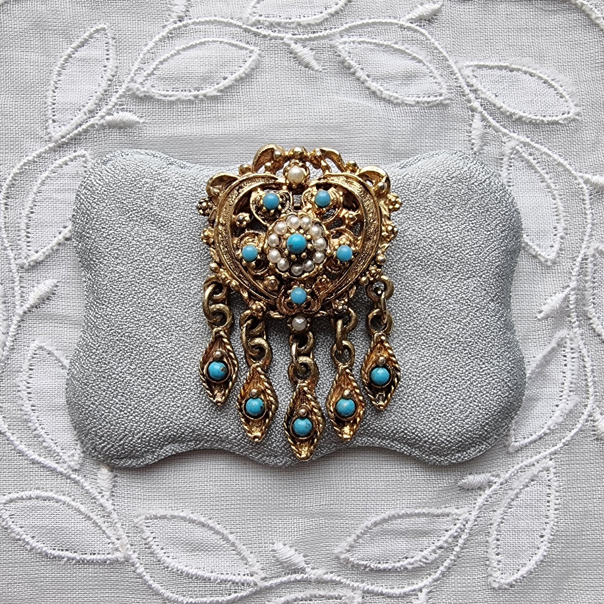 Brooch - Gold Heart Seed Pearl and Turquoise Drops Pendant Brooch