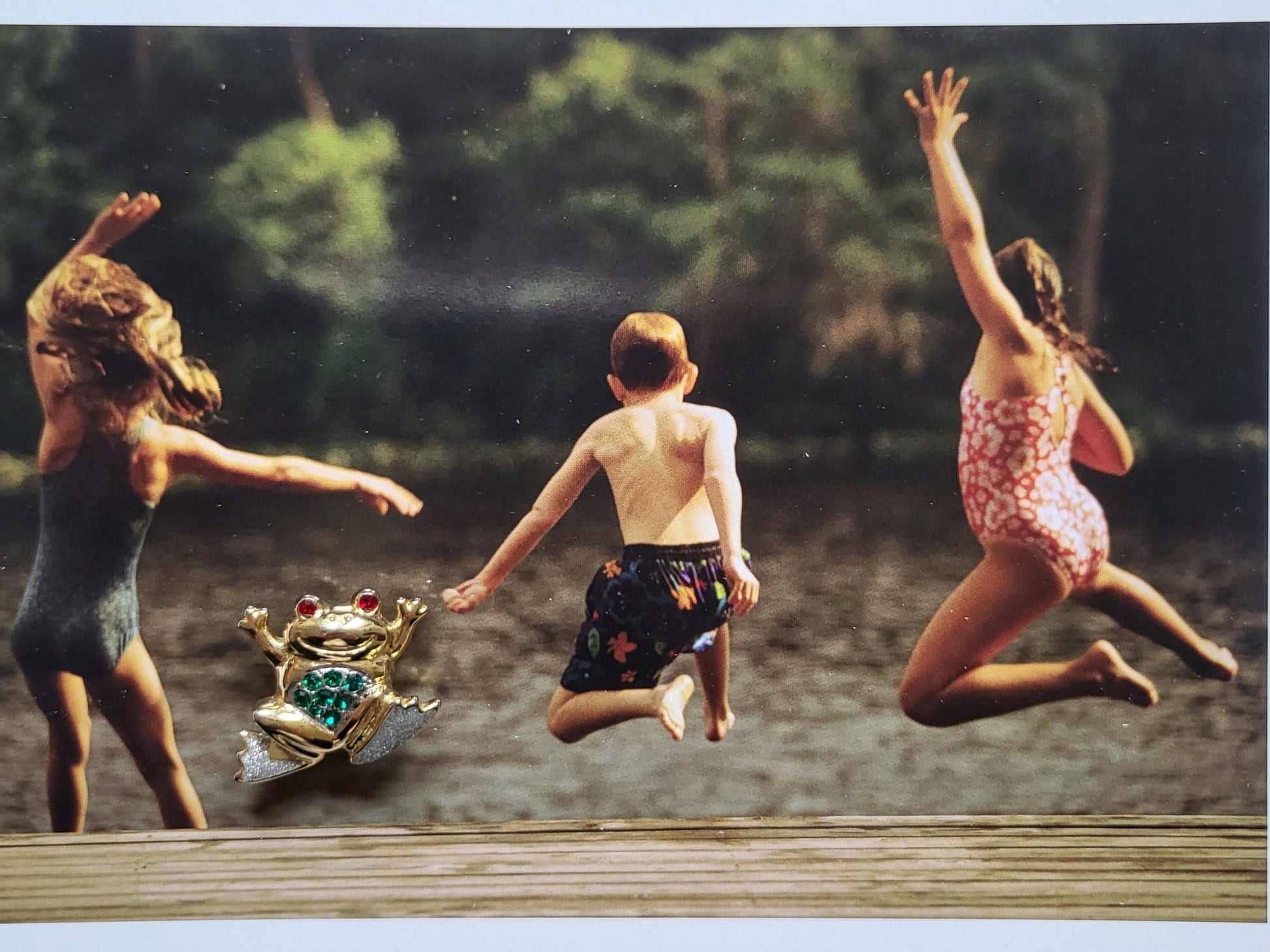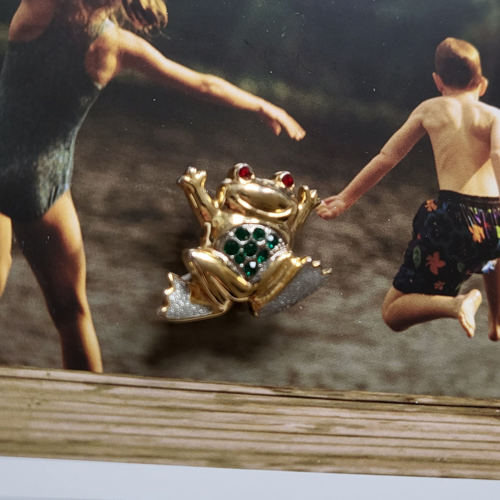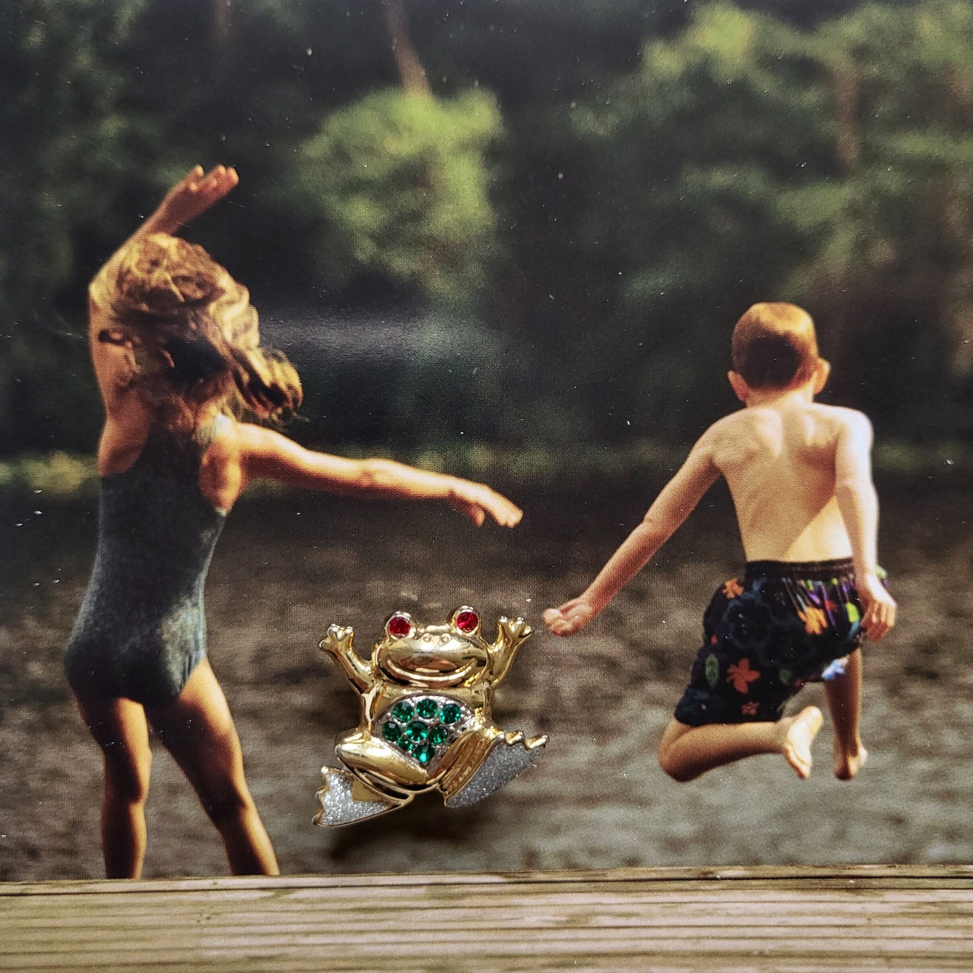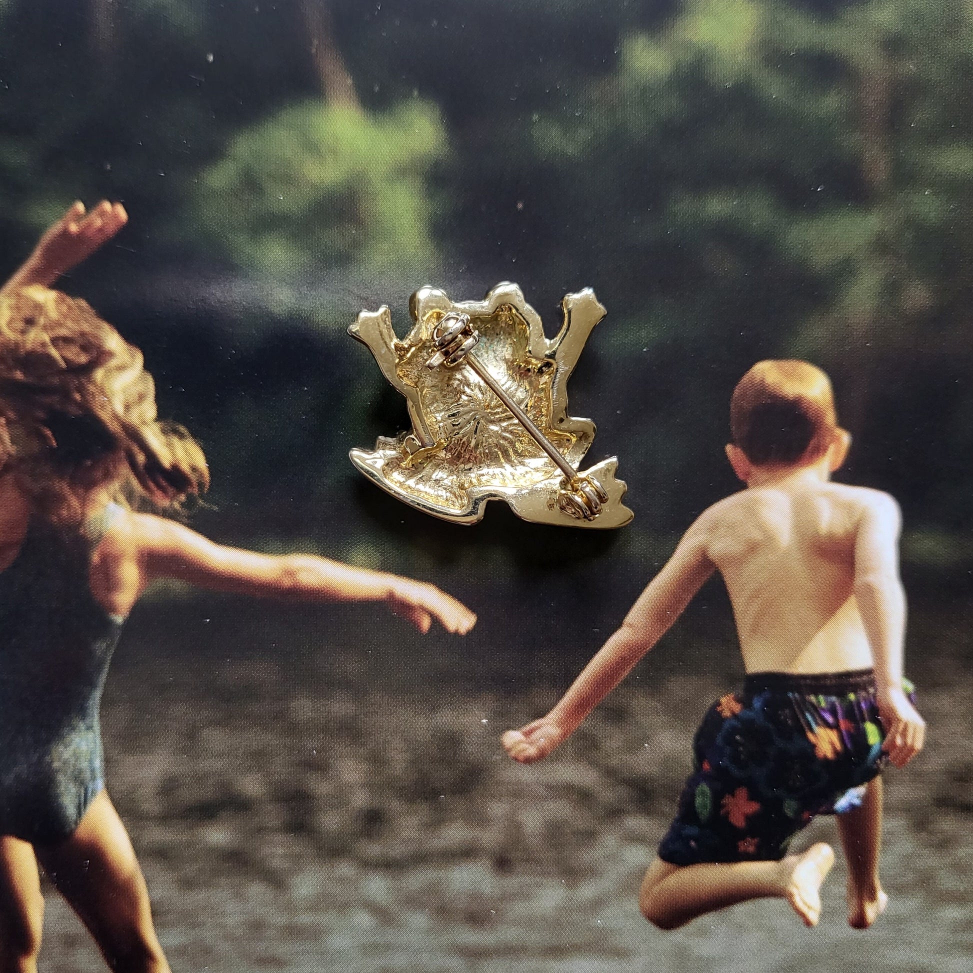 A super fun jumping frog brooch with green crystal belly red crystal eyes and silver glitter enamel feet on polished gold plated metal