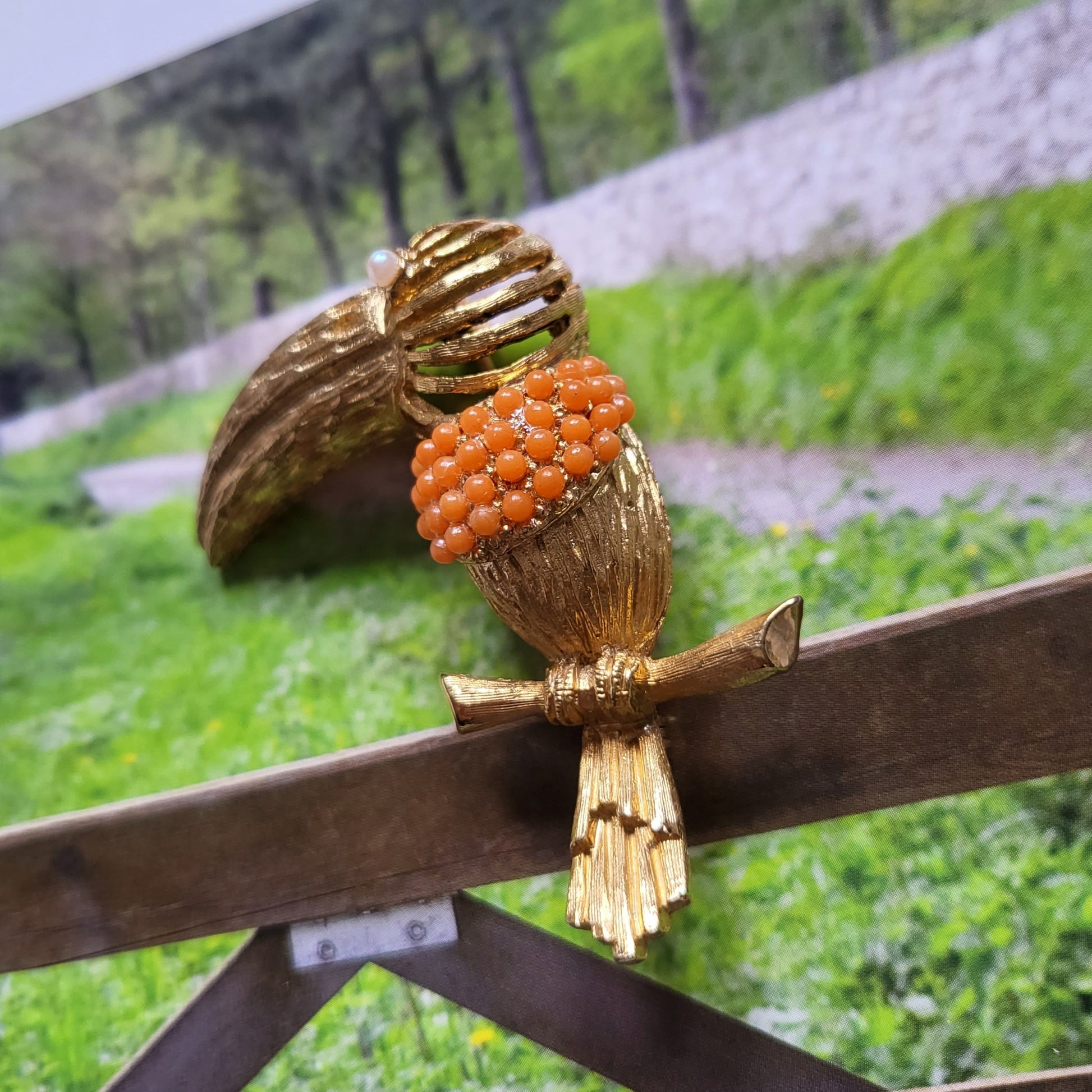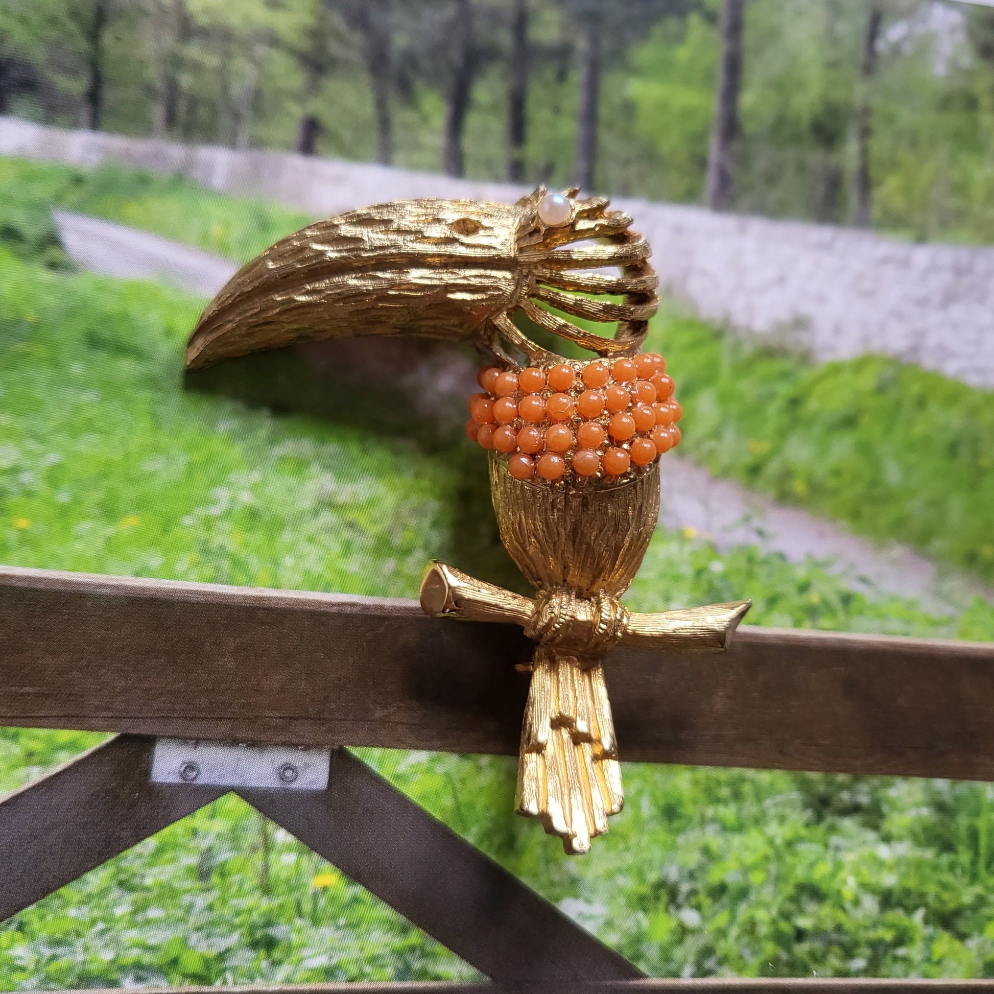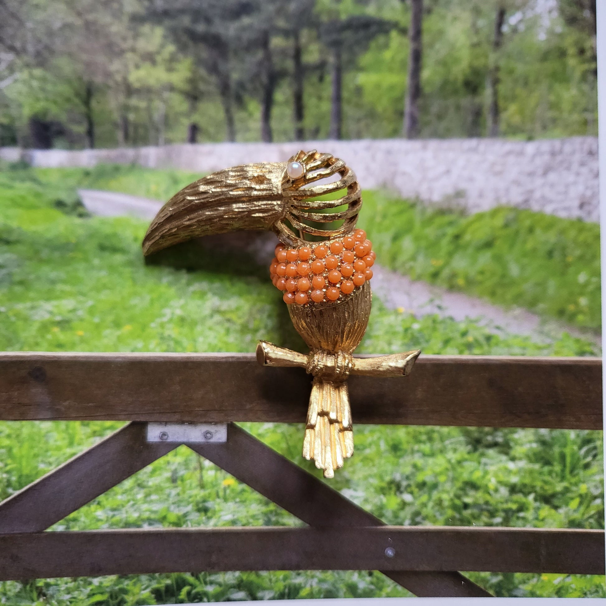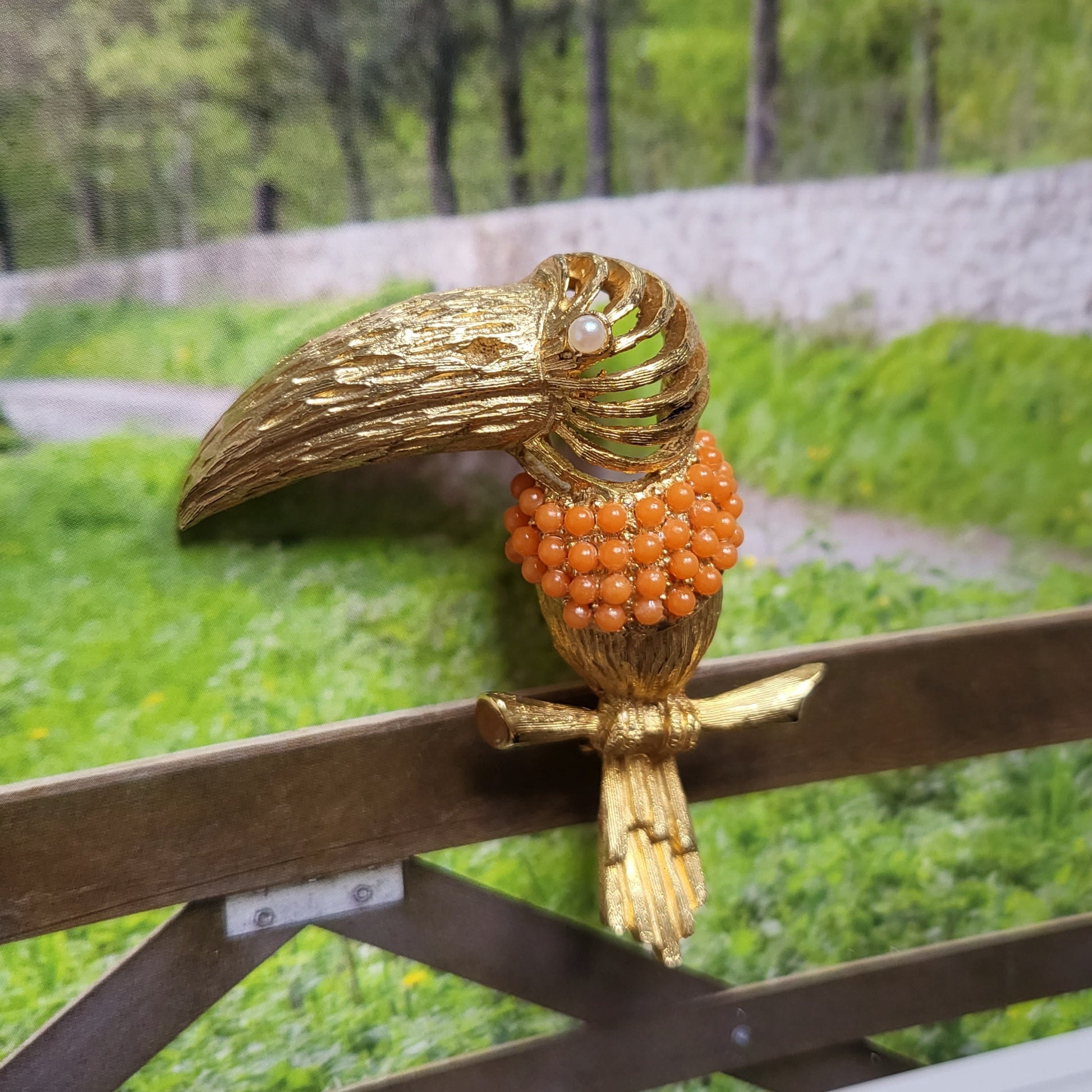A stunning vintage toucan brooch by Hattie Carnegie with coral beaded body and a pearl eye in gold plated metal