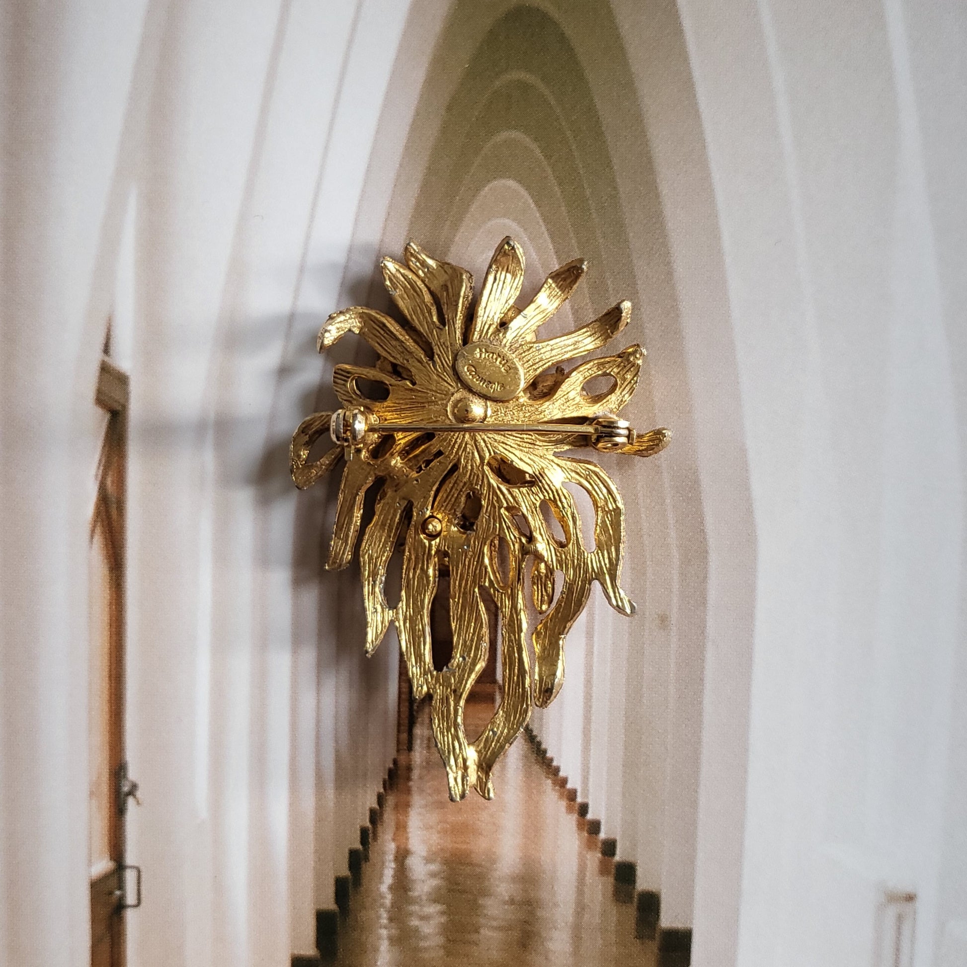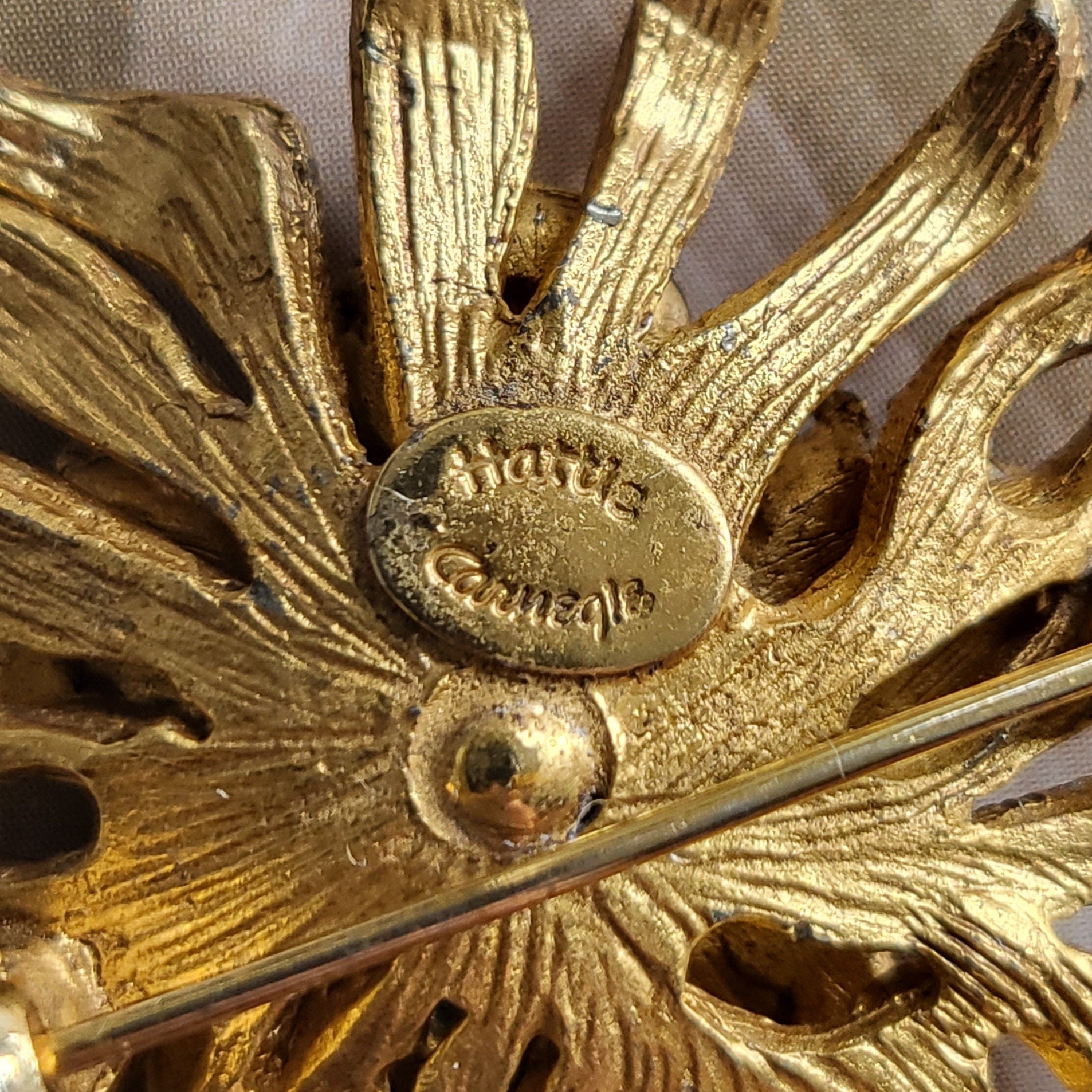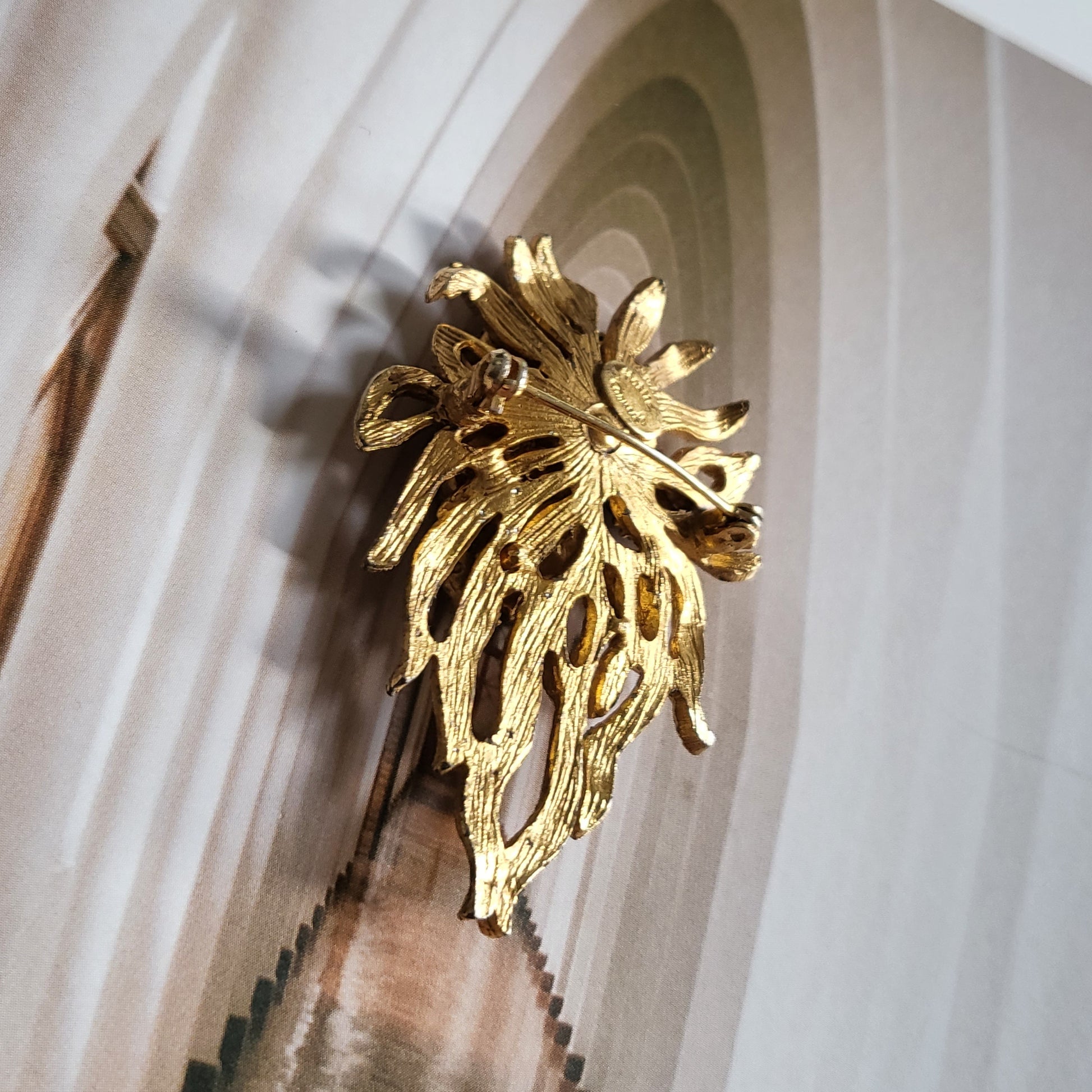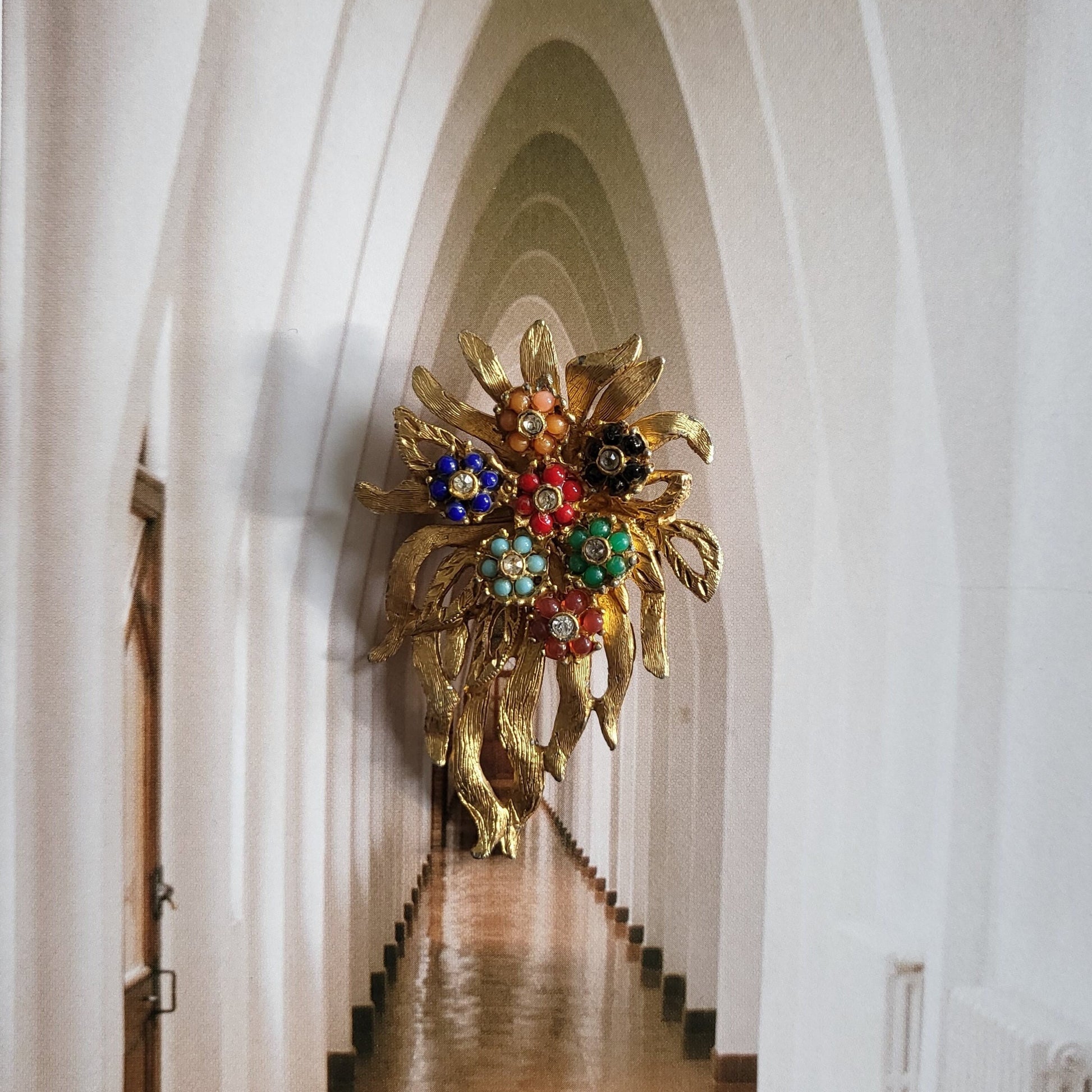 A rare flower bouquet brooch by Hattie Carnegie with small crystals and multicoloured glass beads set on gold plated metal