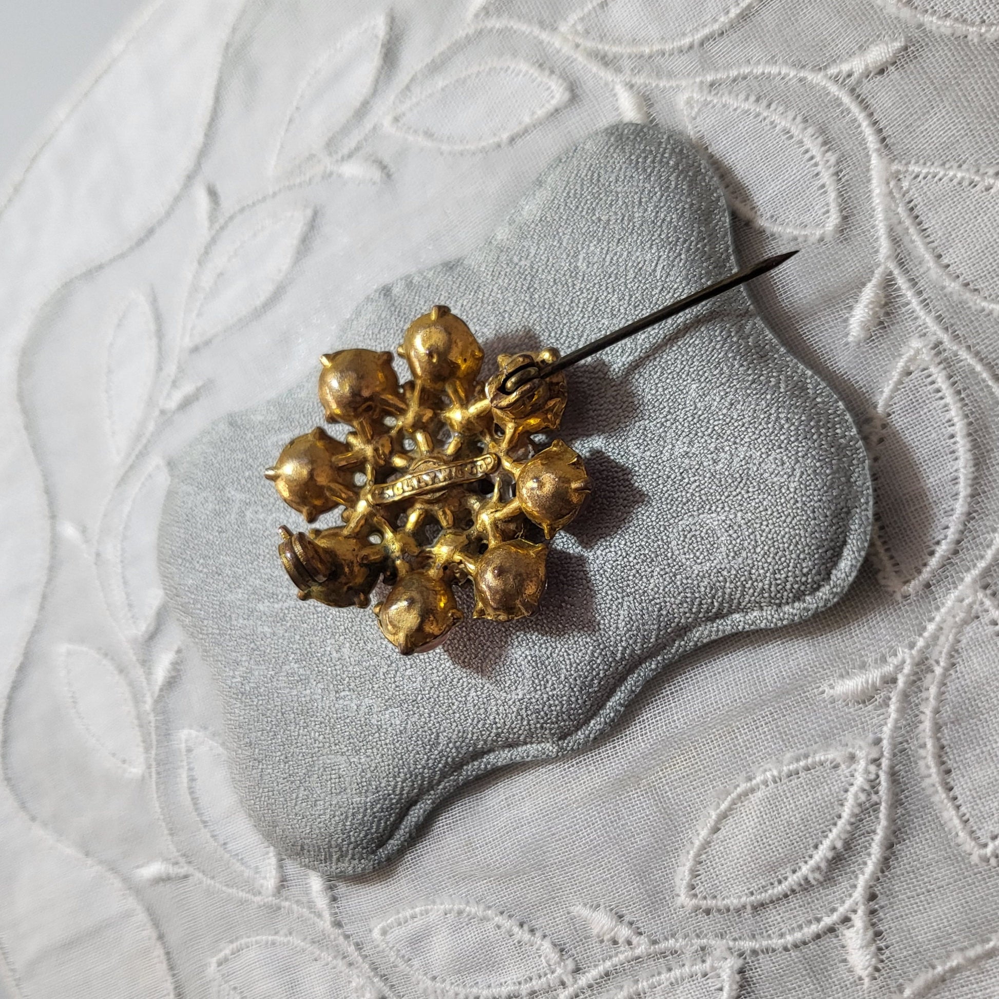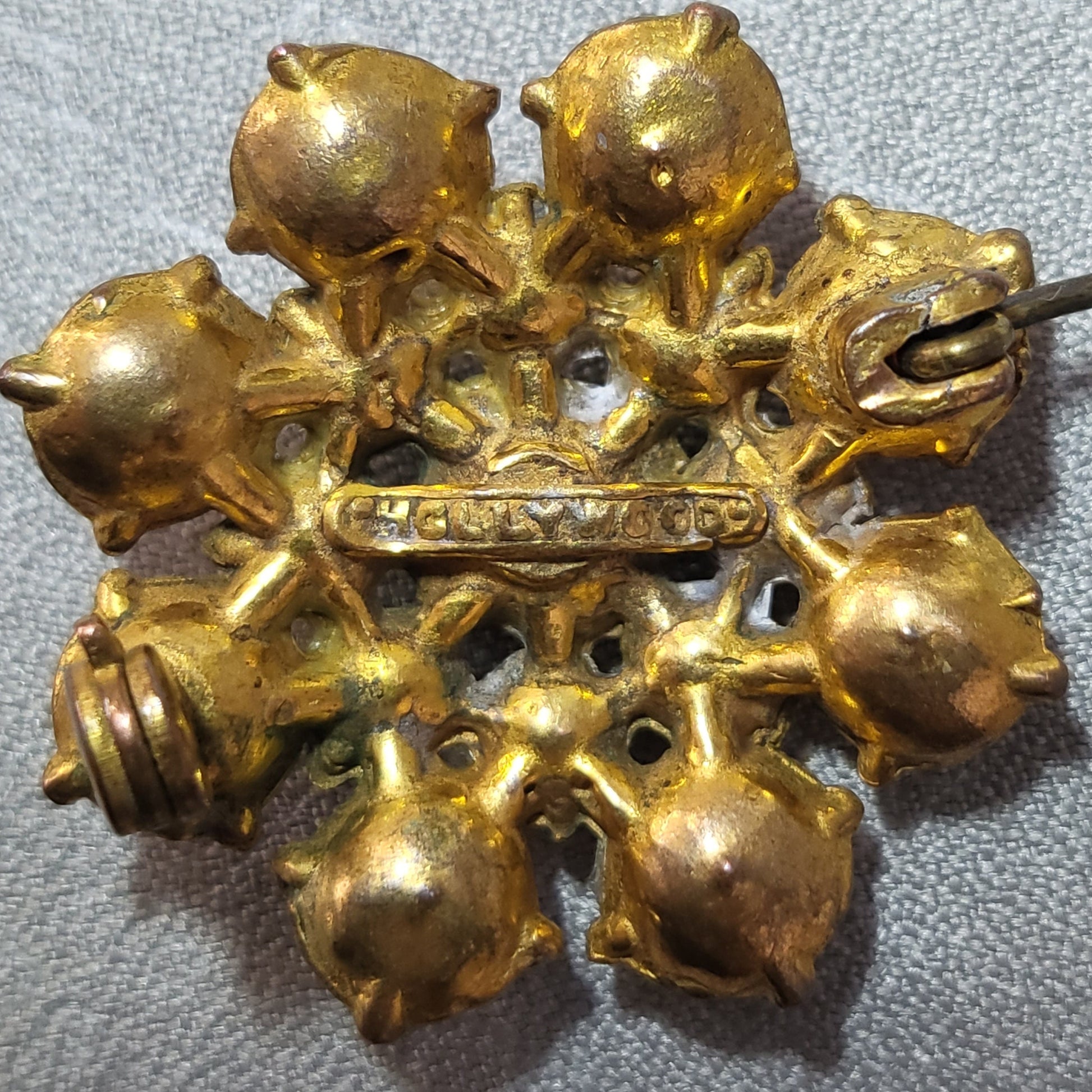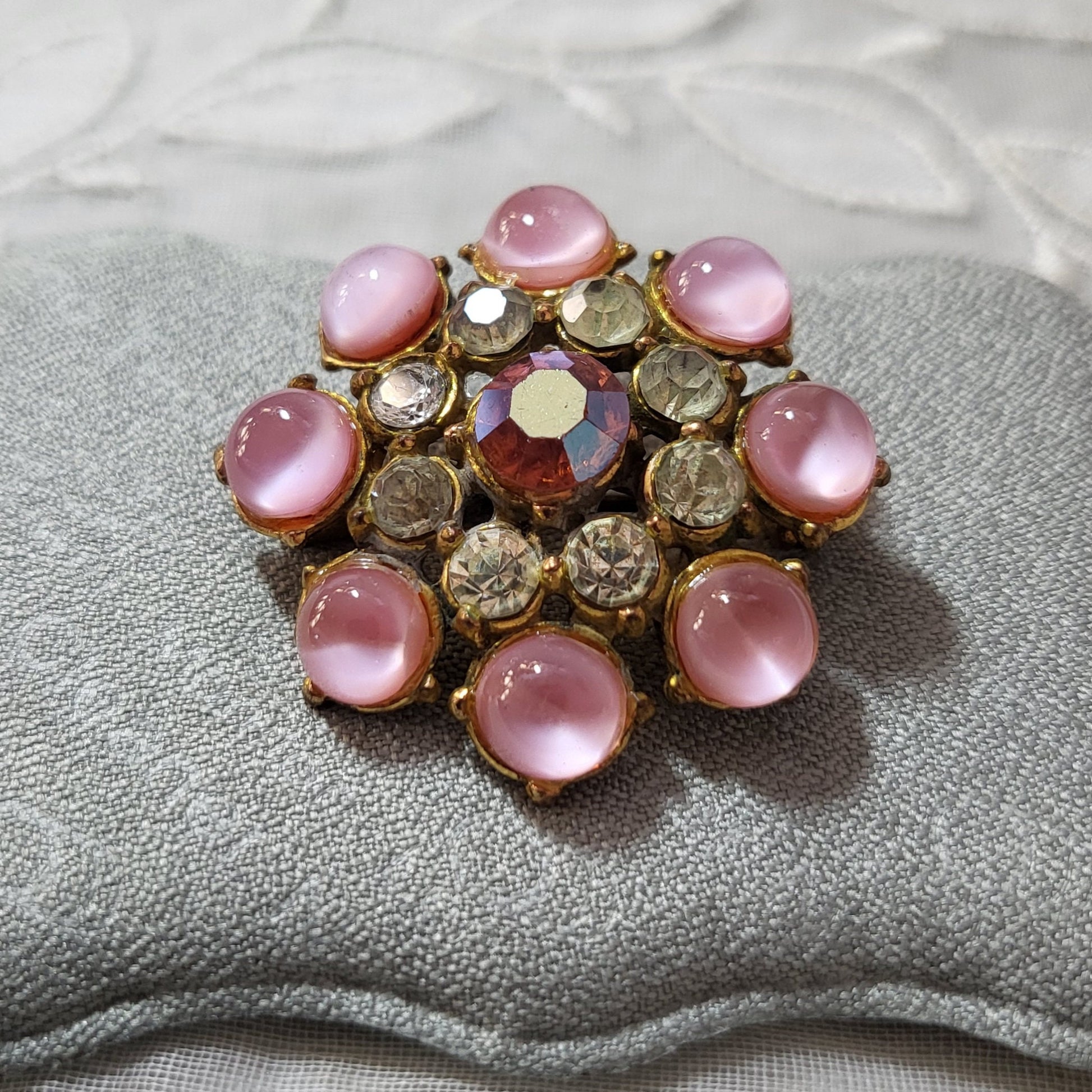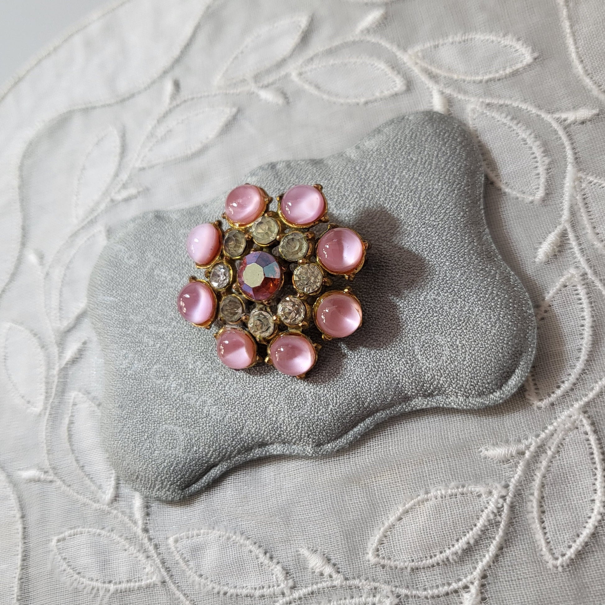 A dainty round brooch by Hollywood with light pink cabochon, fuchsia aurora borealis and clear crystals on gold plated metal
