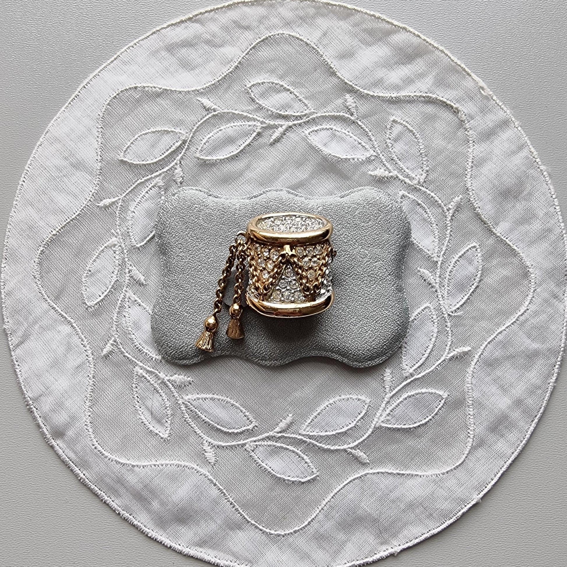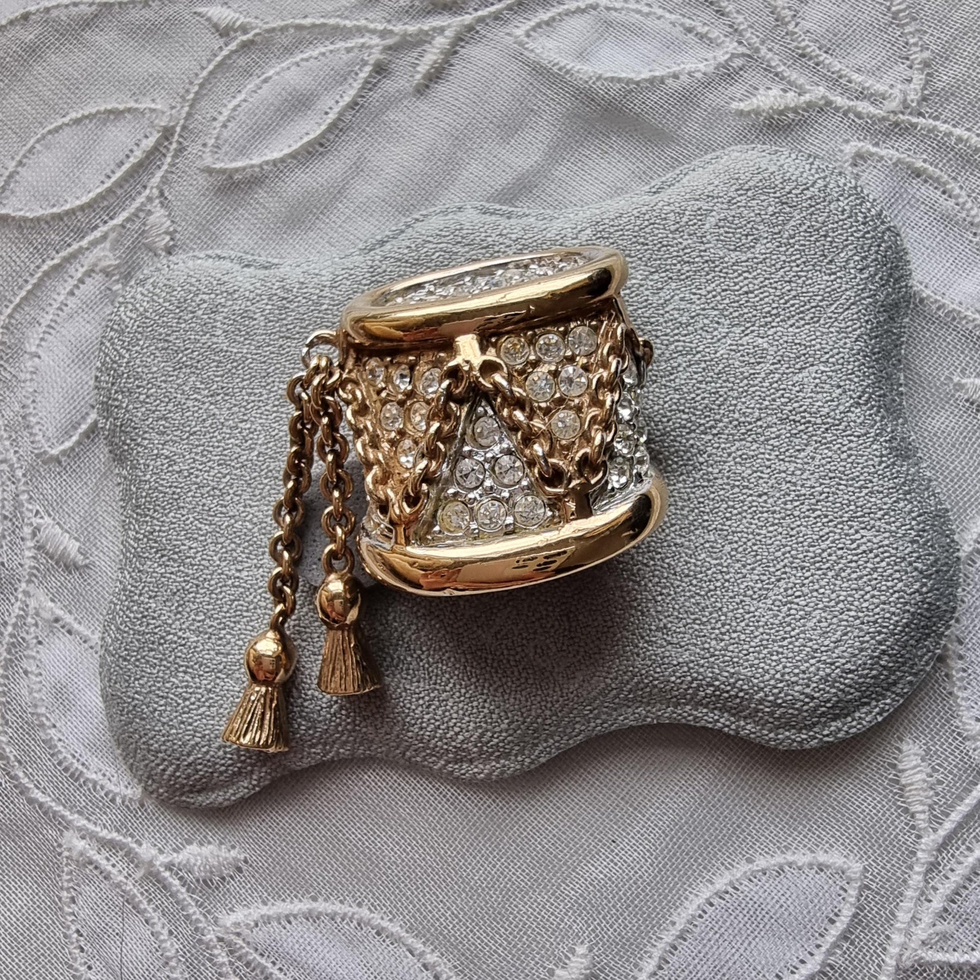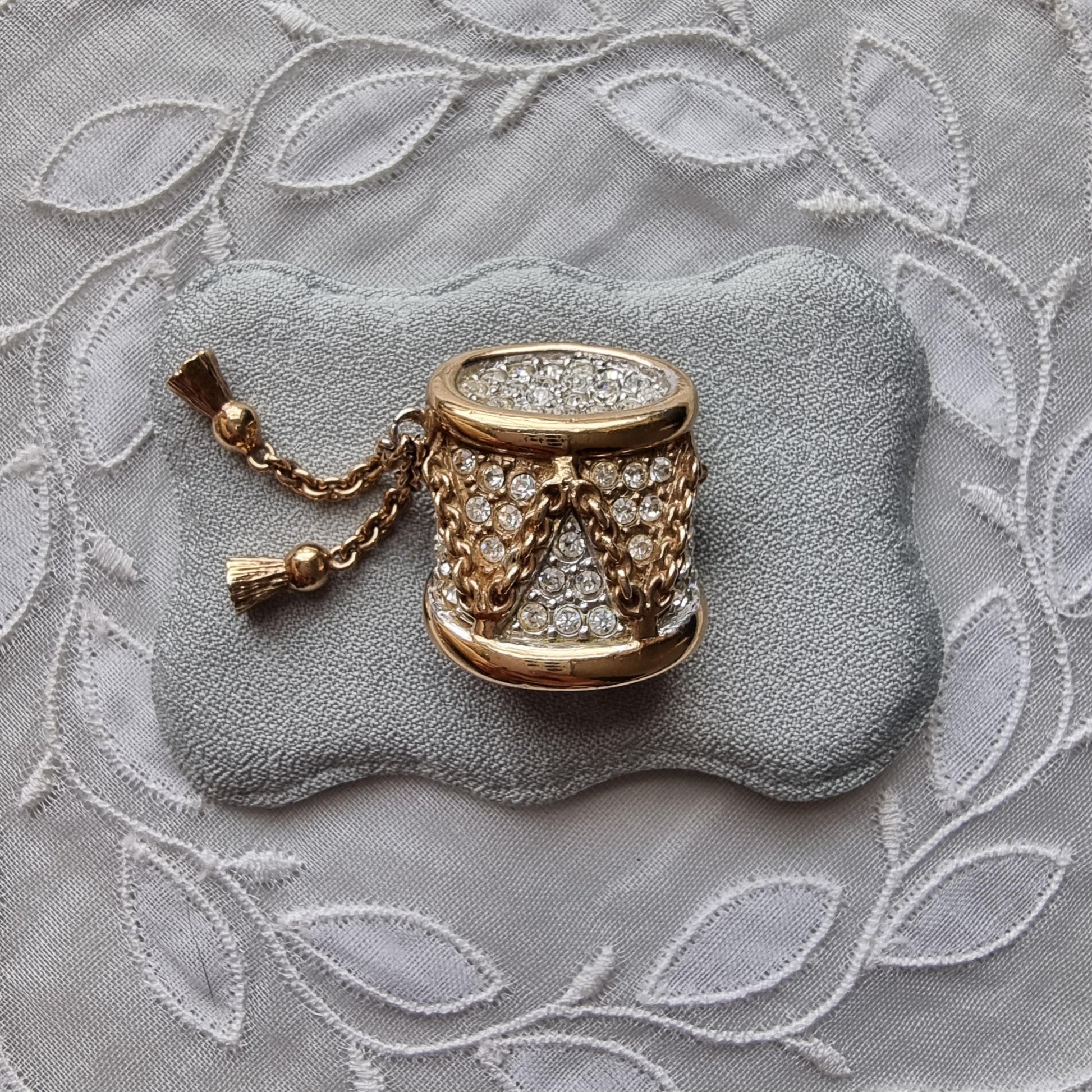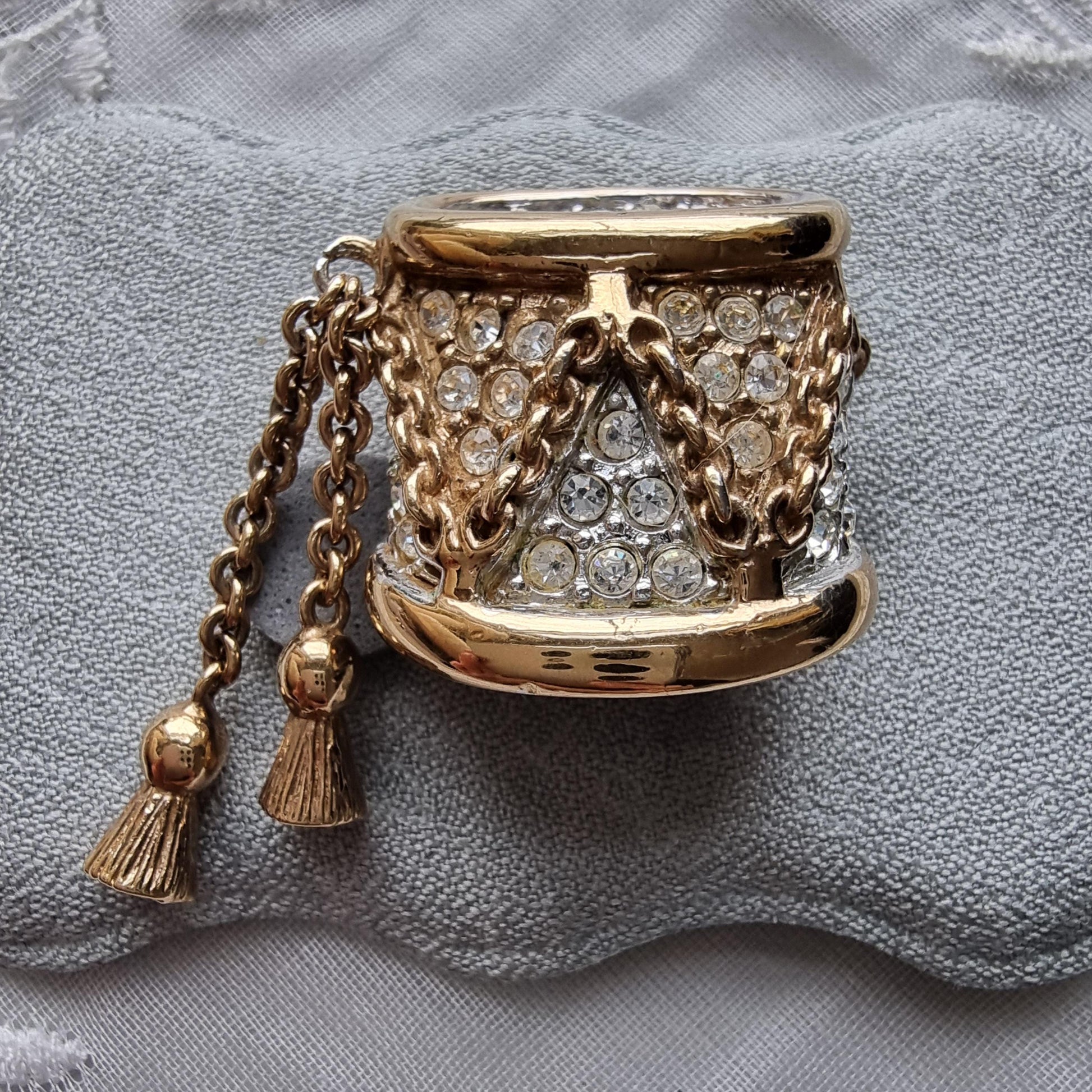 A stunning drum brooch with small clear crystals on gold plated metal