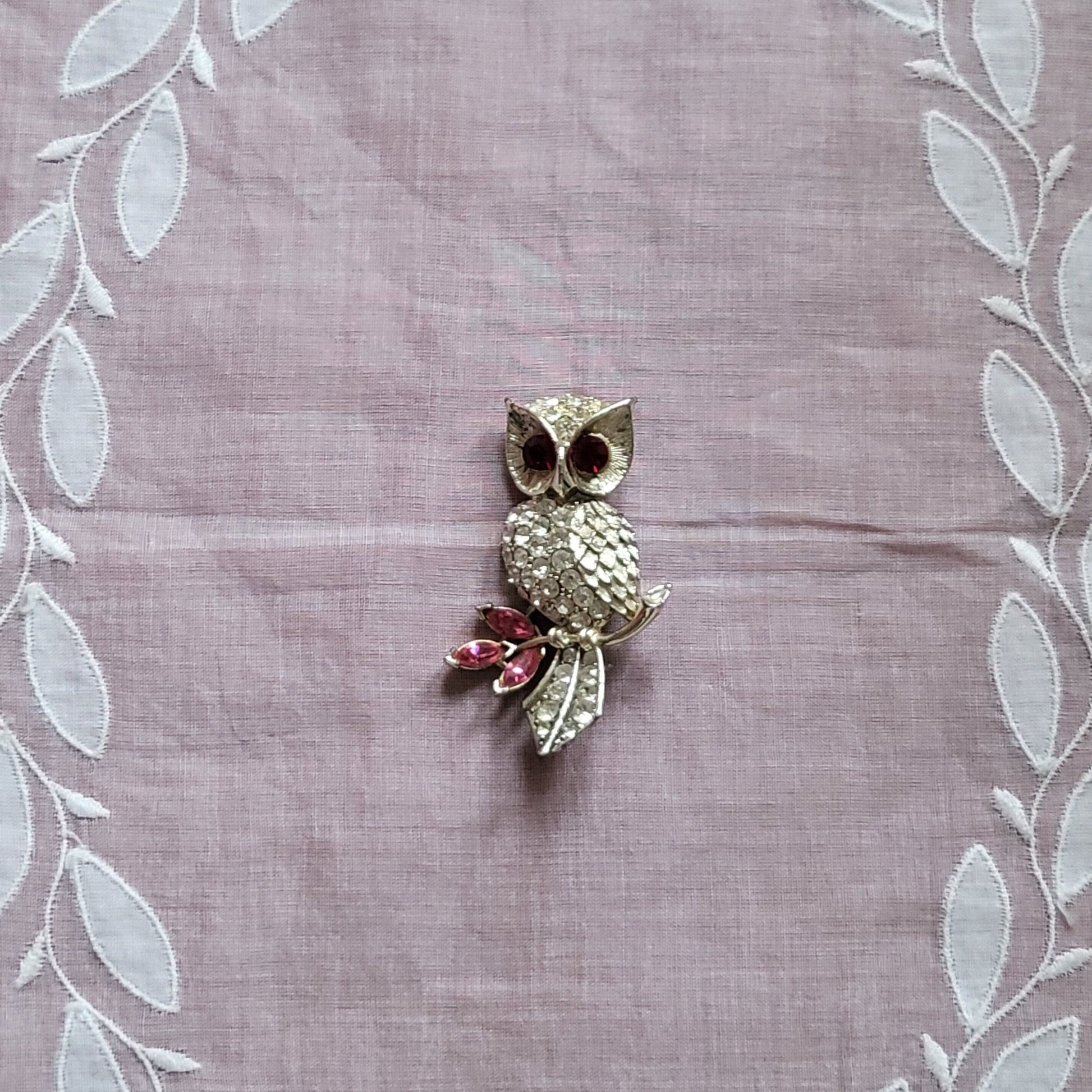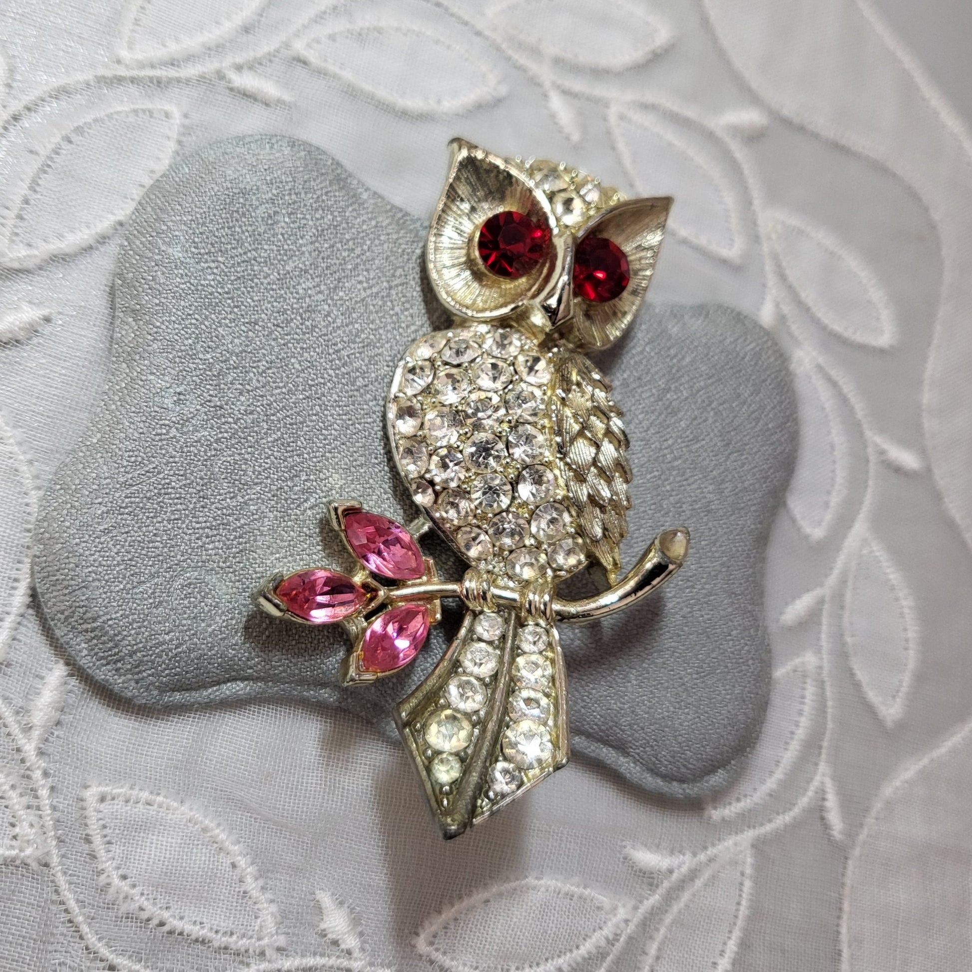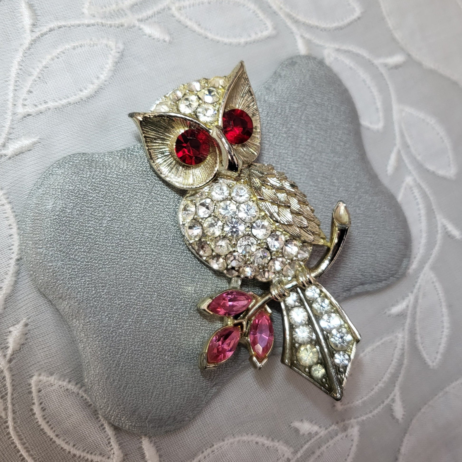 A sparkly crystal owl brooch by Lisner with red, pink and clear crystals set on rhodium plated metal