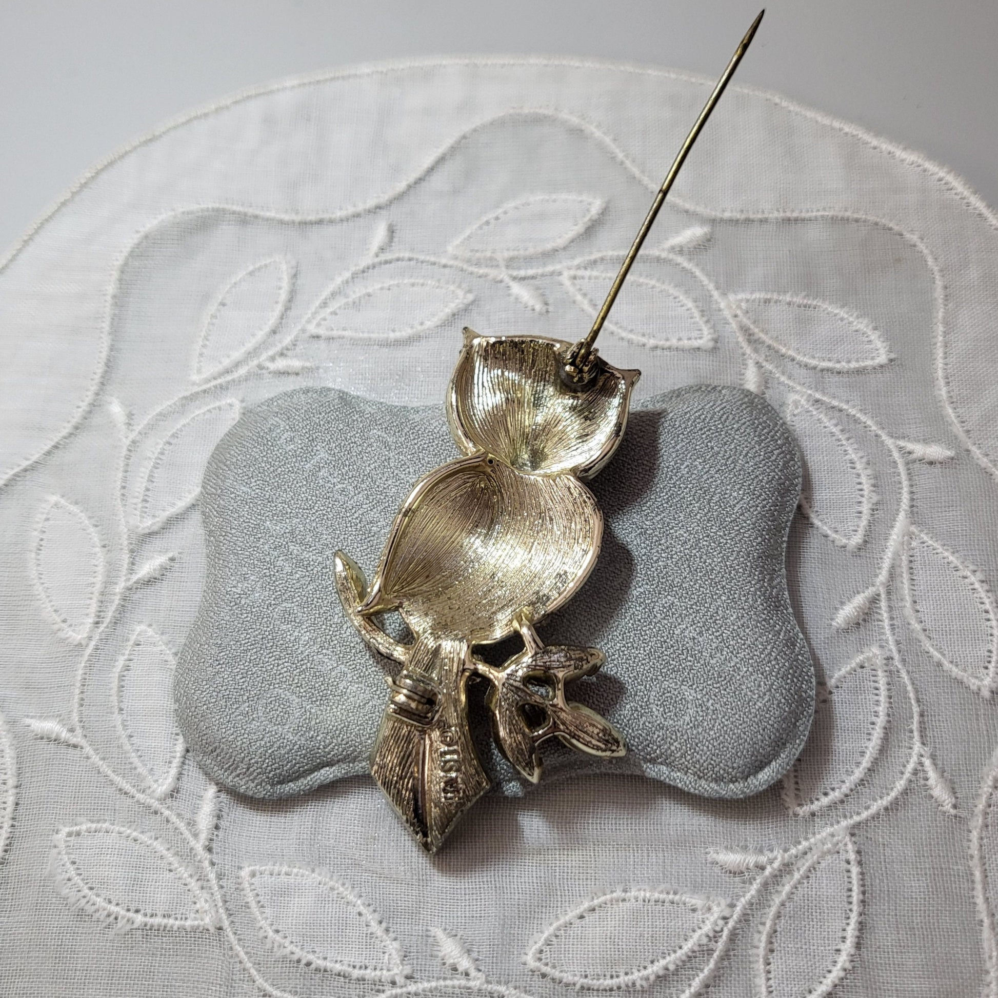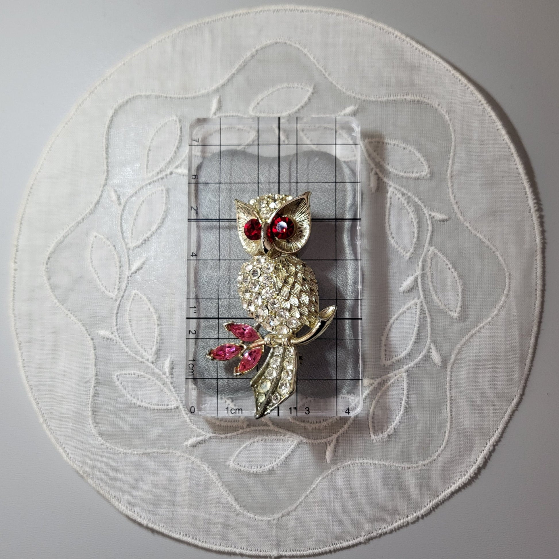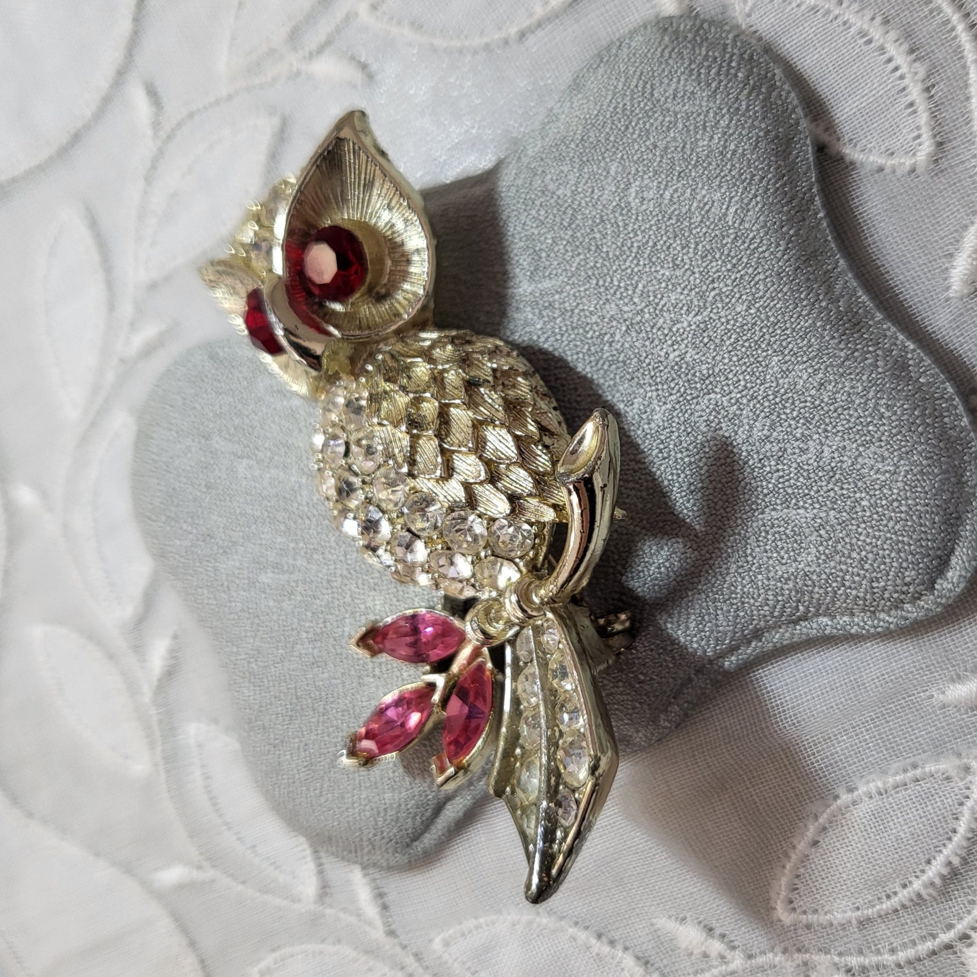 A sparkly crystal owl brooch by Lisner with red, pink and clear crystals set on rhodium plated metal