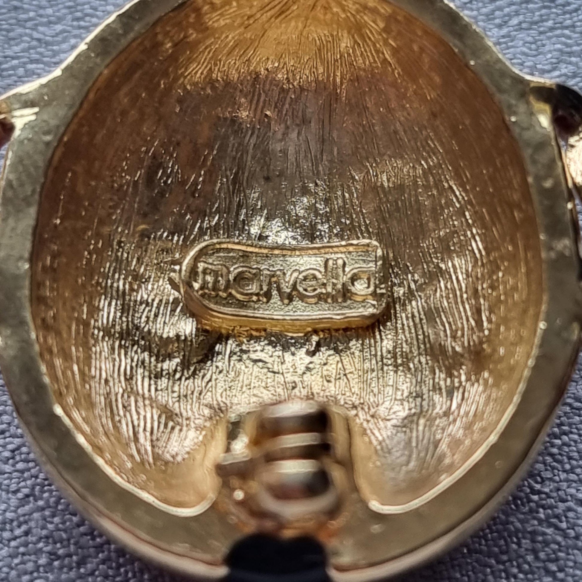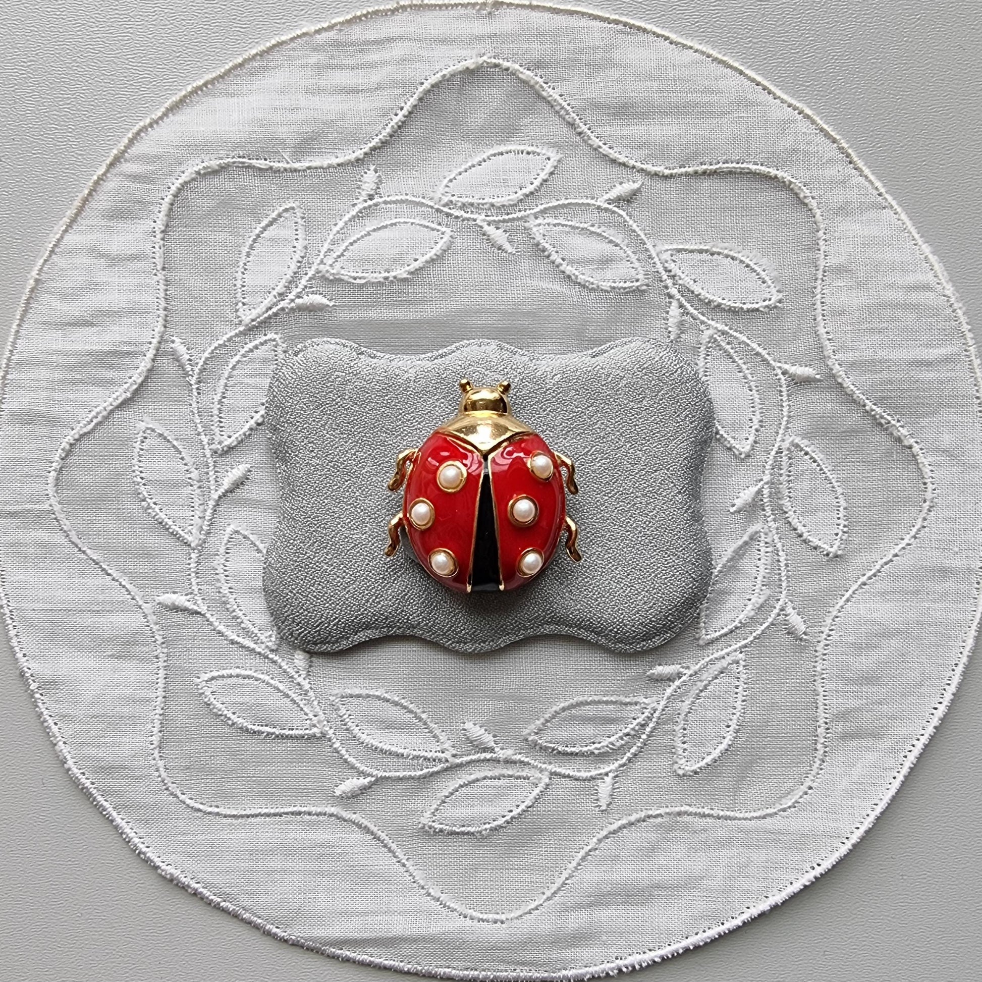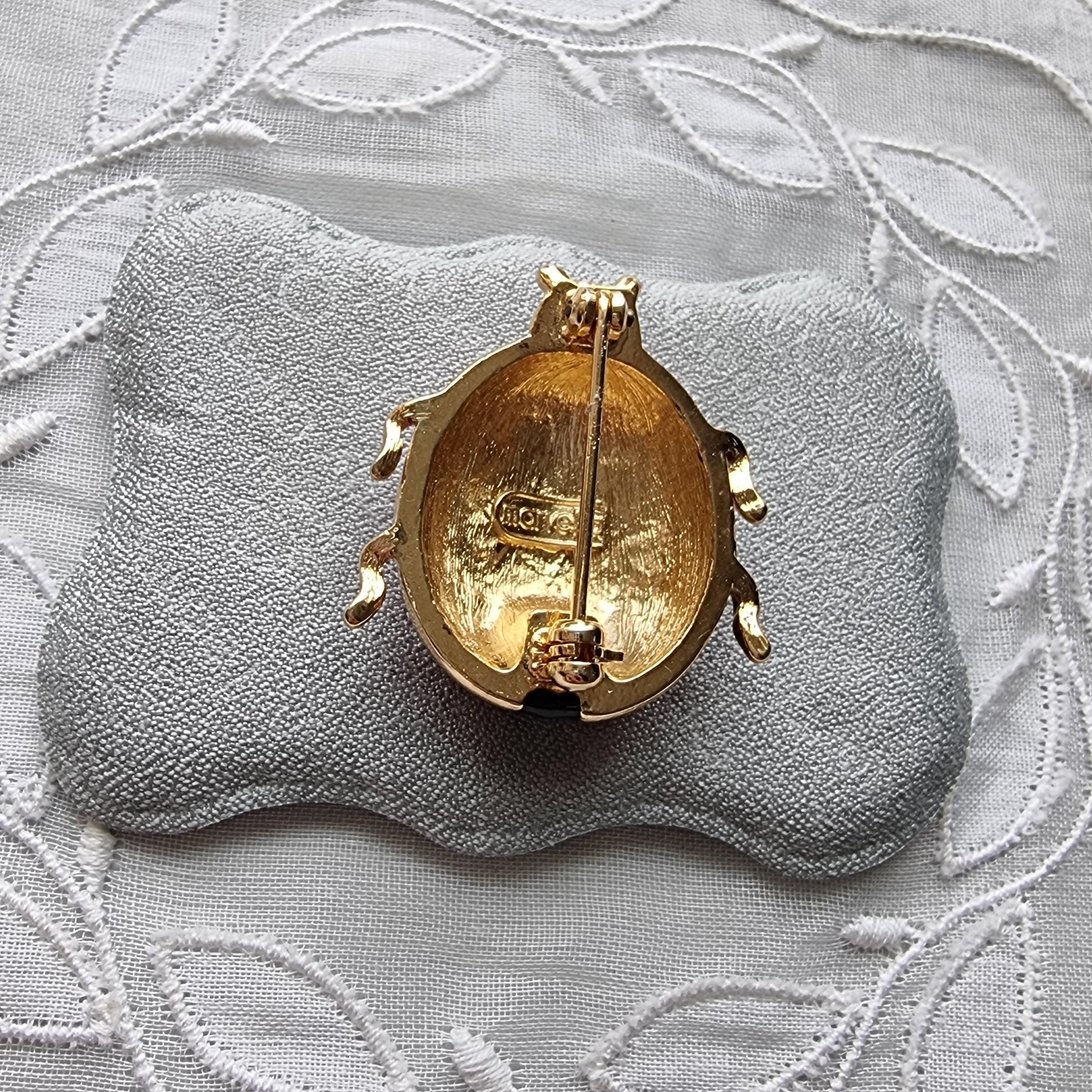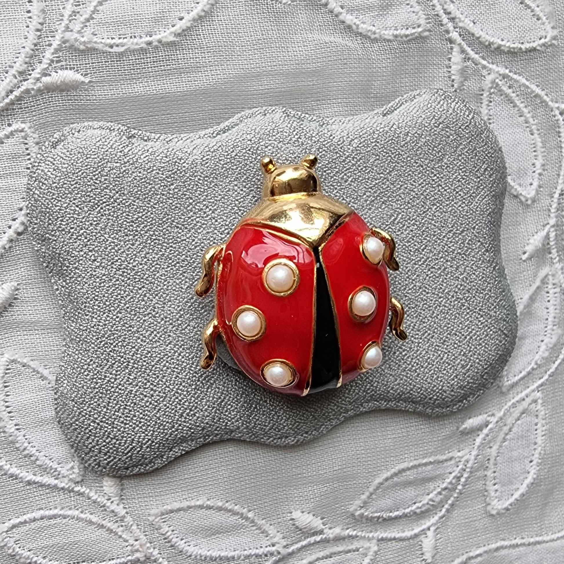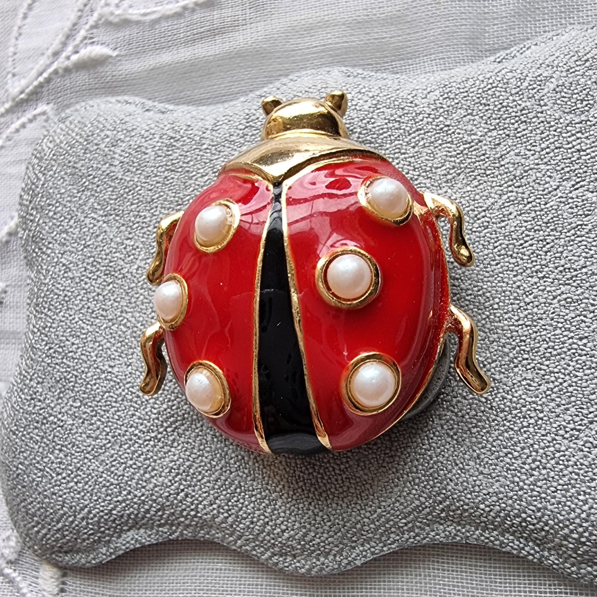 A beautiful ladybird brooch by Marvella with red and black enamel and small faux pearls on gold plated metal