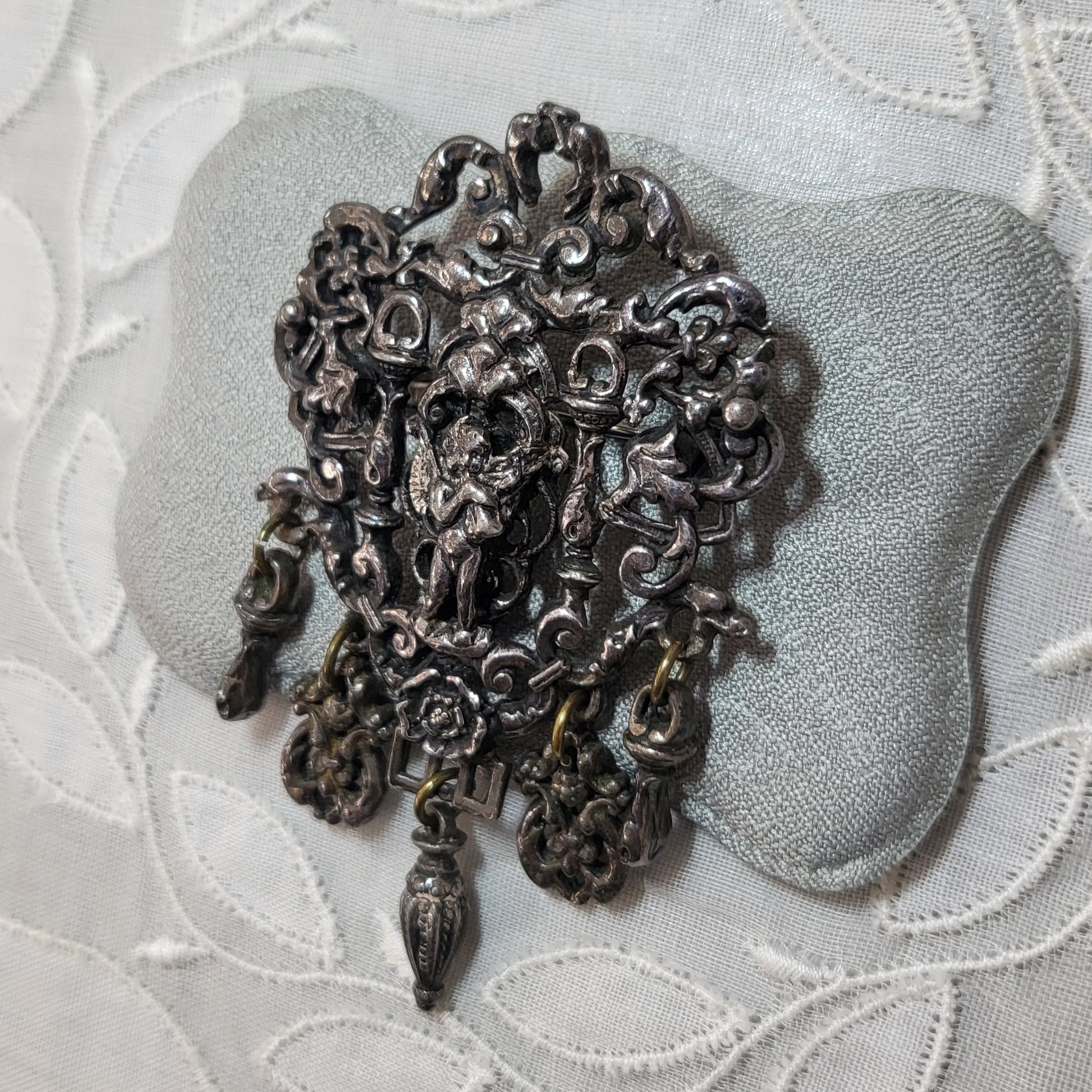 A beautiful cherub brooch by Miracle Creation in ornate art nouveau design in black rhodium plated metal