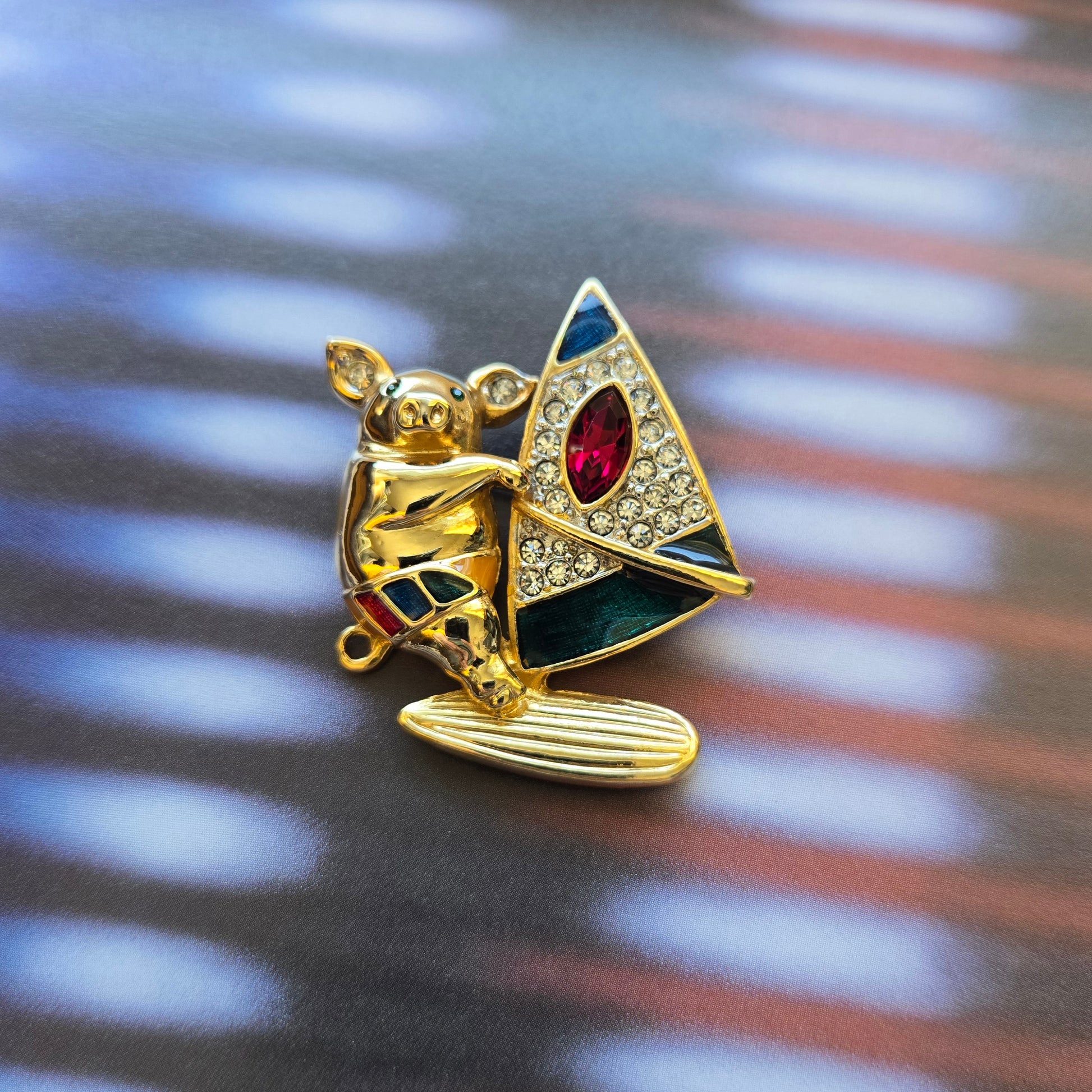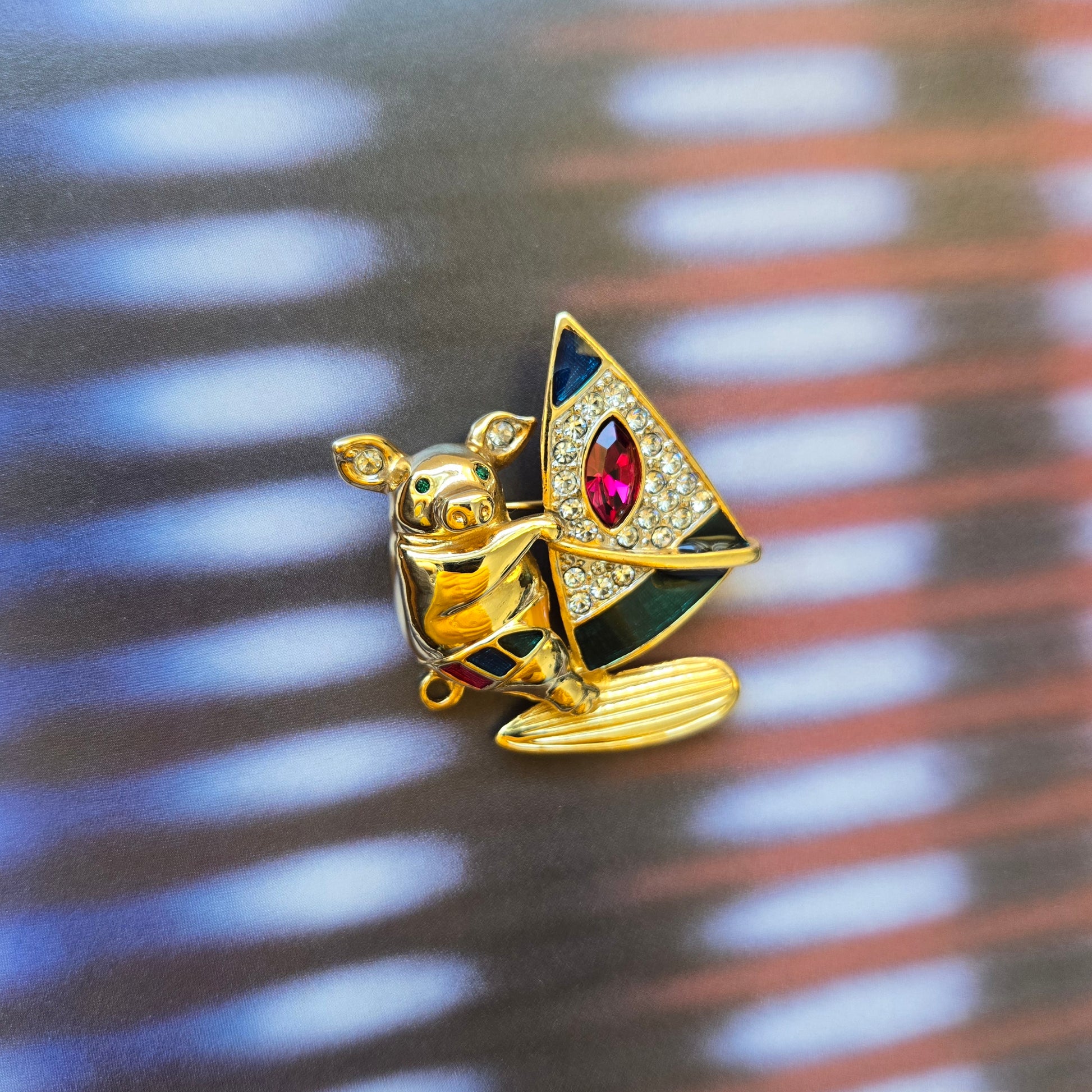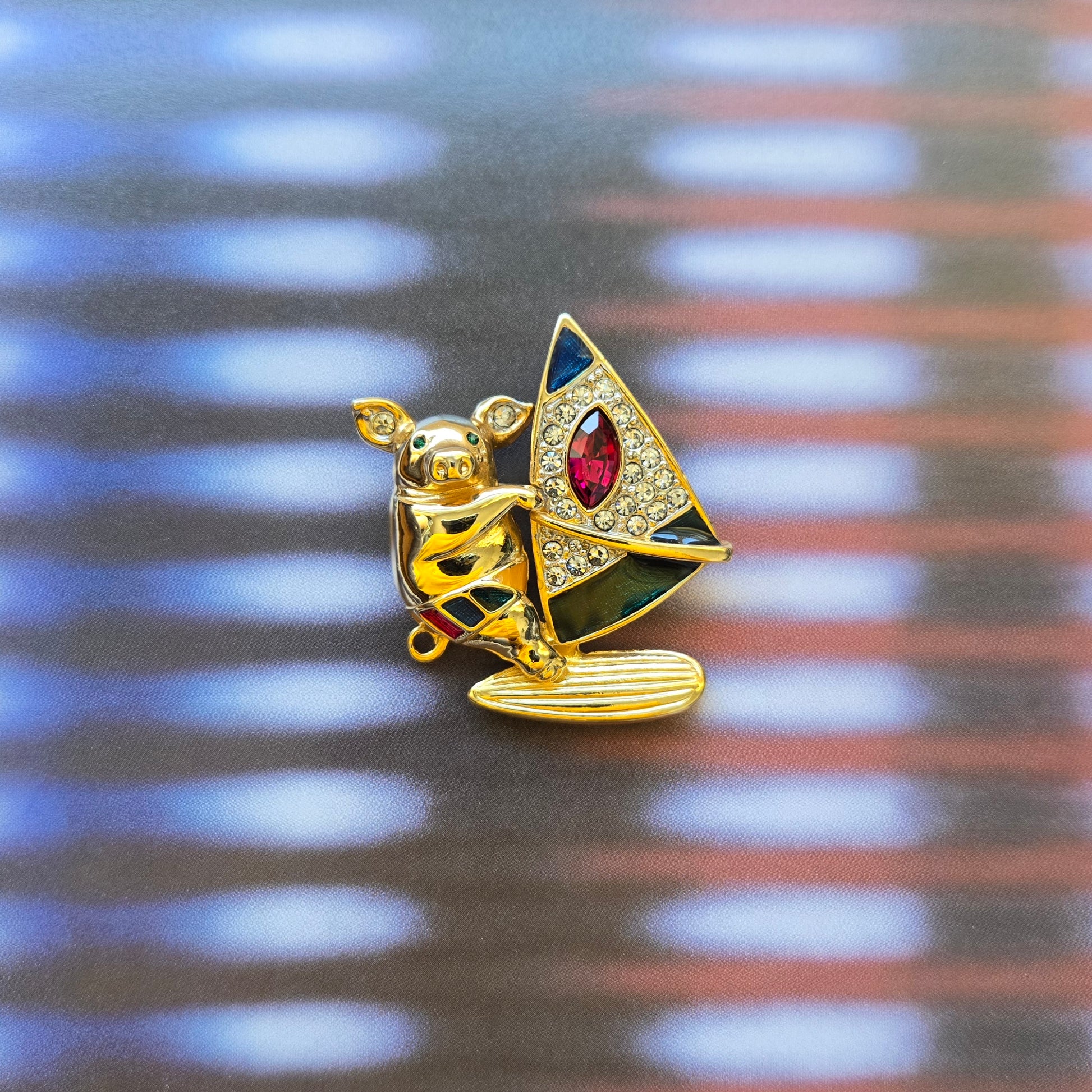 Make a splash with this delightfully quirky vintage brooch featuring a gold plated pig windsurfing with flair! This whimsical piece boasts colourful enamel detailing, sparkling rhinestones, and a bold red marquise crystal set into the sail. A playful statement pin perfect for animal lovers, collectors of novelty jewellery, or anyone who enjoys a touch of fun in their accessories.