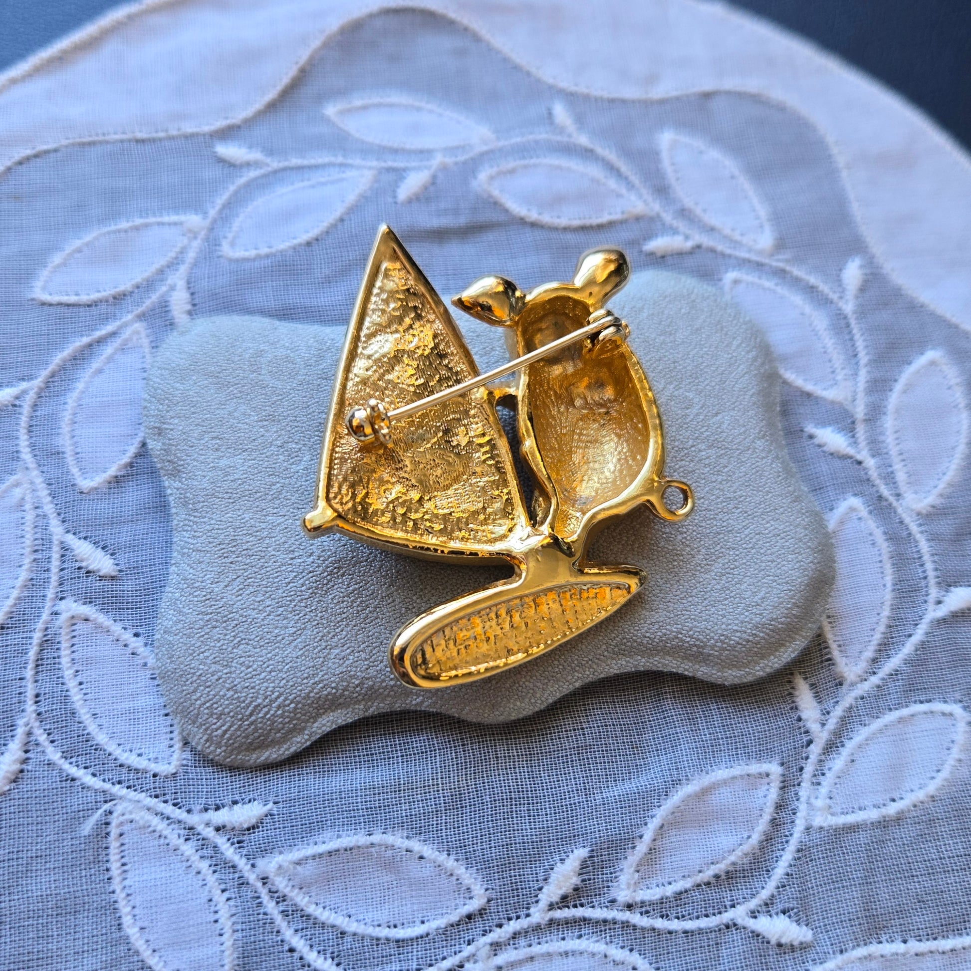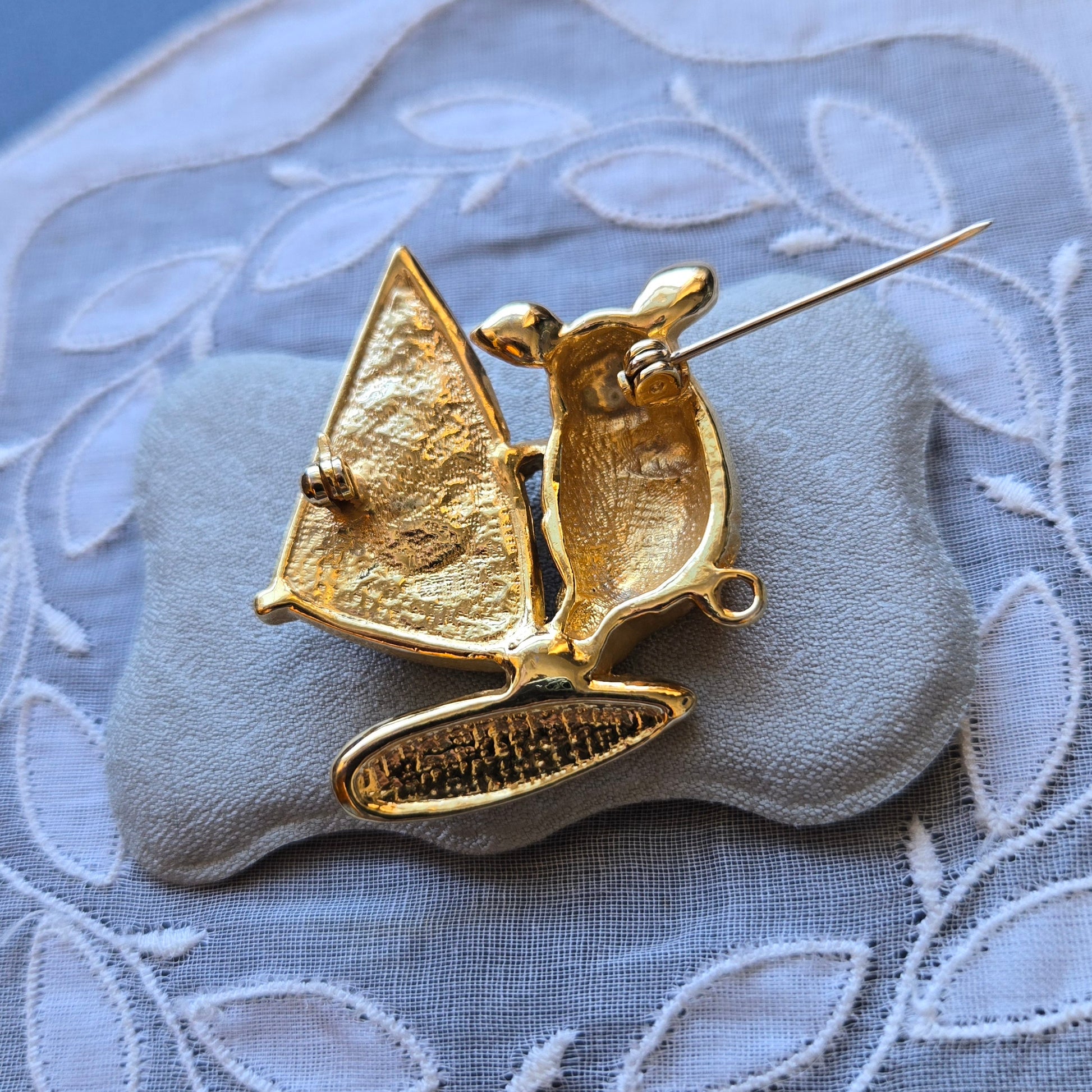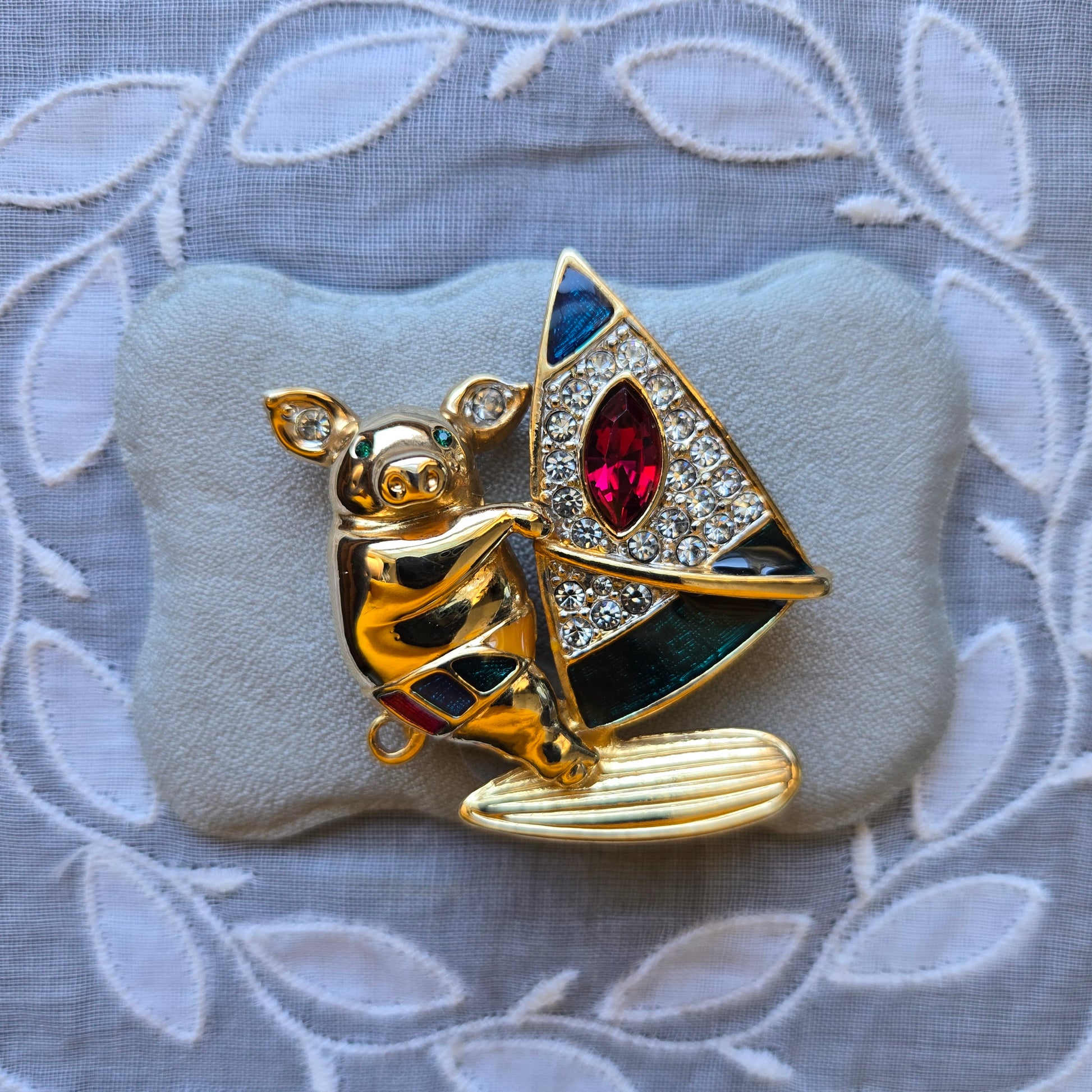 Make a splash with this delightfully quirky vintage brooch featuring a gold plated pig windsurfing with flair! This whimsical piece boasts colourful enamel detailing, sparkling rhinestones, and a bold red marquise crystal set into the sail. A playful statement pin perfect for animal lovers, collectors of novelty jewellery, or anyone who enjoys a touch of fun in their accessories.