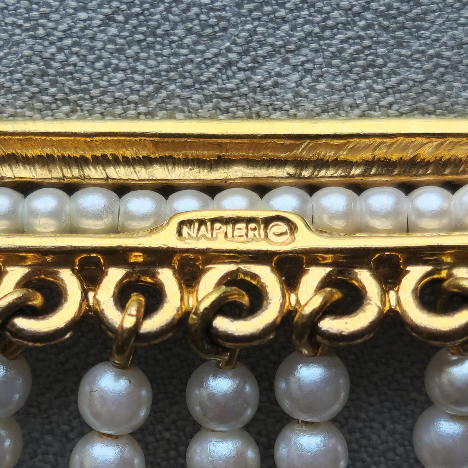 A gorgeous pearl drops brooch by Napier with faux pearl beads drops on gold plated metal