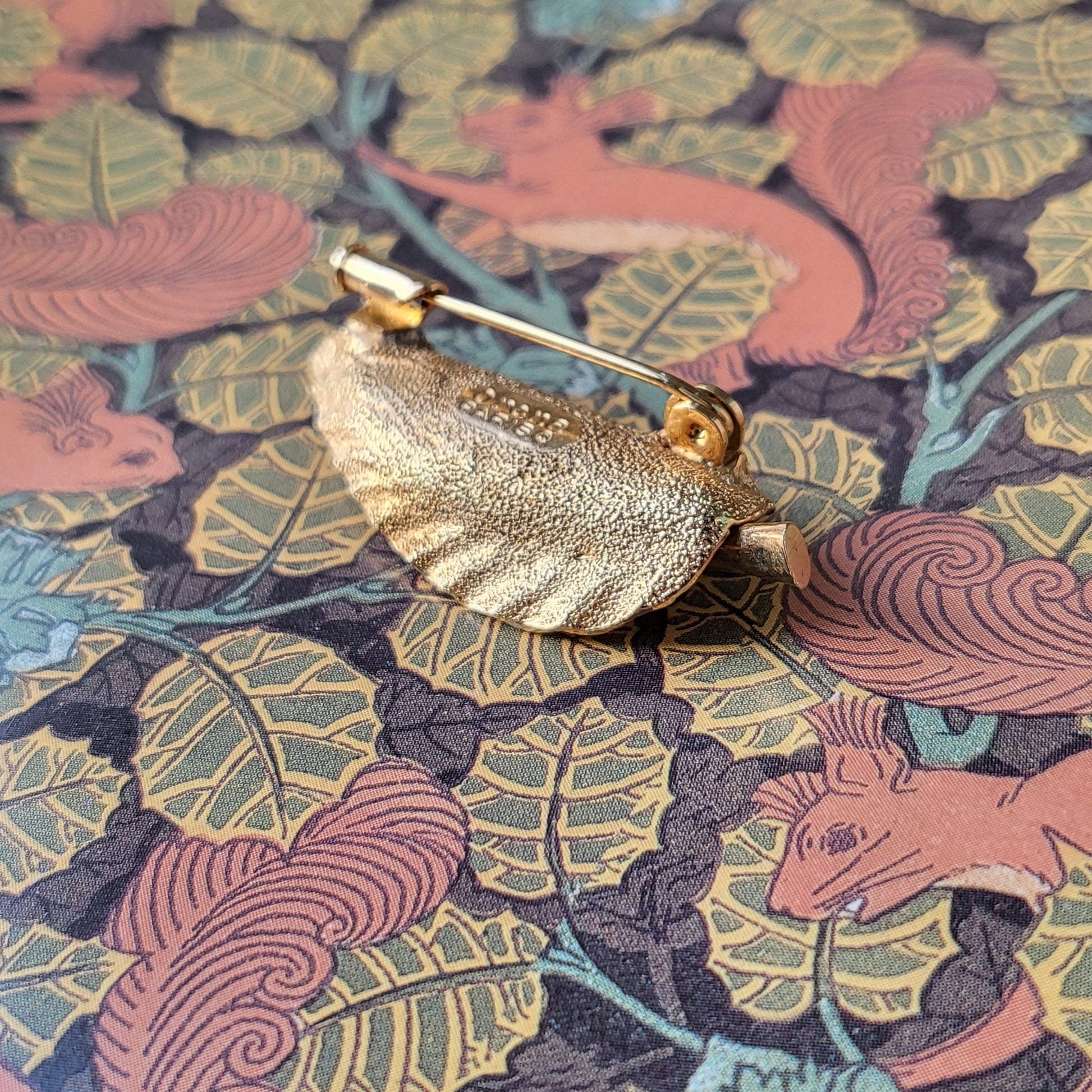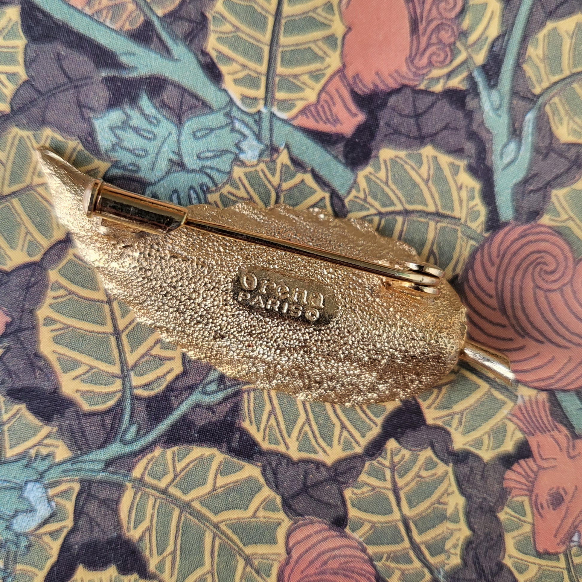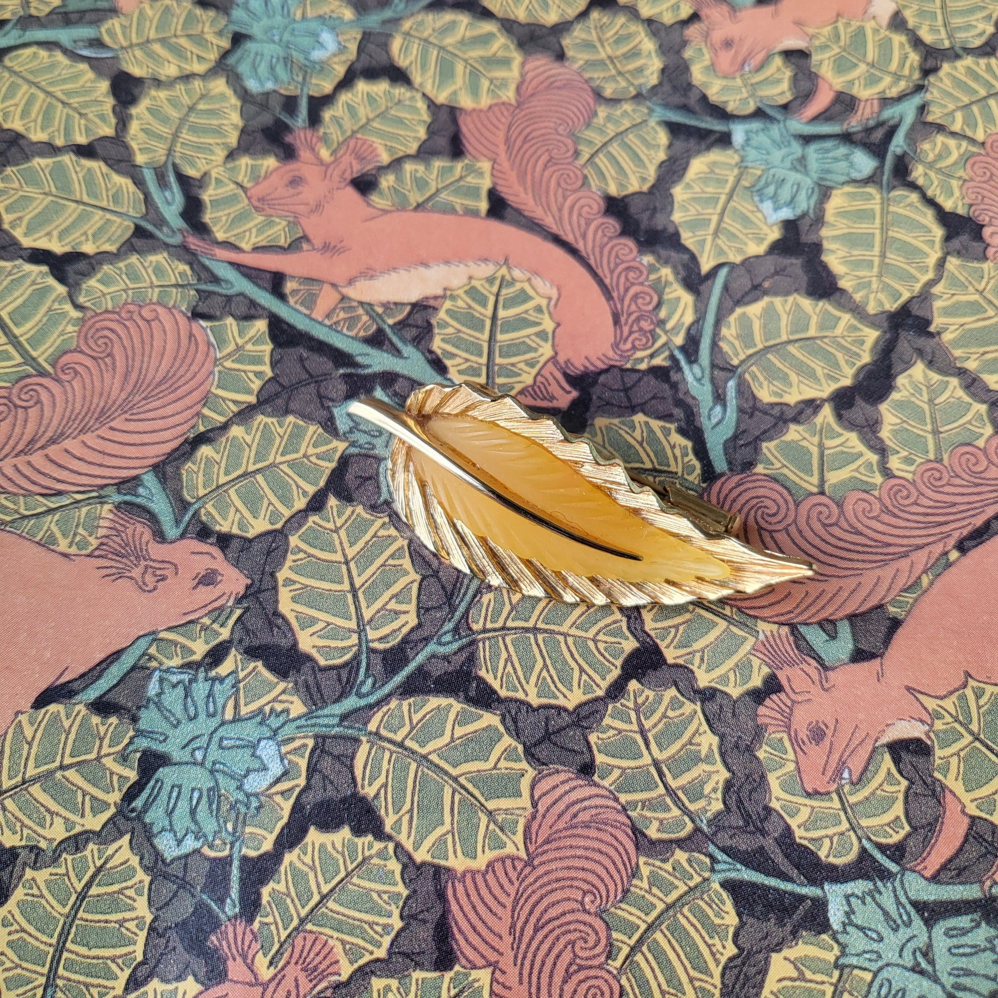 A very rare leaf brooch by Orena Paris with a yellow thermoset plastic in the shape of a leaf set on gold plated metal