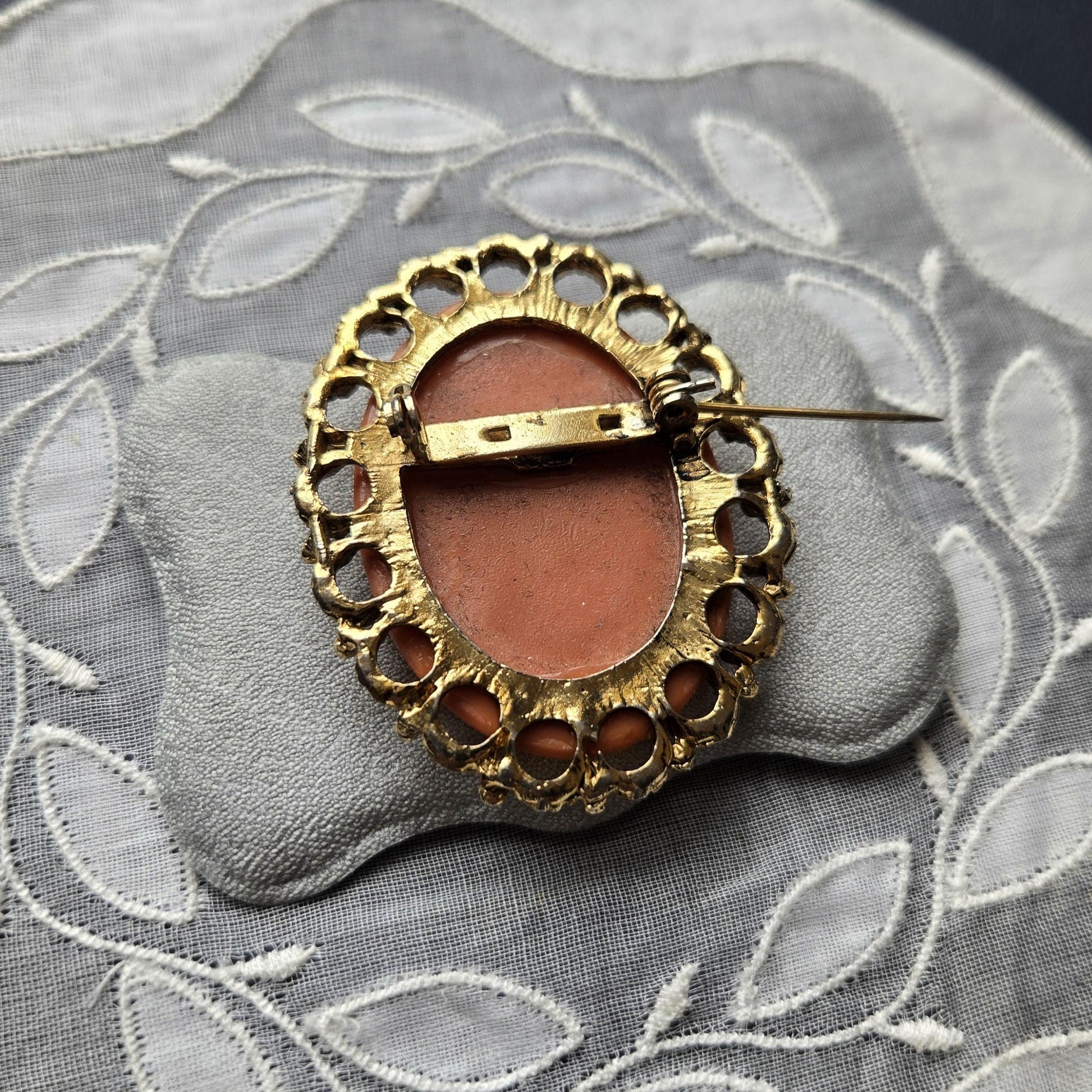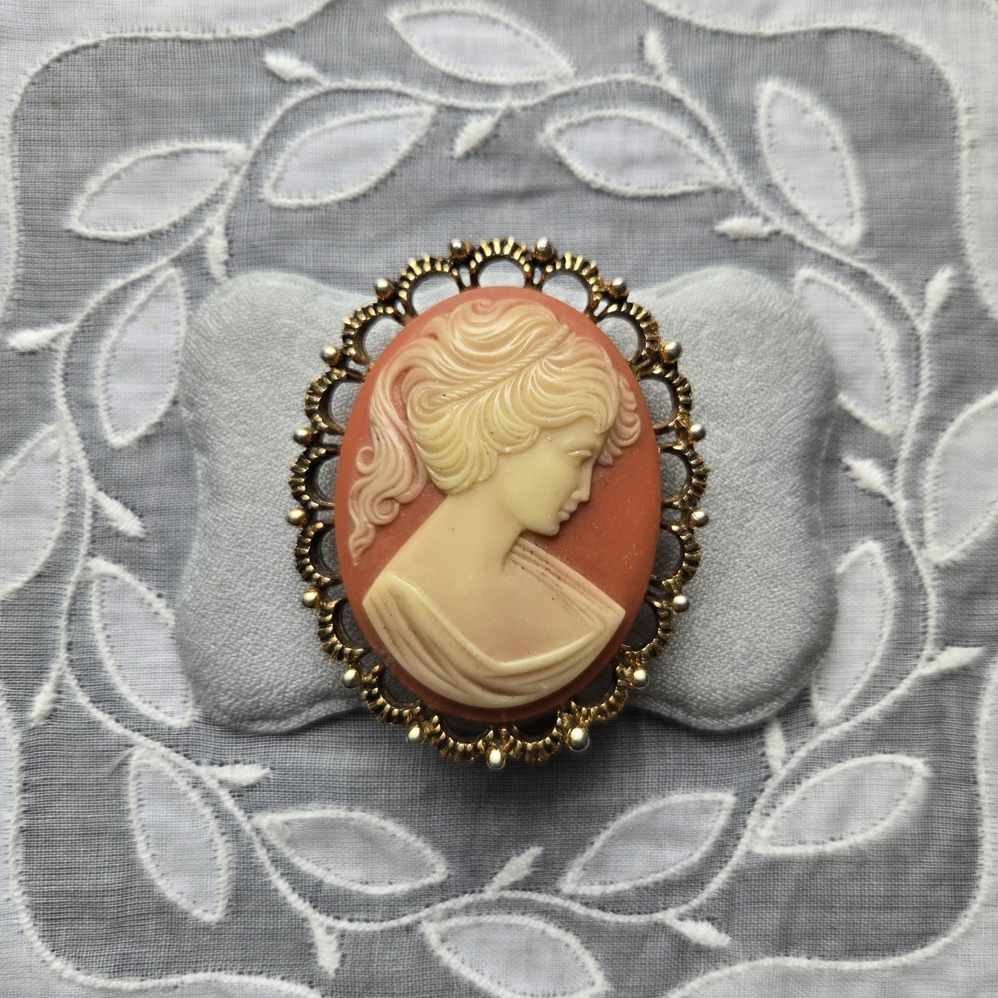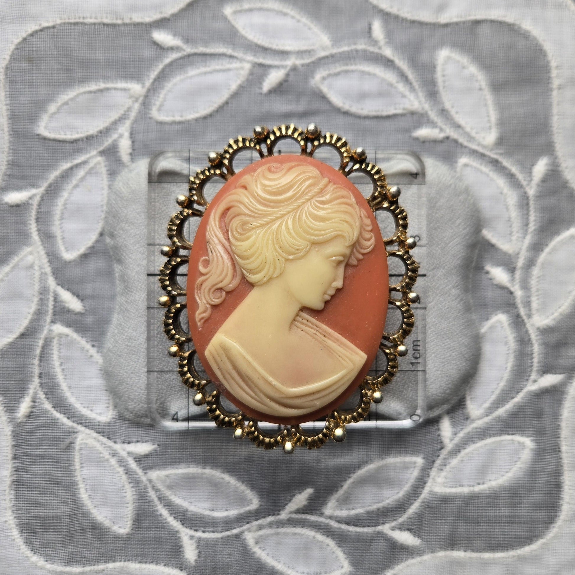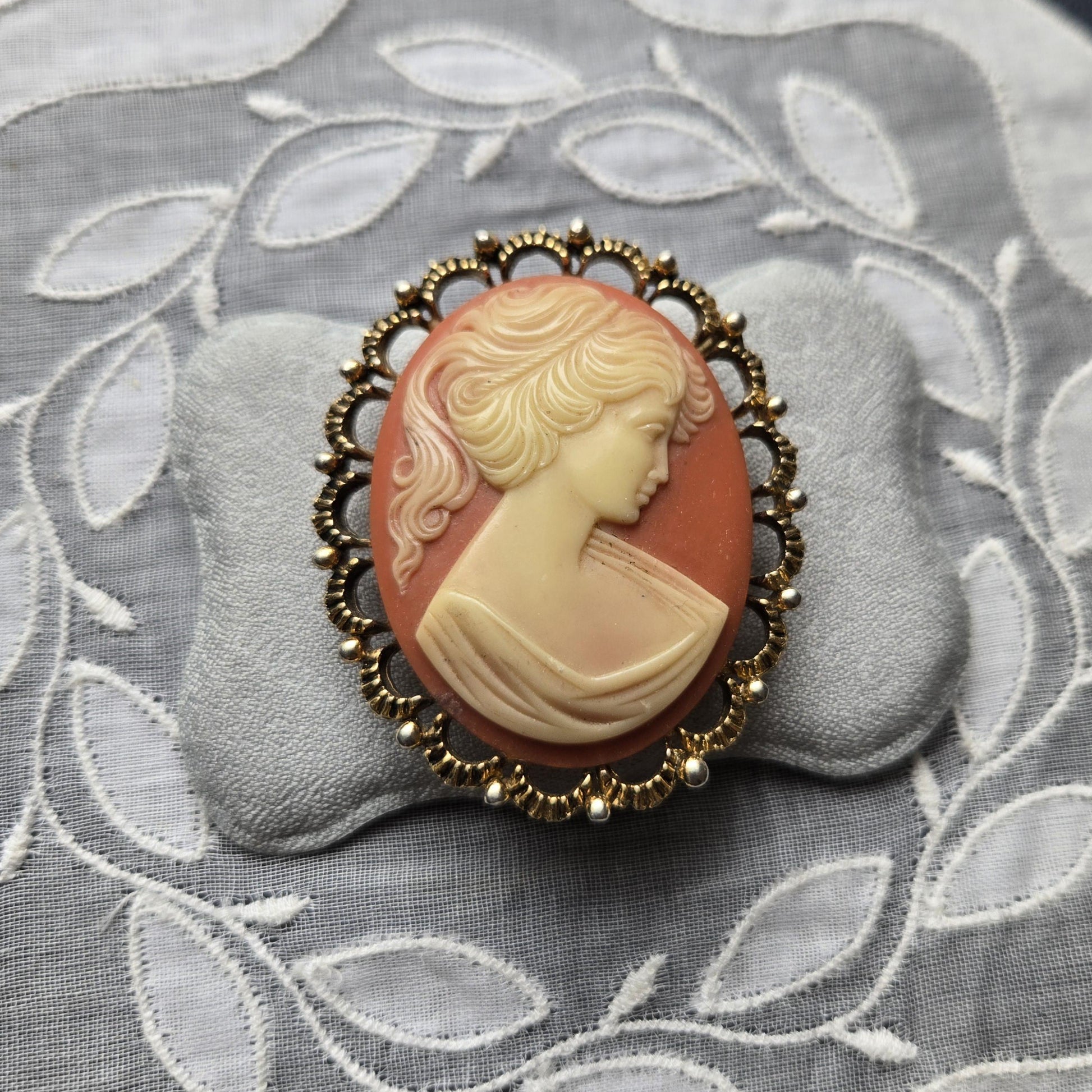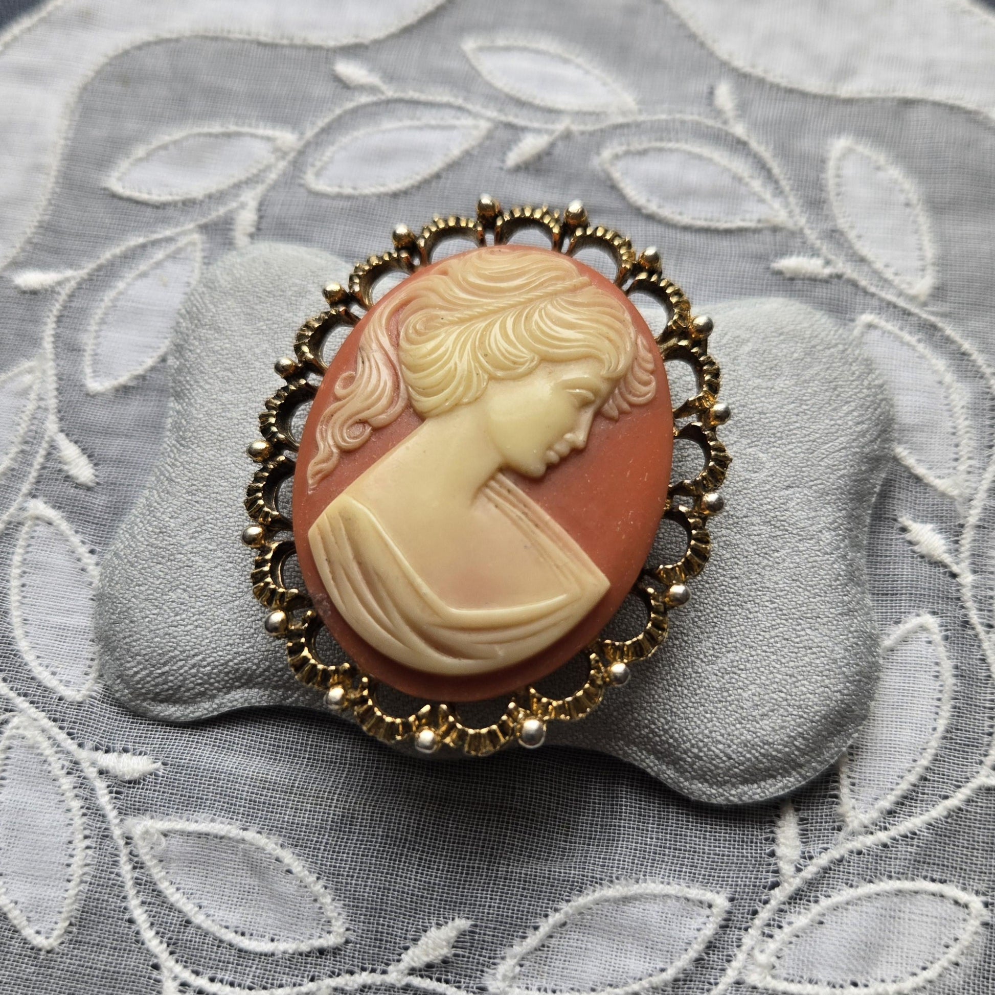 A beautiful cameo brooch with an acrylic cameo, possibly celluloid, on gold plated metal