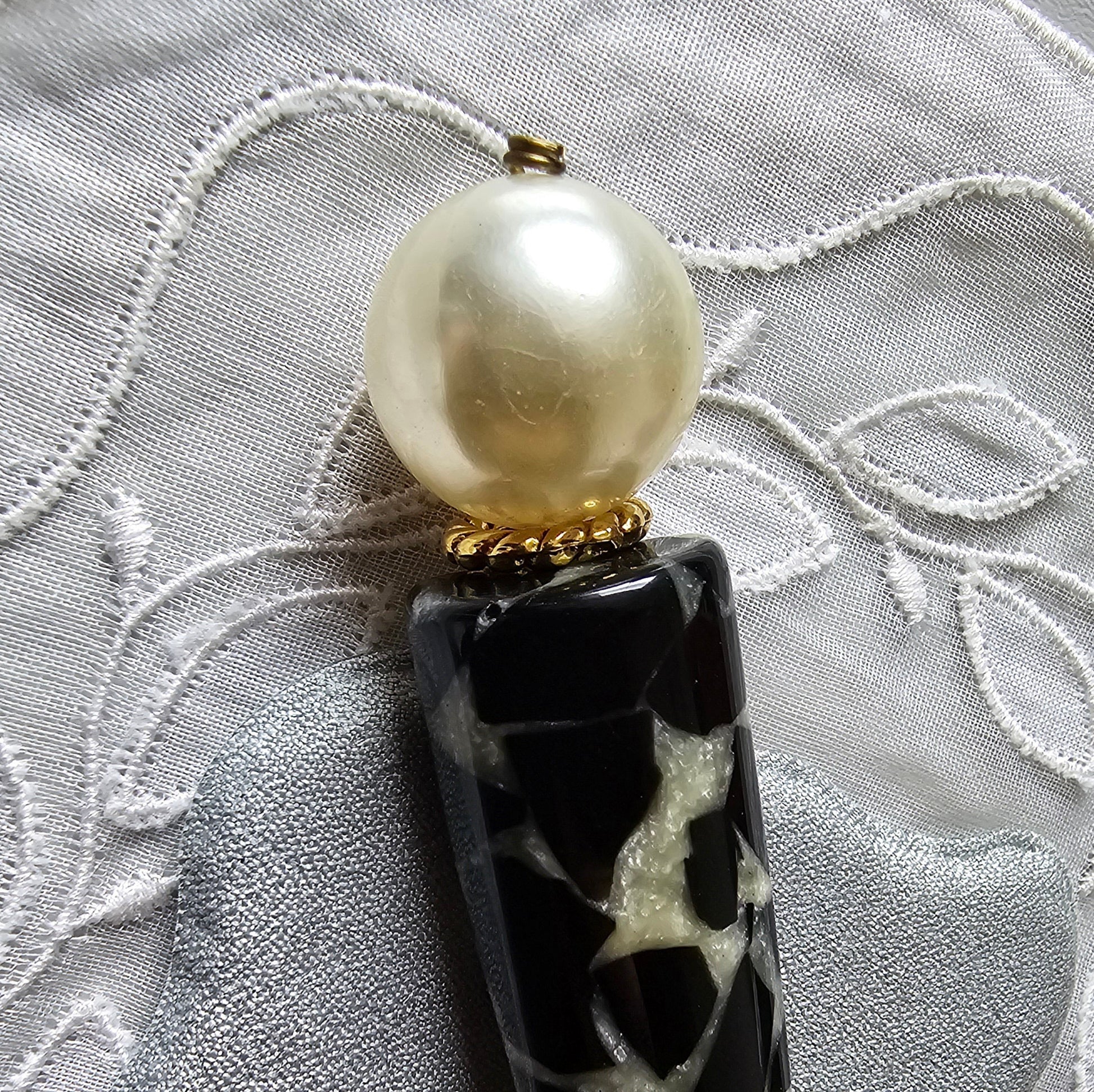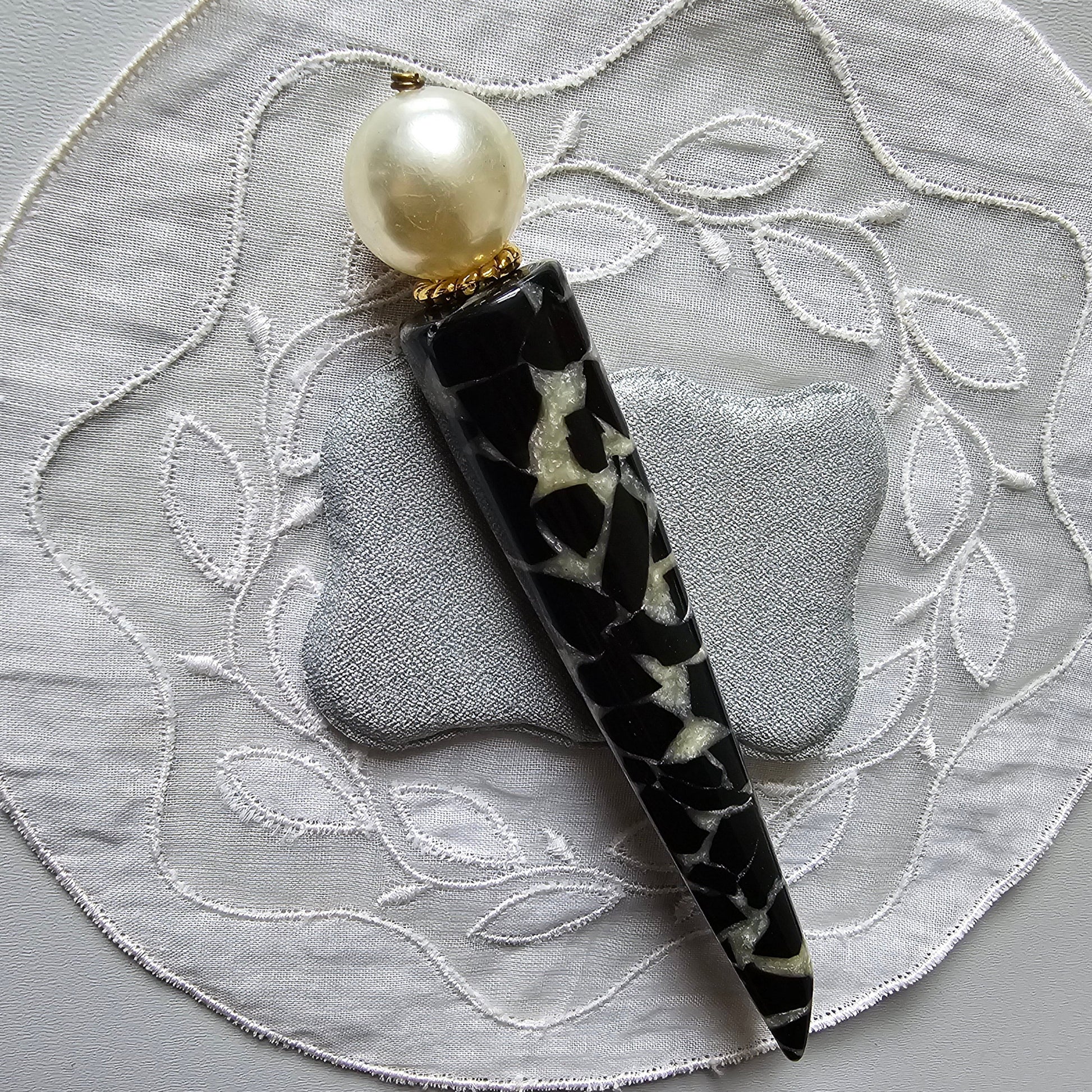 An unusual statement brooch with a big faux pearl on black and glittery white acrylic