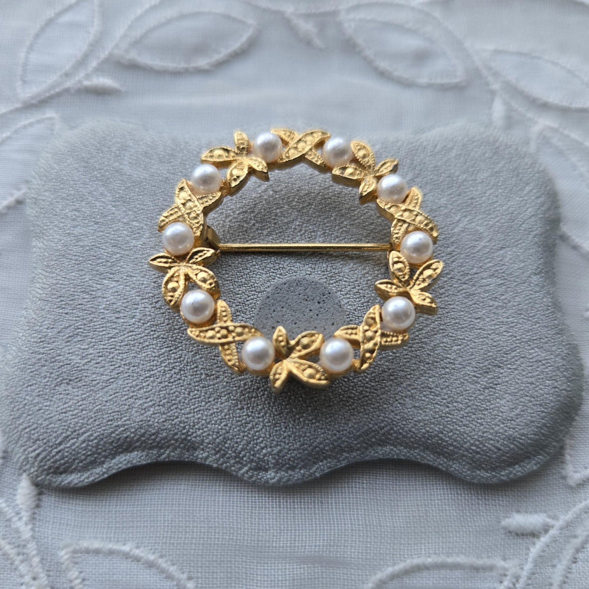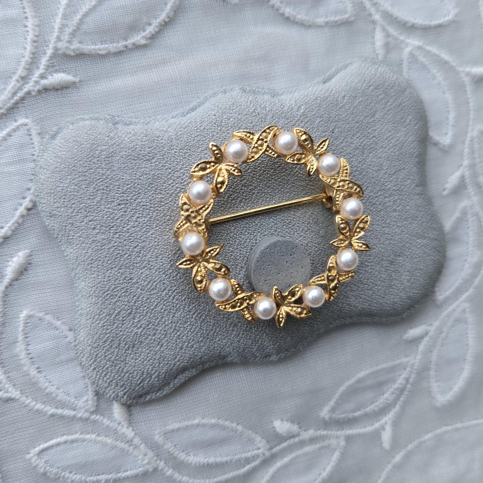 A beautiful small wreath brooch with faux pearls on gold plated metal