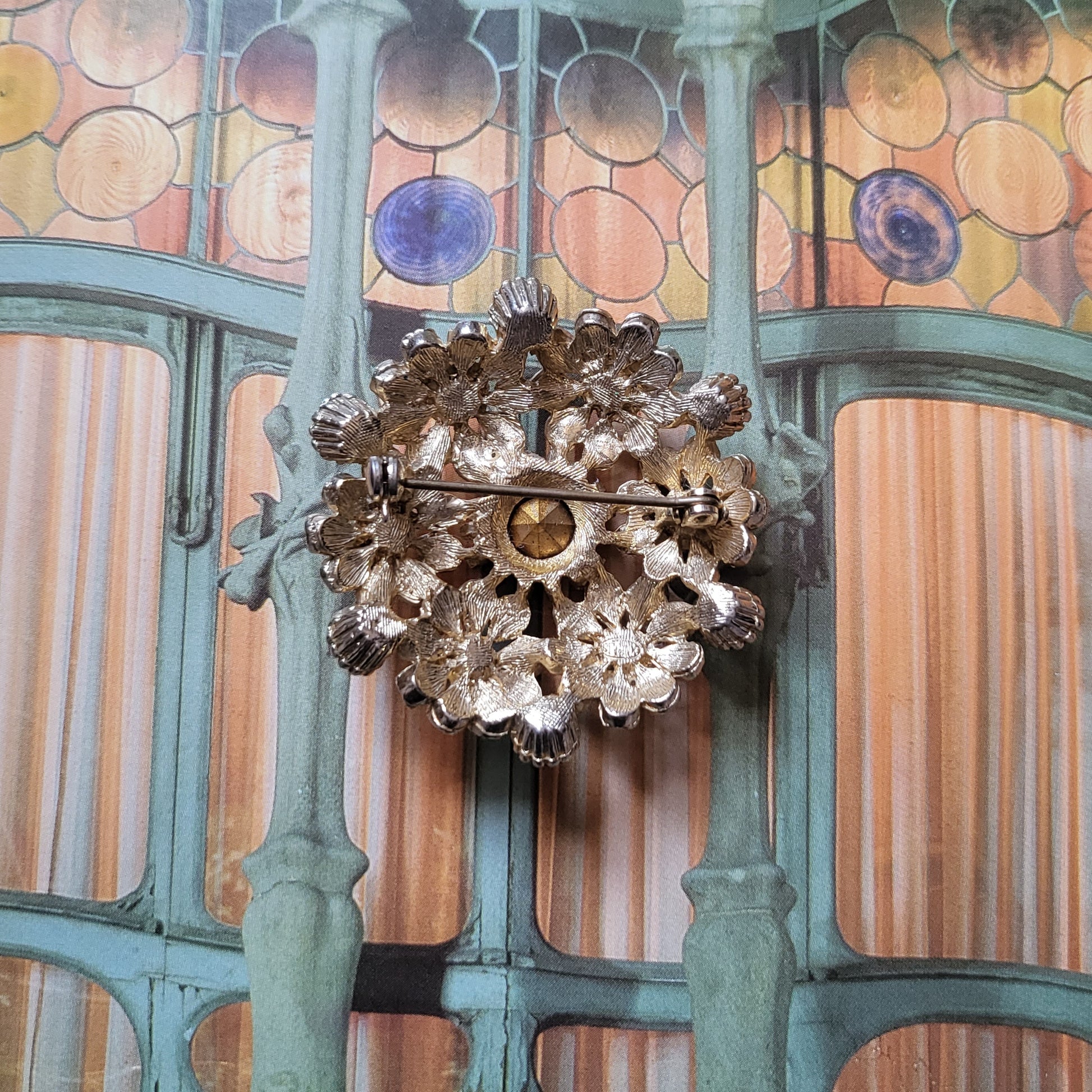 A beautiful flower cluster brooch with green and amber crystals set on gold plated metal