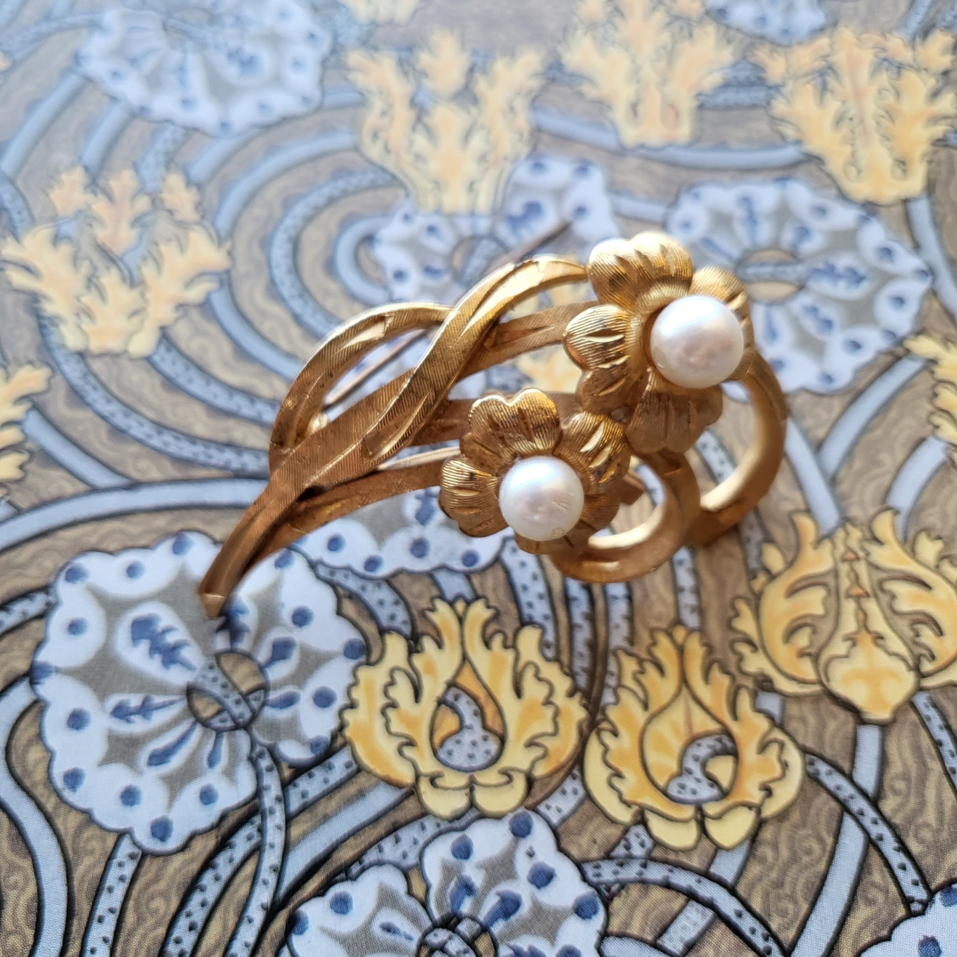 A lovely brushed gold flowers with pearls and engrave detailed leaves in gold plated metal