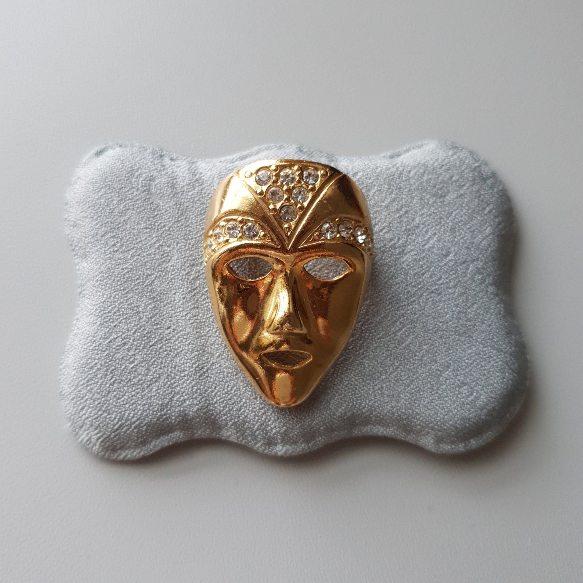 A small but effective gold mask brooch by Sphinx of London with clear crystals on gold plated metal