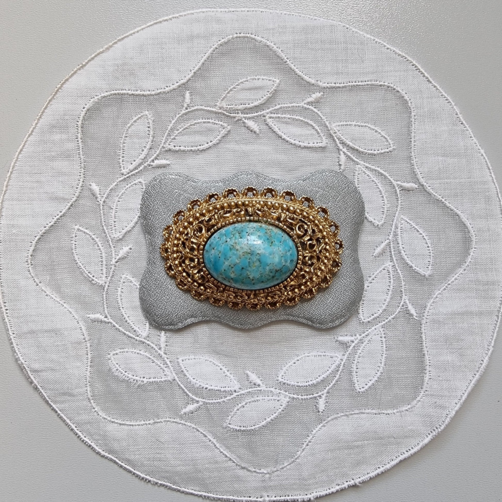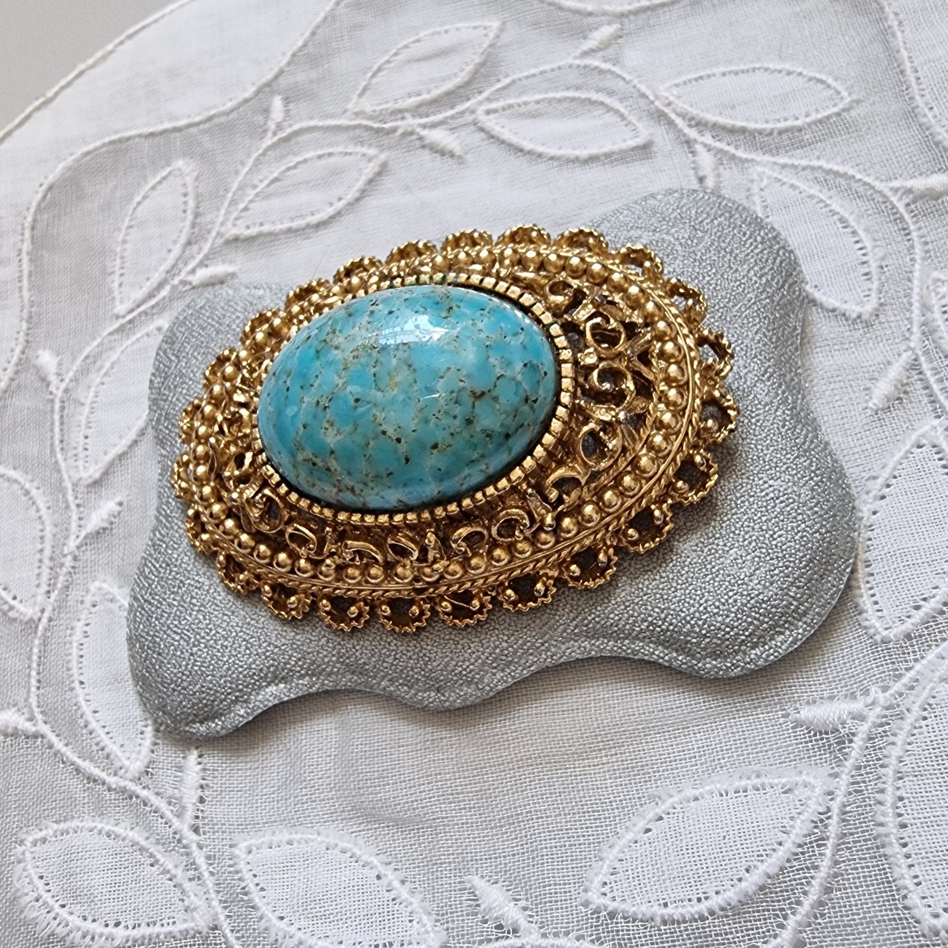 A gorgeous brooch by Sphinx of London with a big turquoise glass cabochon on gold plated metal