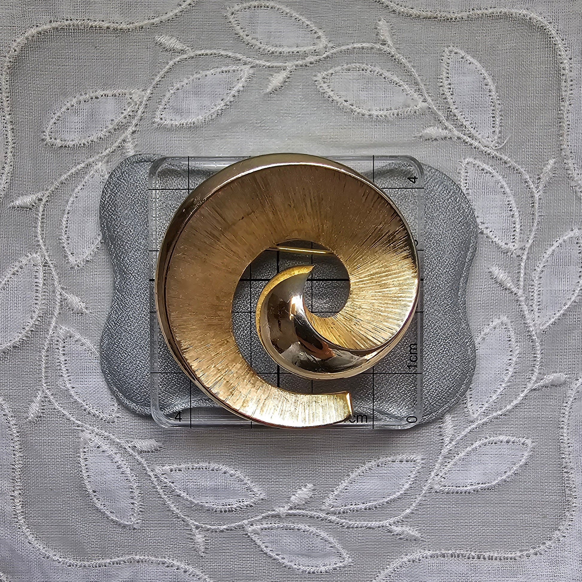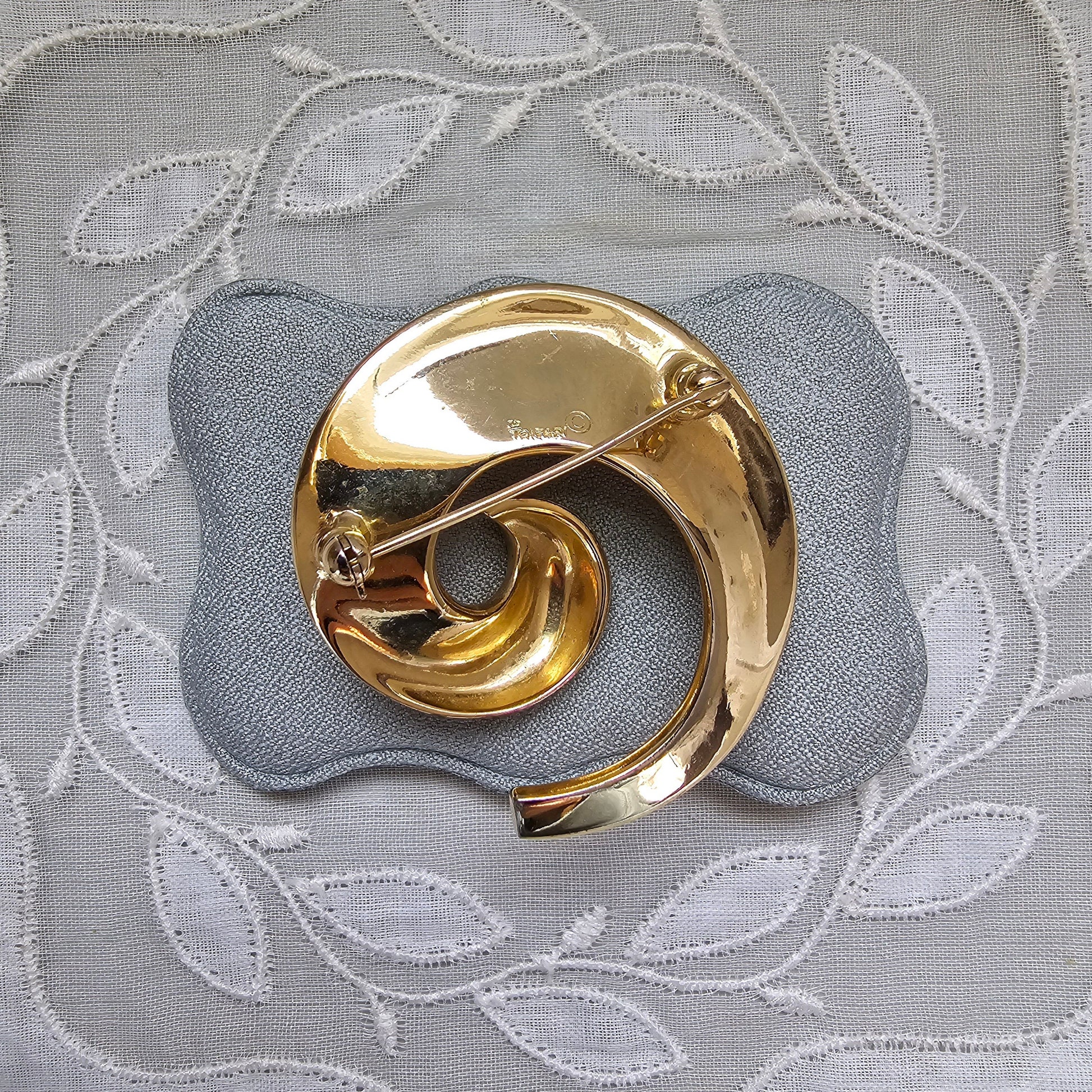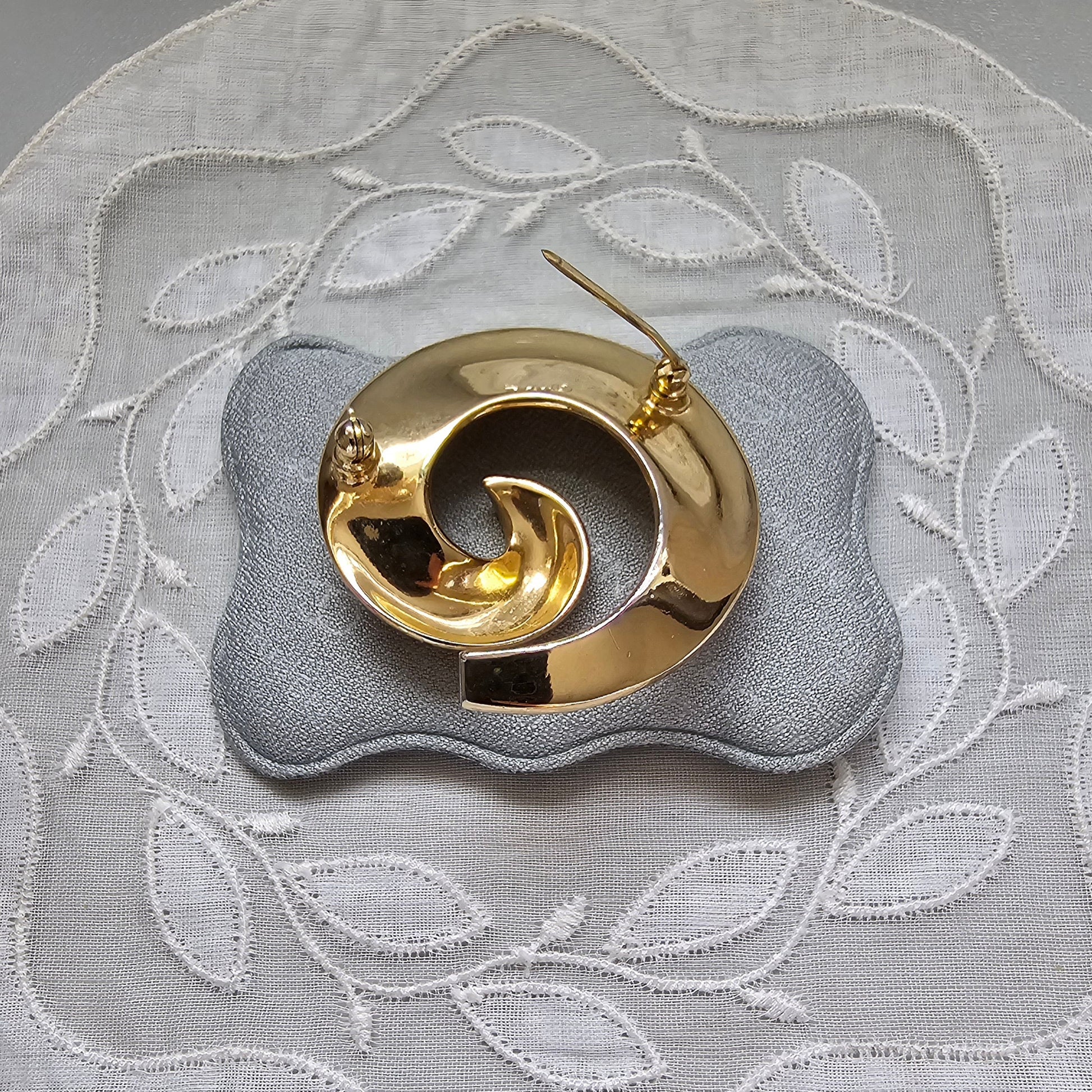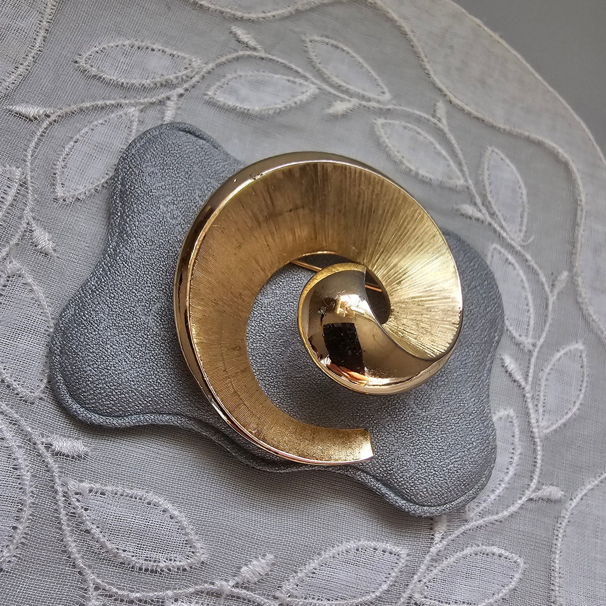 An abstract swirl brooch by Trifari in brushed and polished gold plated metal