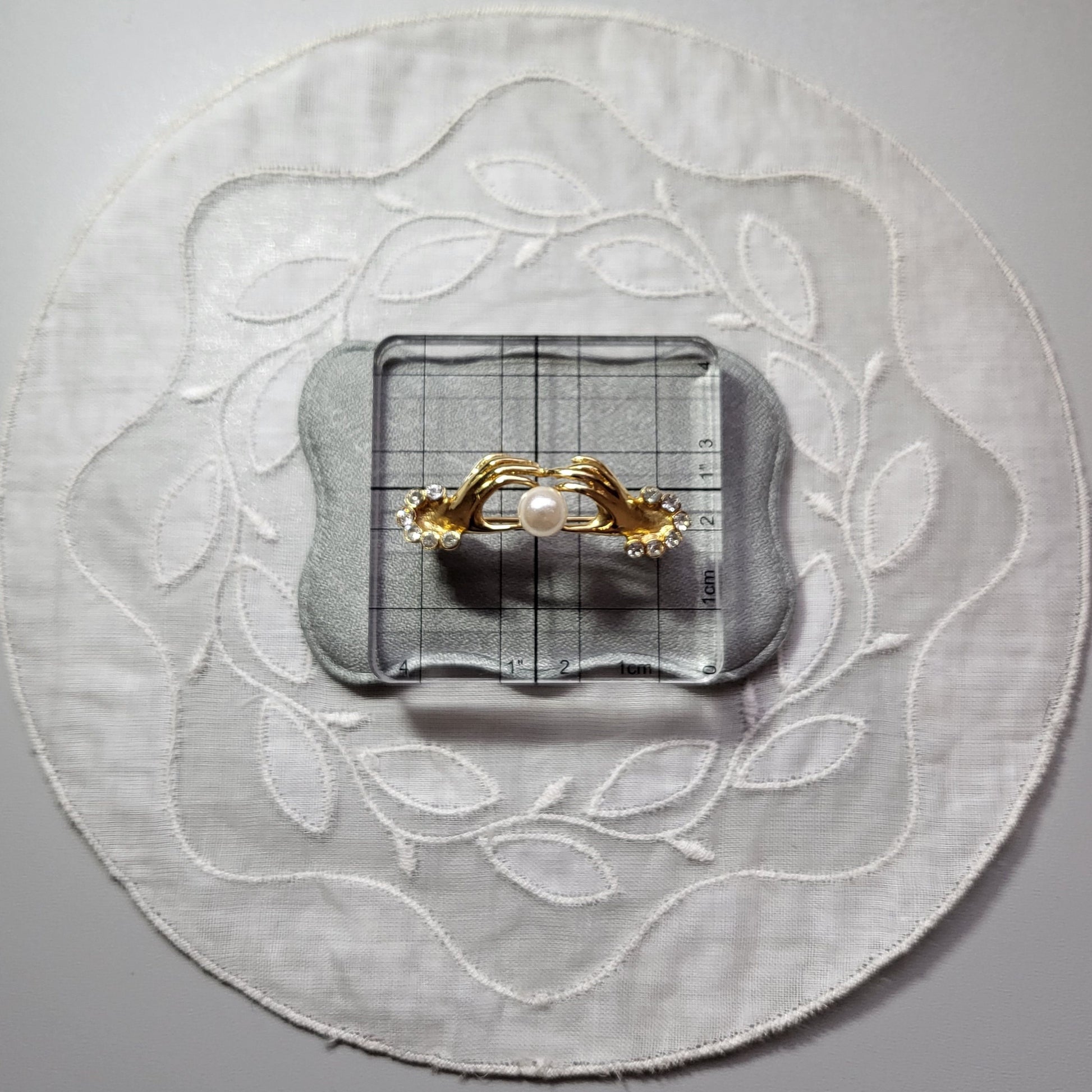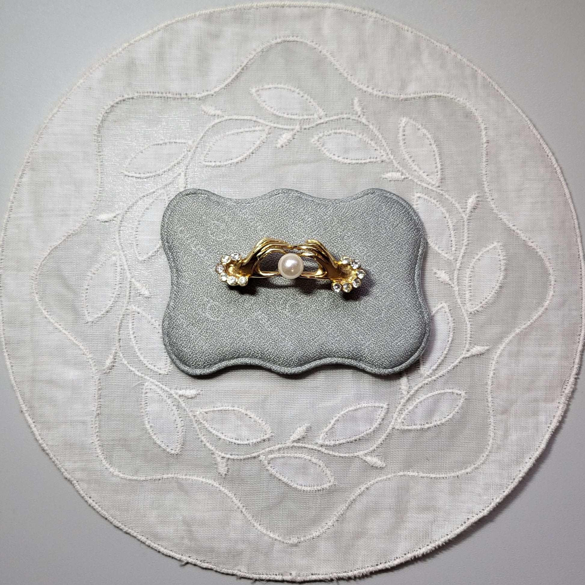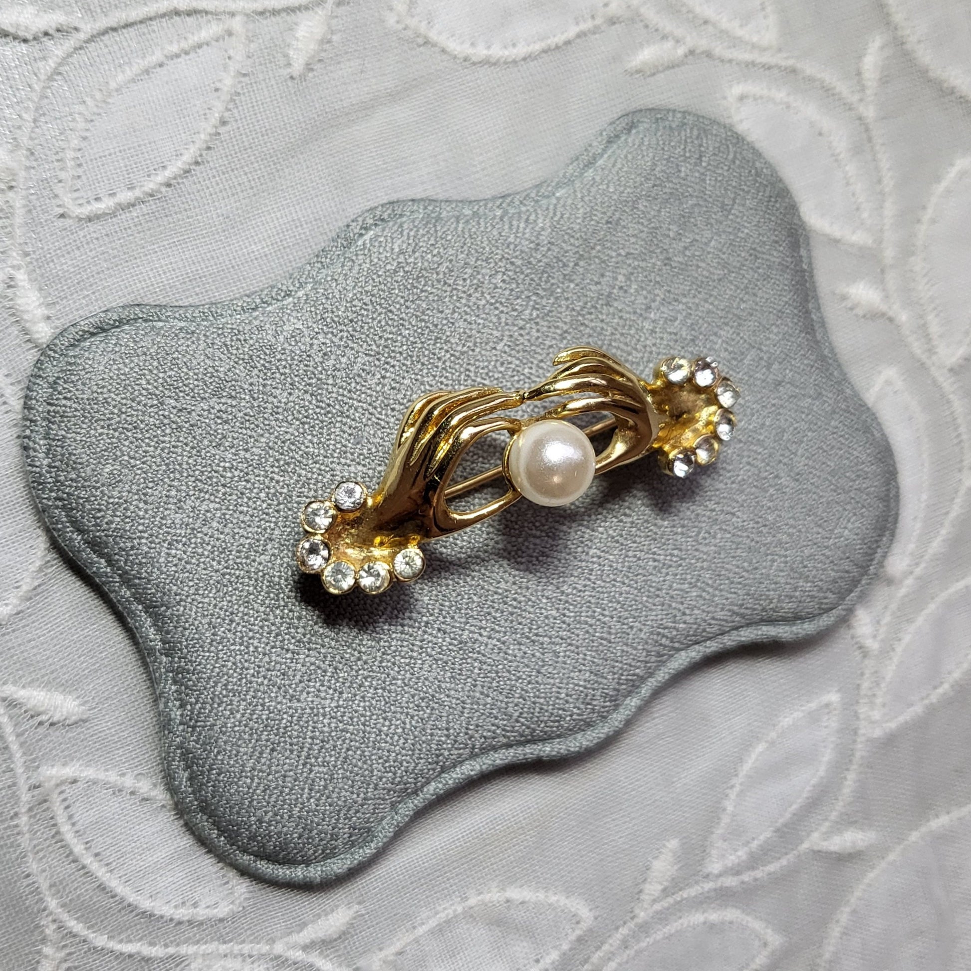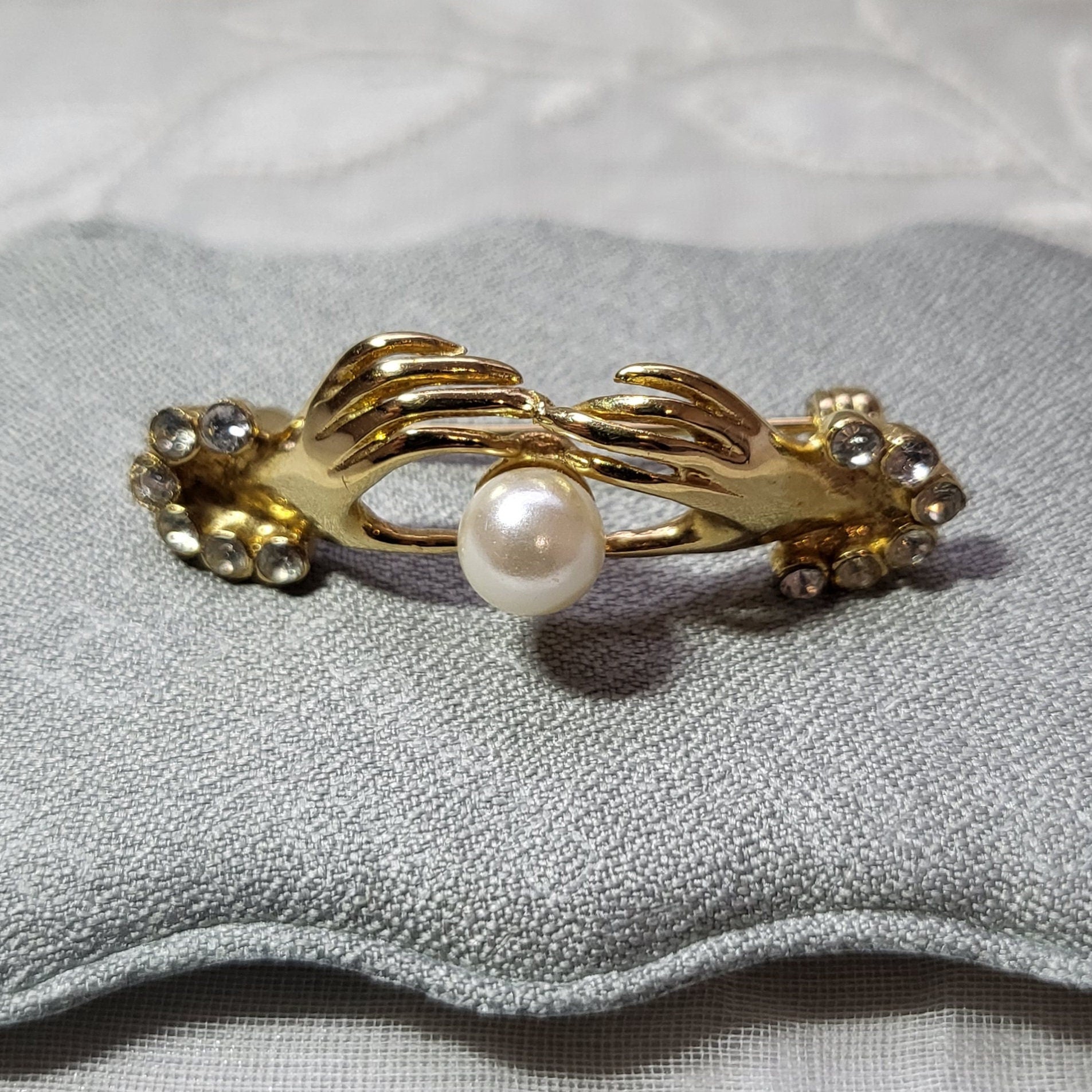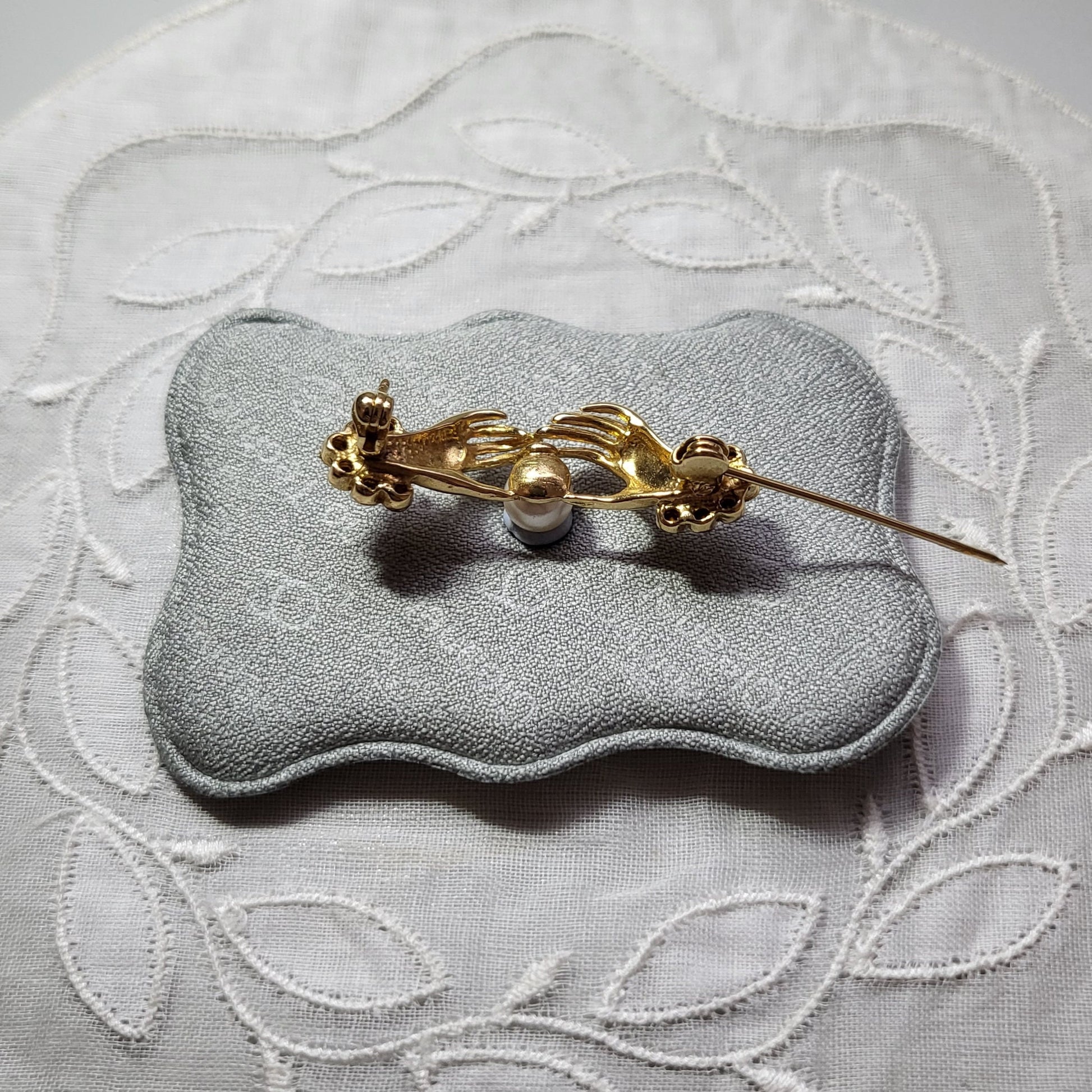 A lovely dainty brooch with two hands holding a faux pearl decorated with clear crystals on gold plated metal