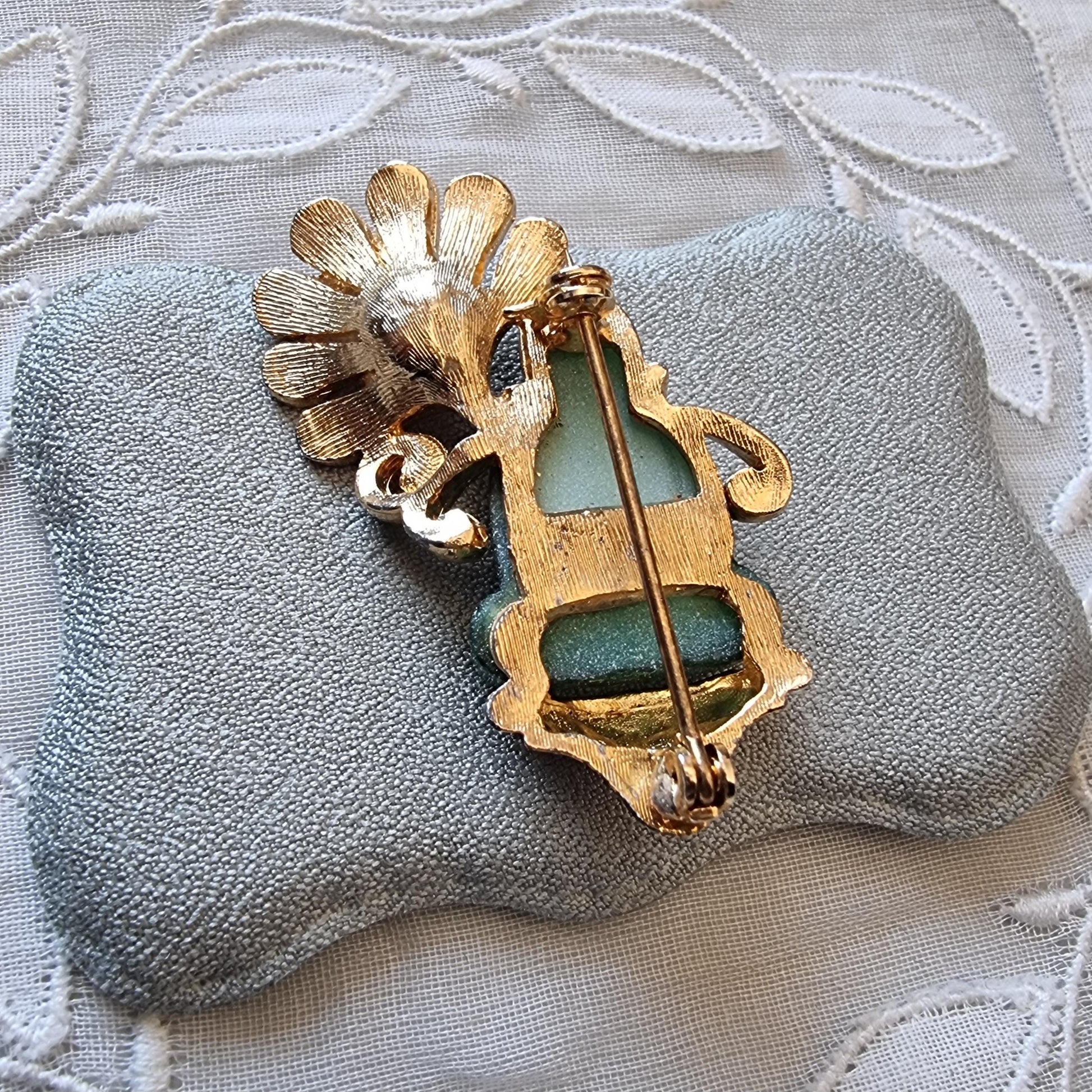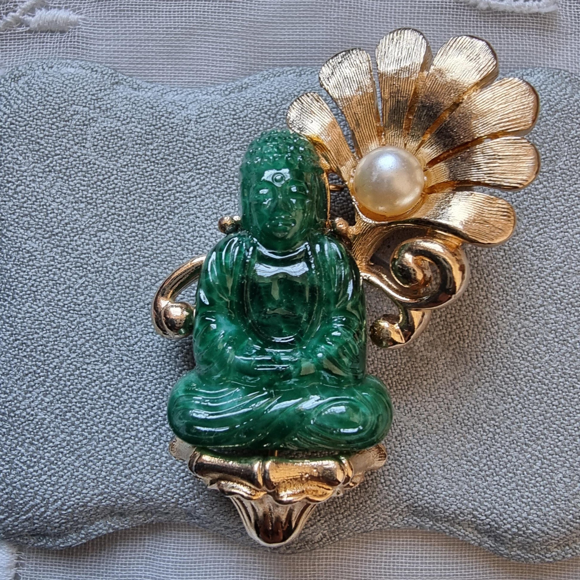 Brooch - Vintage Jade Acrylic Buddha and Pearl Flower Brooch