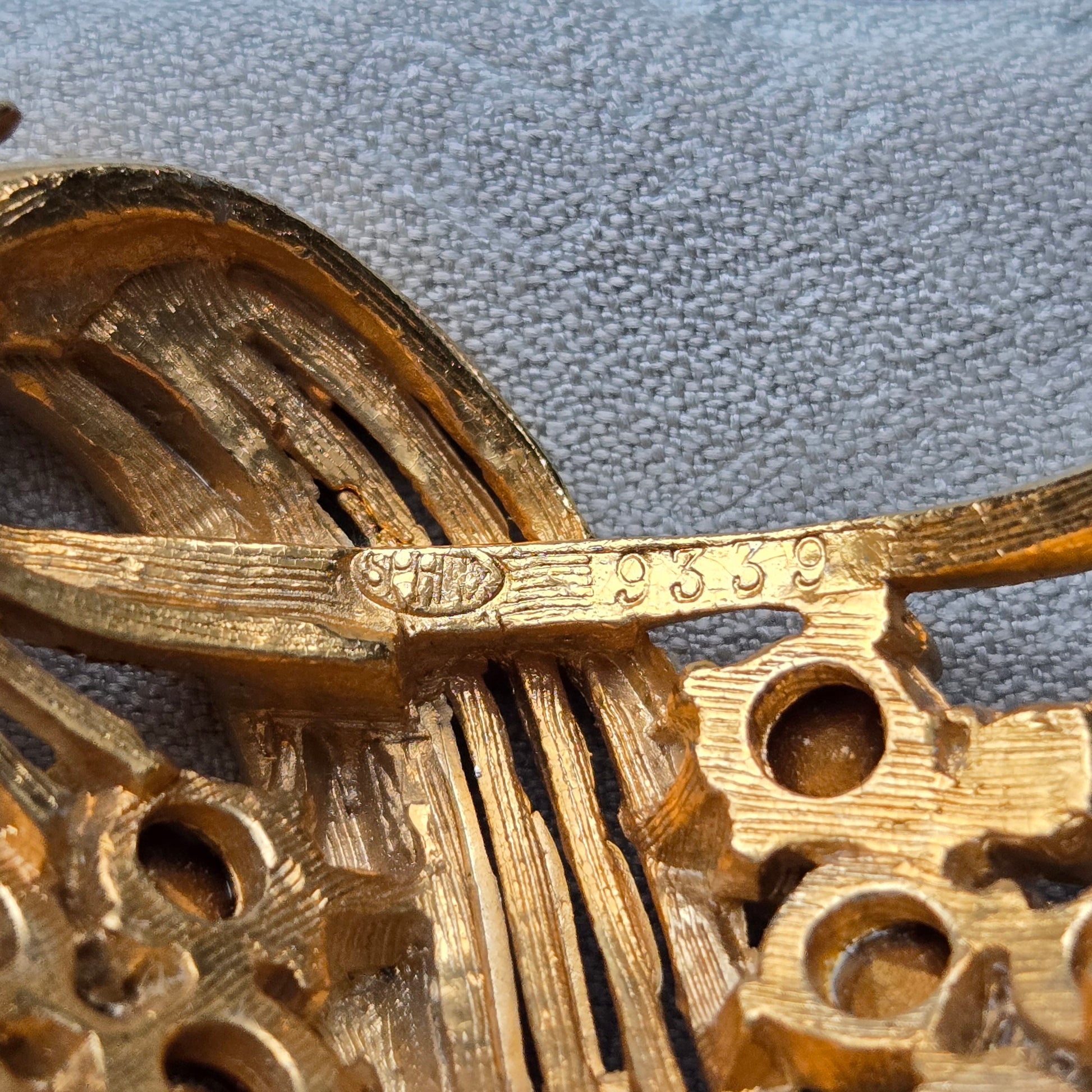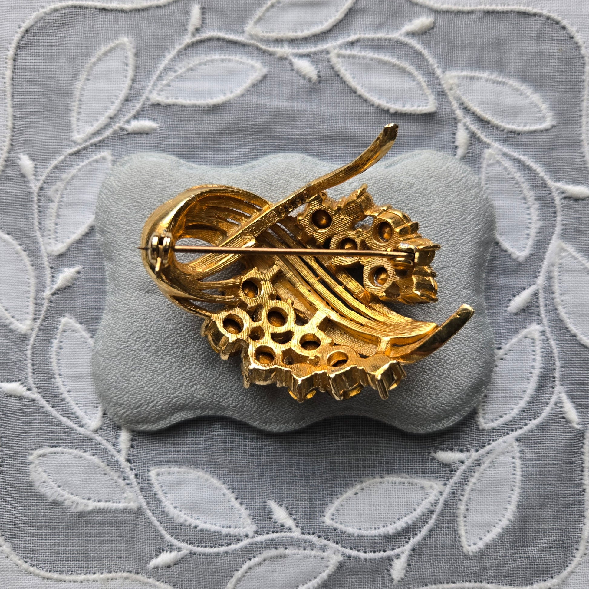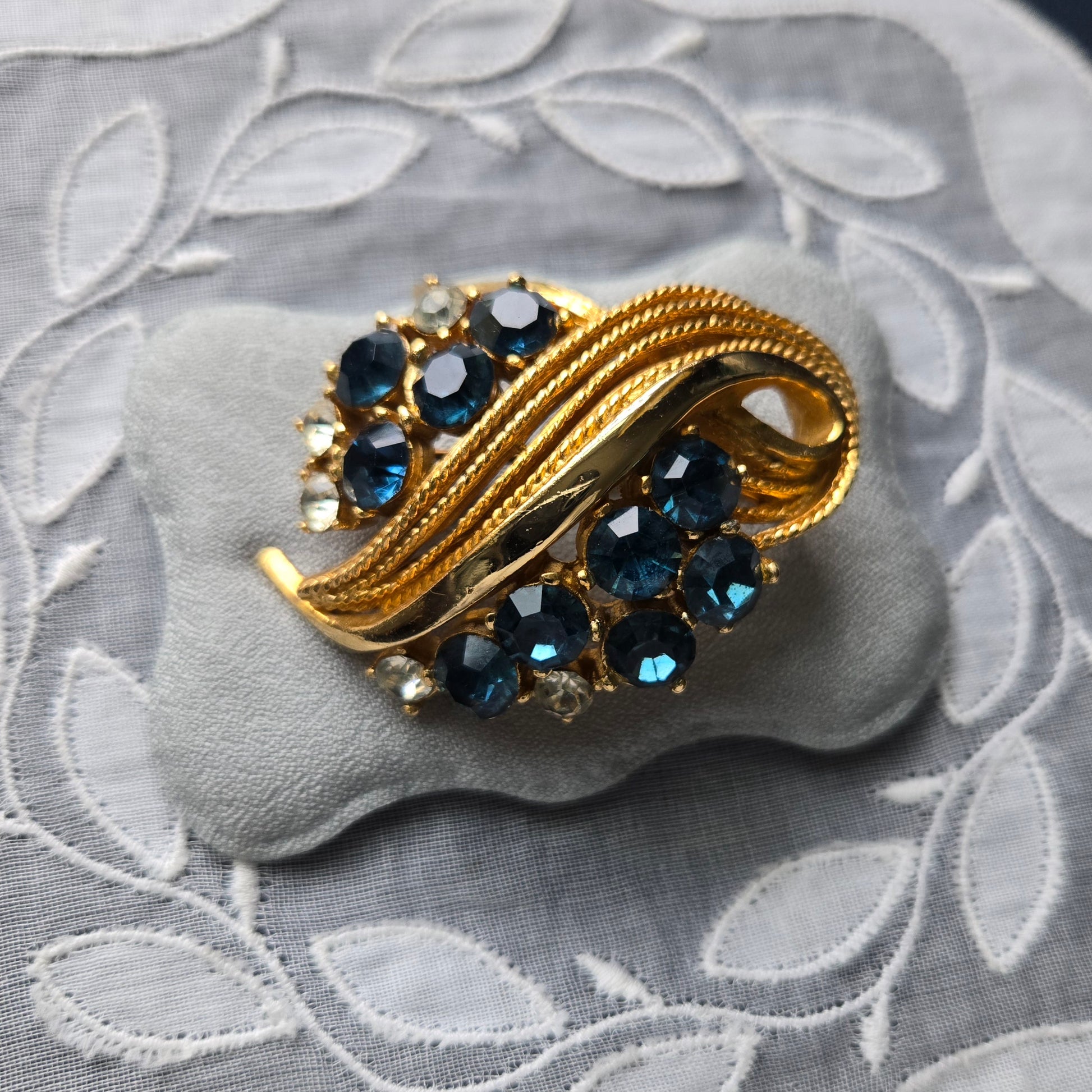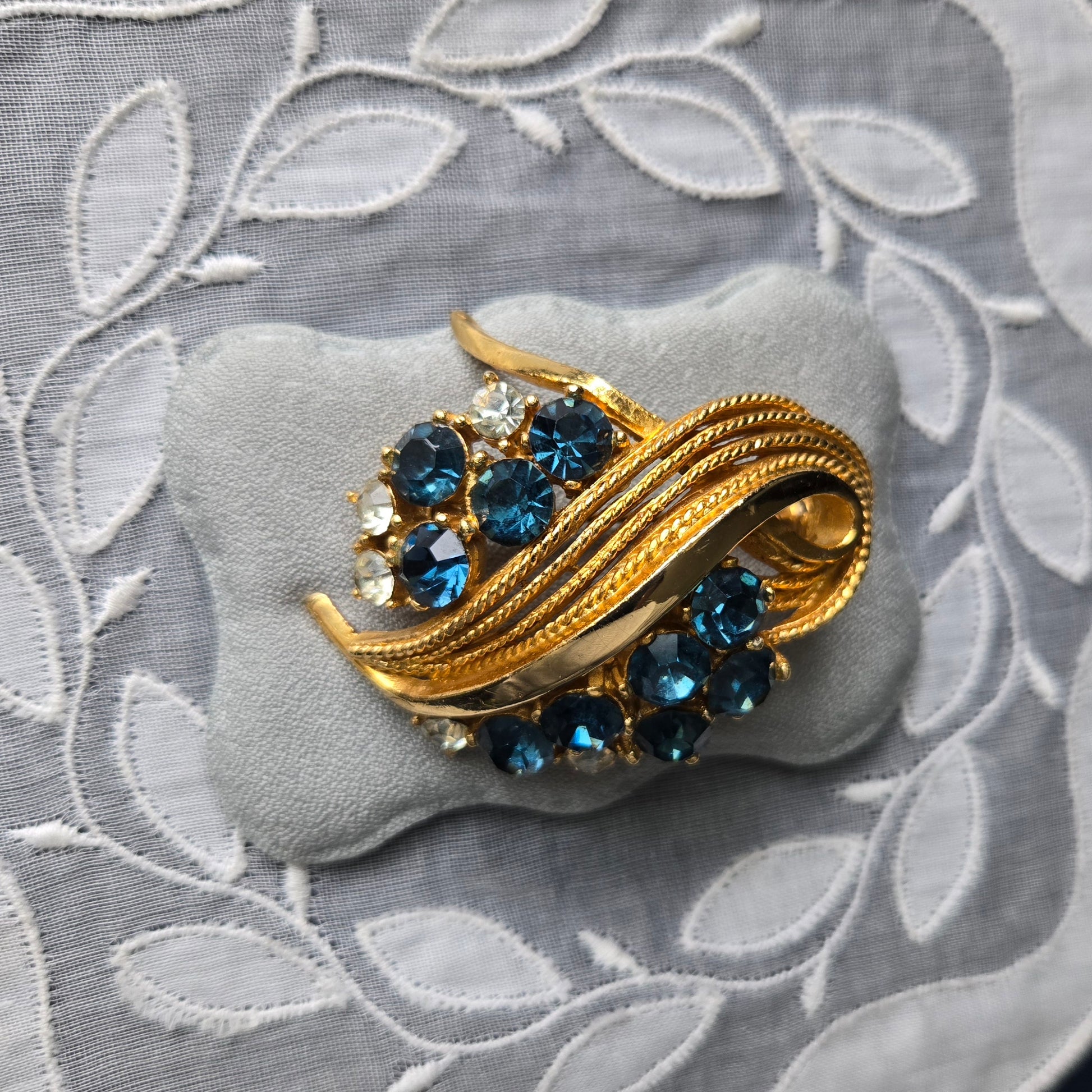 Add a touch of glamorous vintage sparkle with this exquisite signed Sphinx brooch. Crafted in a radiant gold-tone metal, this eye-catching piece features a dynamic, swirling design lavishly adorned with sparkling blue and clear rhinestones. The contrasting colors and intricate setting create a truly captivating effect.